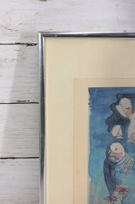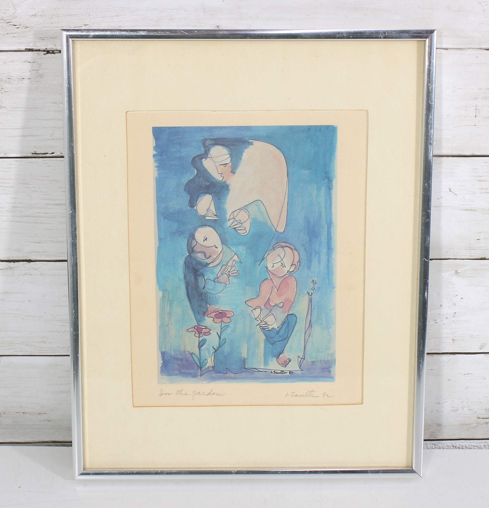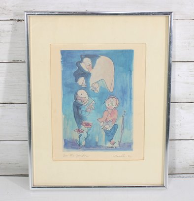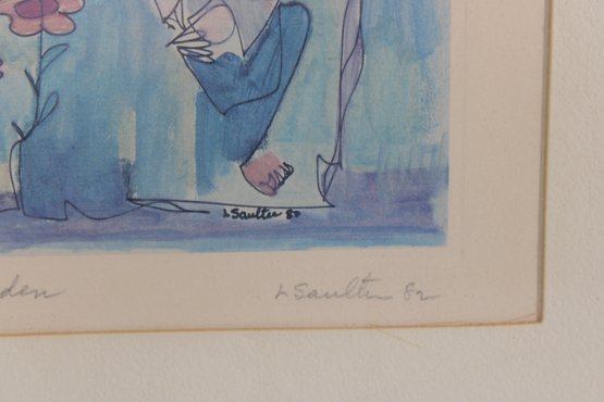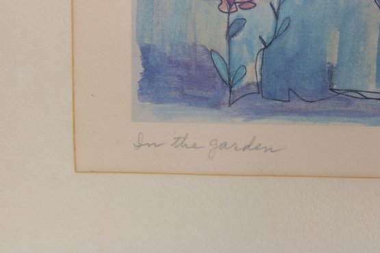 The artwork is pencil signed and dated along the lower margin (appears “L. Santelli ’83,” please verify), and the title “In the Garden” is handwritten beneath the image. The loose linework and gentle washes of color give the piece a light, airy quality typical of modern figurative illustration.