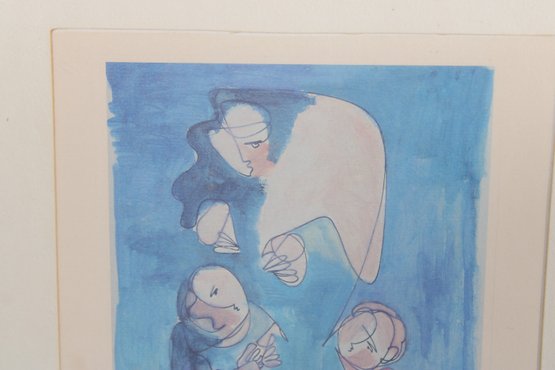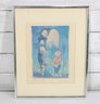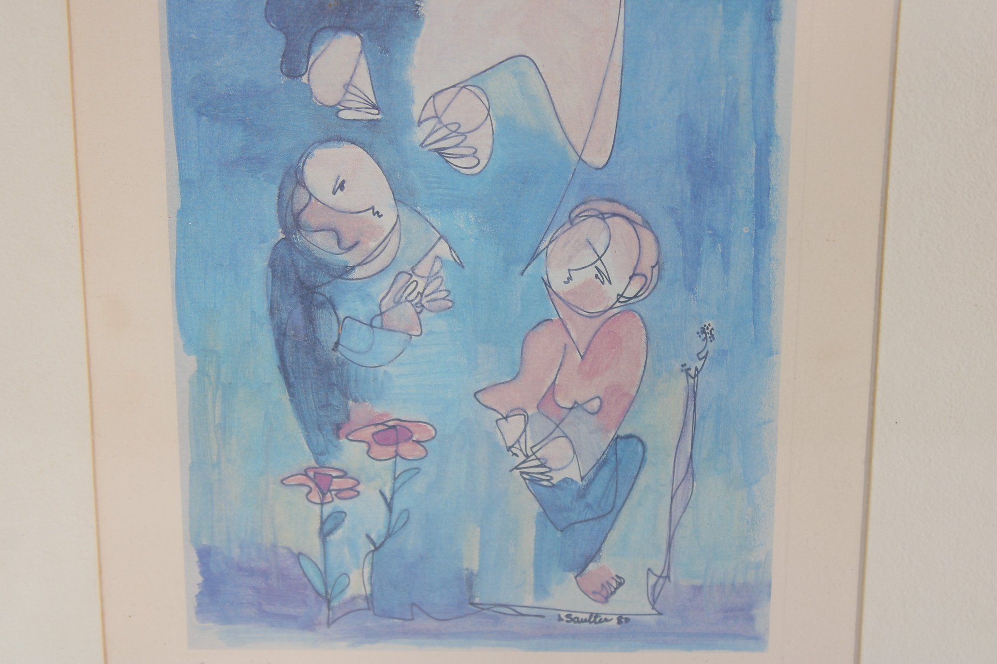A whimsical and expressive figural print titled “In the Garden,” featuring a playful, dreamlike scene rendered in soft blue tones. The composition depicts stylized figures interacting in a garden setting, accompanied by delicate floral elements and a floating, abstract form above—creating a sense of imagination and quiet storytelling.