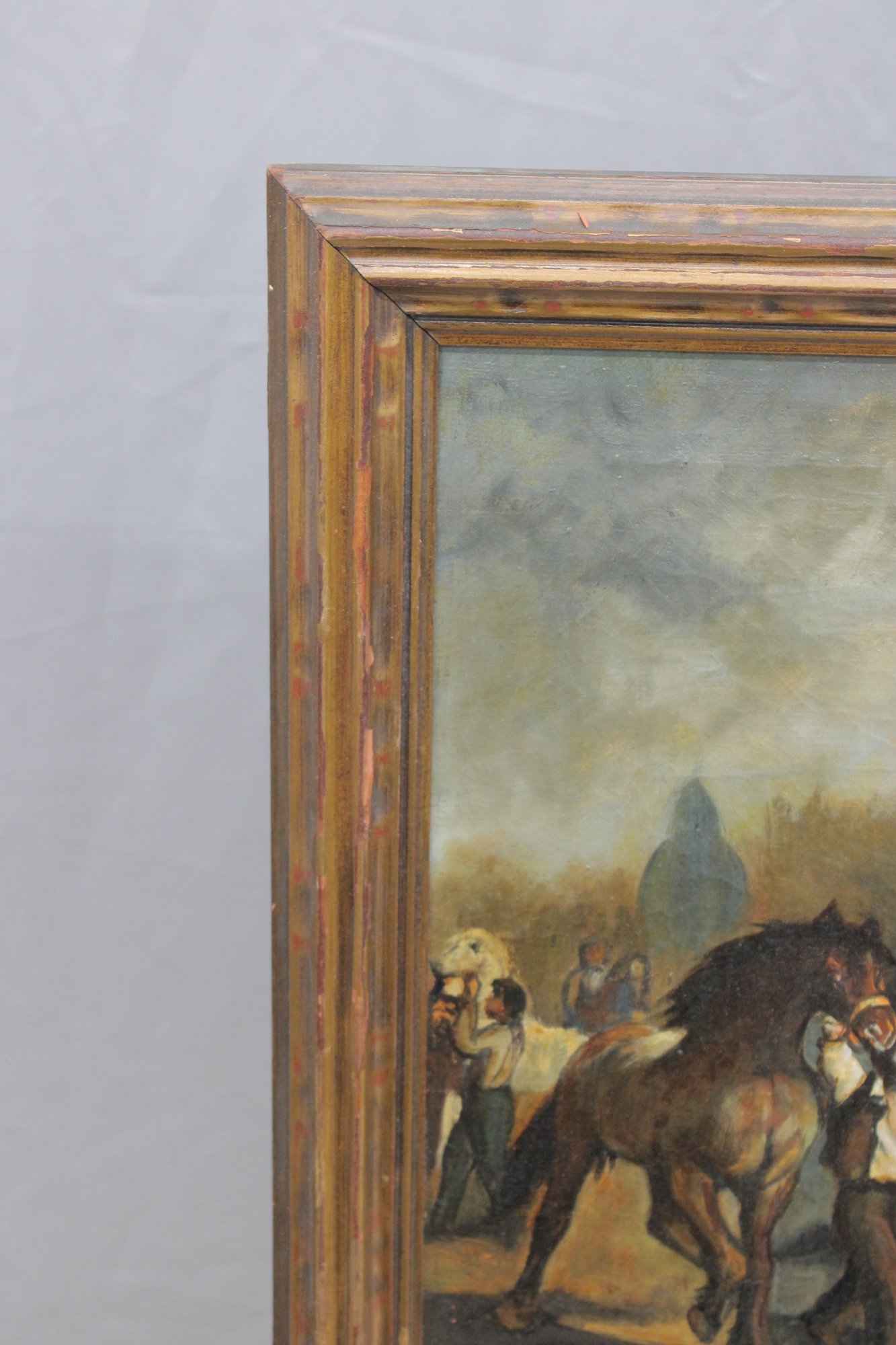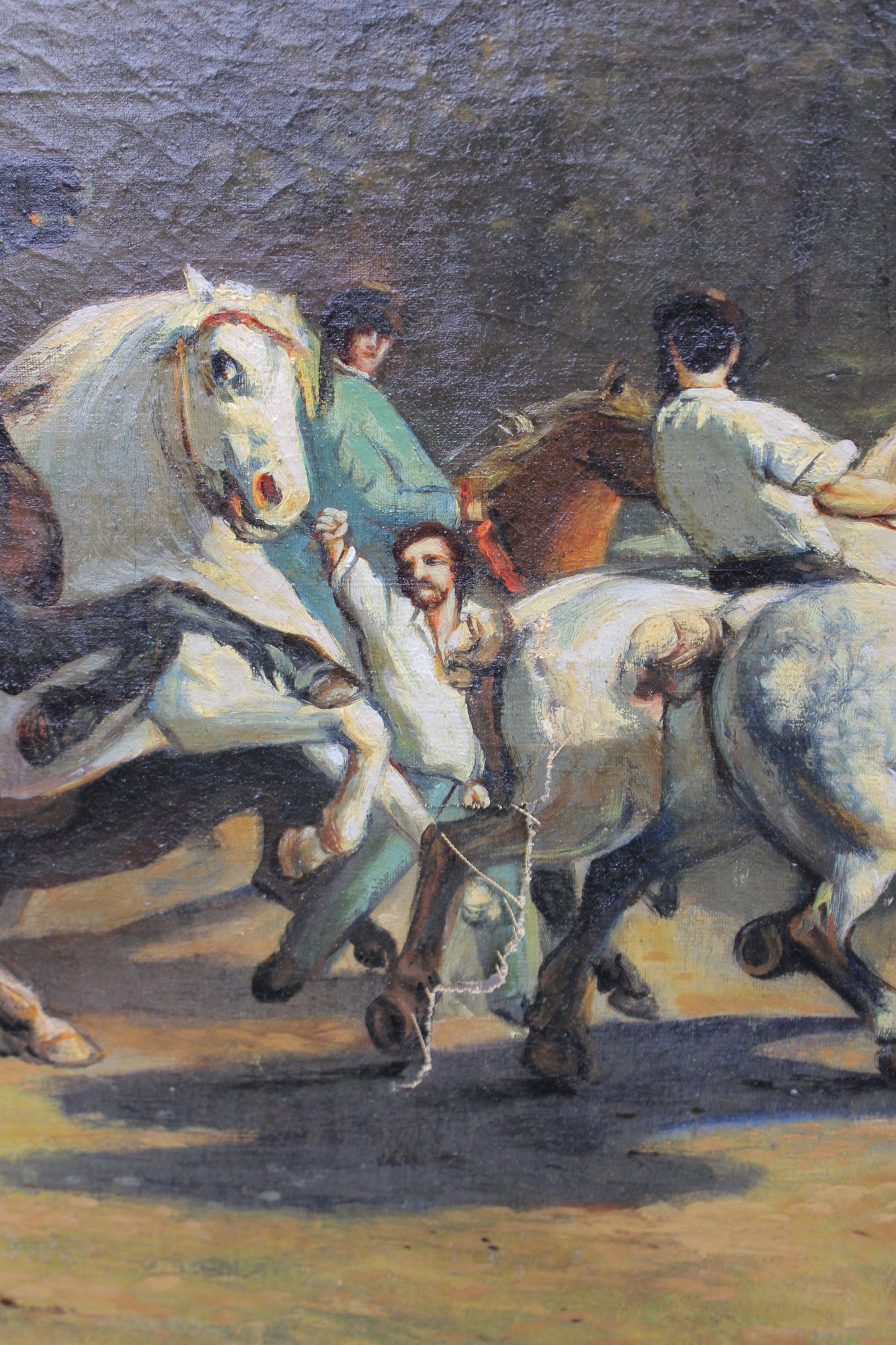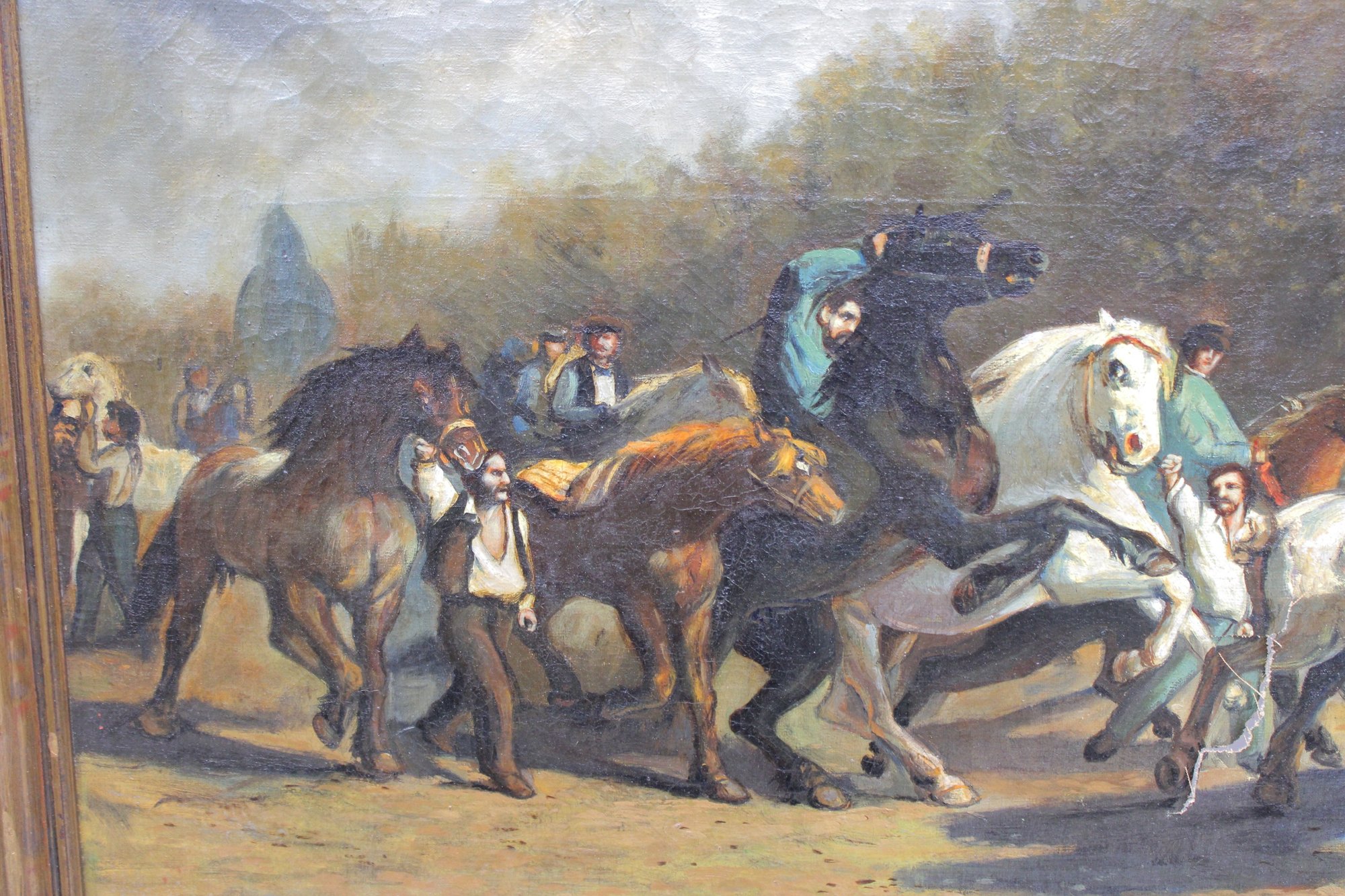 This signed oil on canvas painting titled “The Horse Fair” depicts a lively and animated equestrian market scene, with riders, handlers, and horses gathered in energetic motion. The composition captures the controlled chaos of a horse fair, with rearing and straining animals rendered through expressive brushwork and strong anatomical detail.