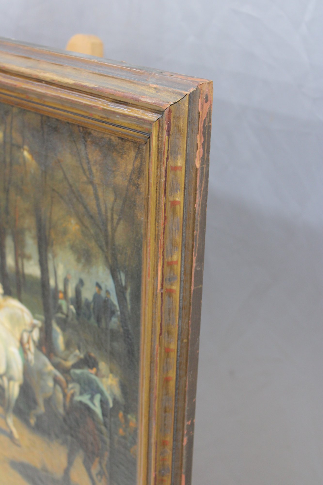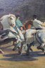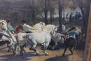 The artist skillfully conveys movement and tension, particularly in the powerful horses at the center of the composition, while background figures and landscape elements provide depth and narrative context. The warm, earthy palette enhances the sense of activity and atmosphere, making this a visually engaging and decorative sporting work.