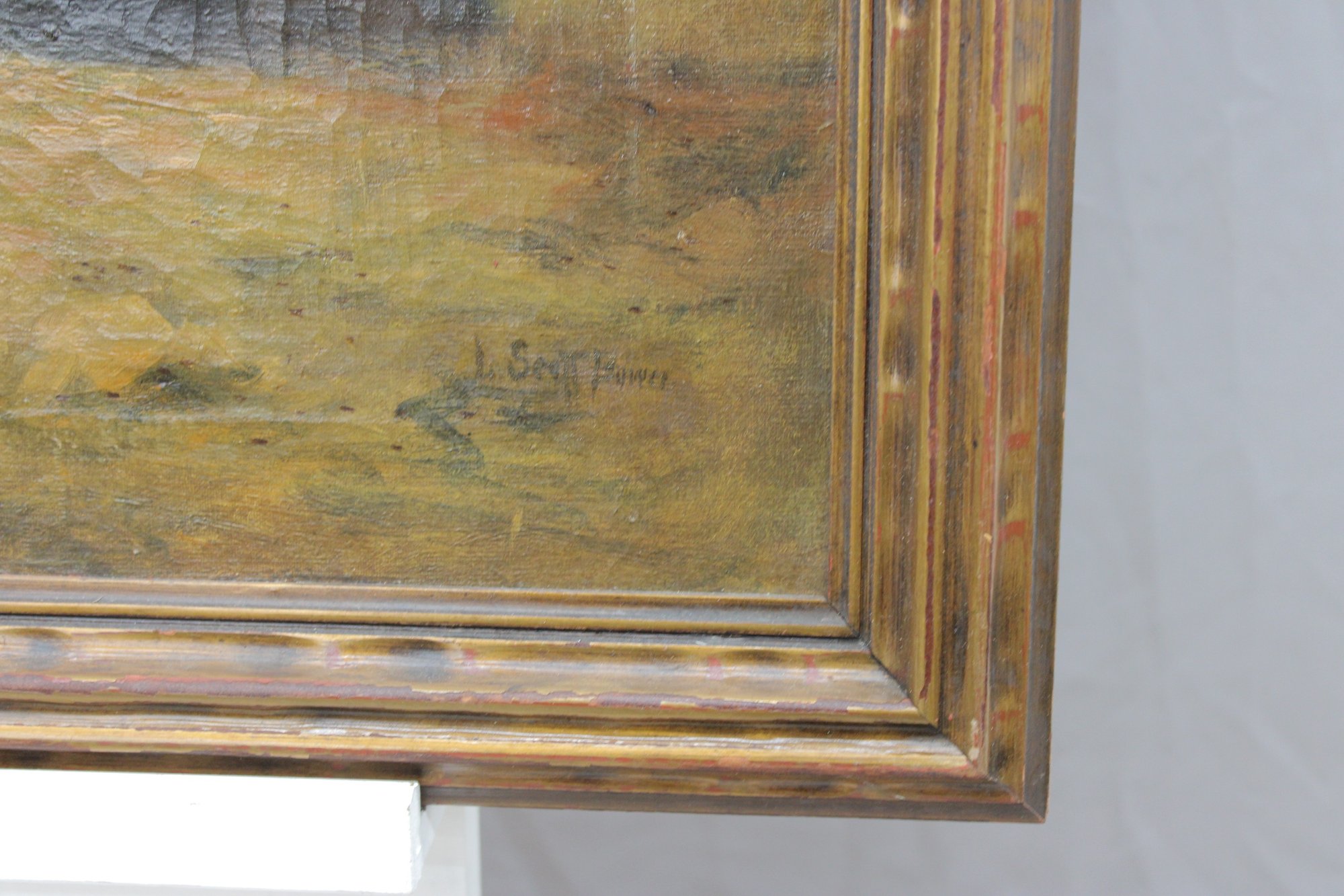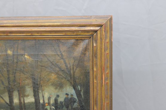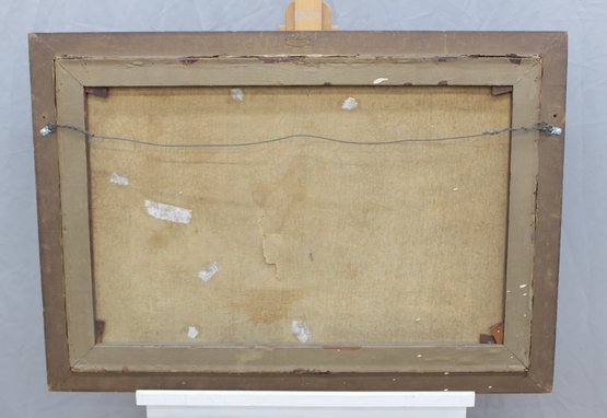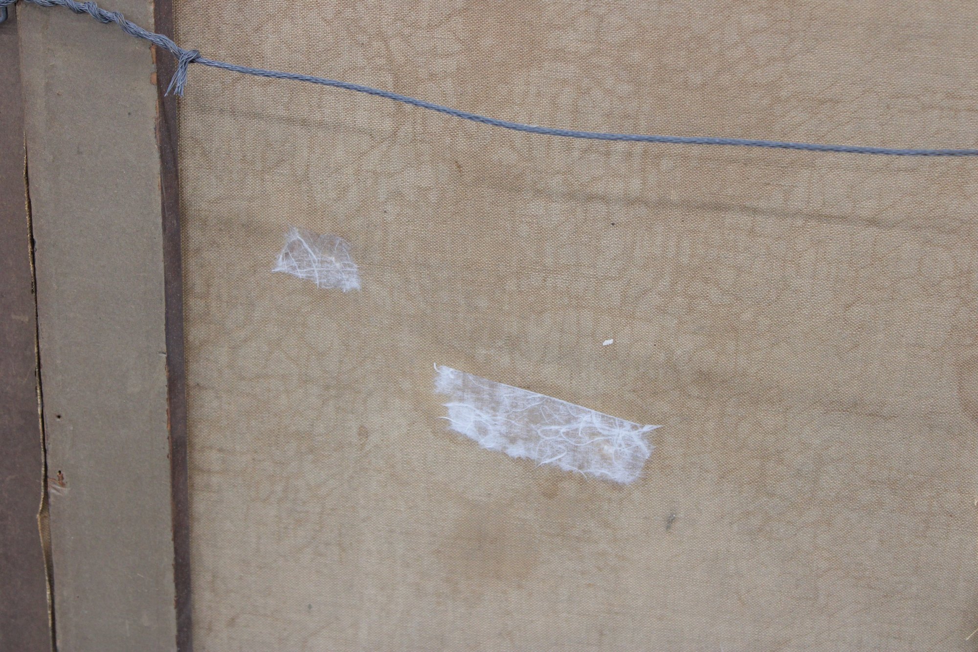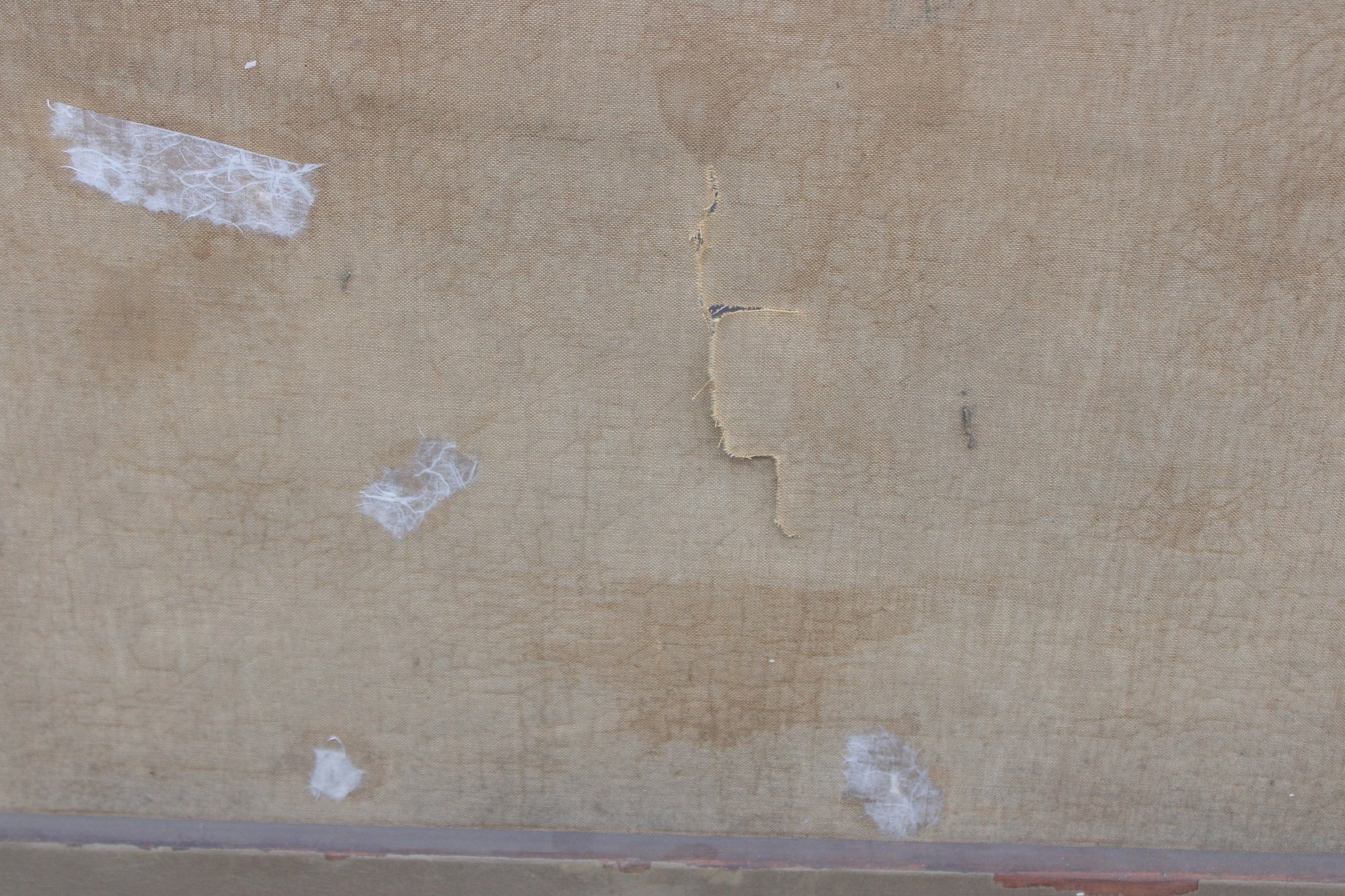 The canvas has a visible rip that has been repaired, evident from the reverse and subtly perceptible on the painted surface. This condition issue is clearly shown in the provided photographs and has been considered in the presentation. Additional age-related wear and surface texture are consistent with traditional oil paintings.