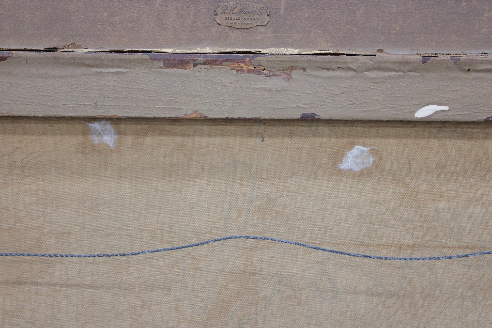 The painting is presented in a period-style frame and retains a New York framer’s label on the reverse (R. H. Moore Co., Herald Square, New York), adding historical interest.