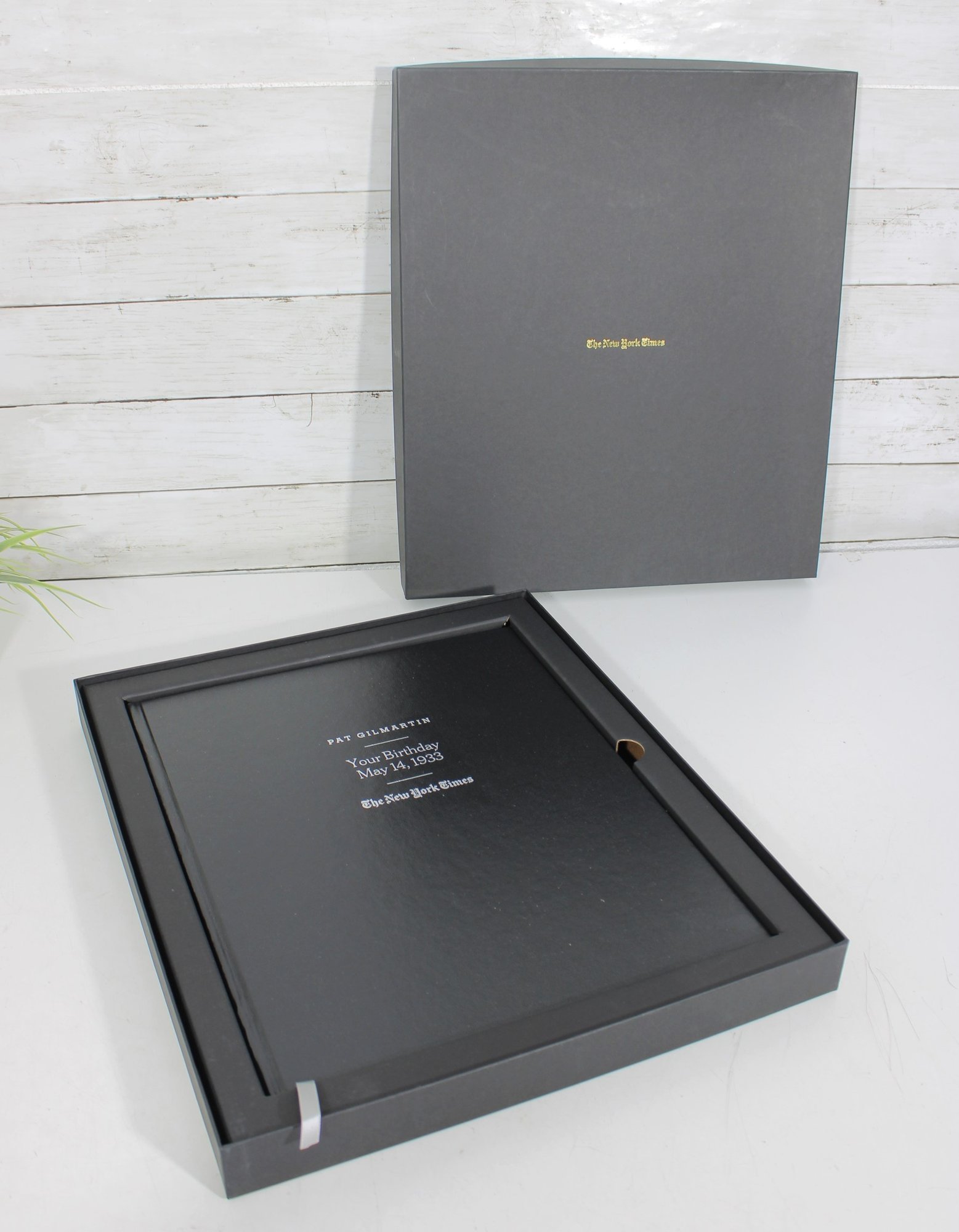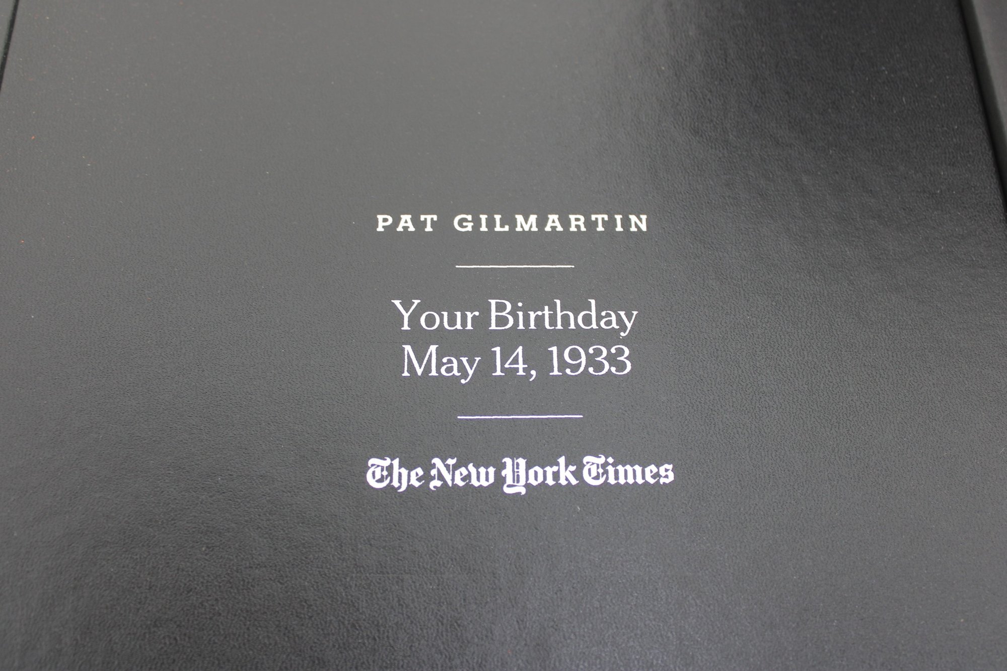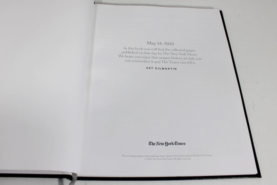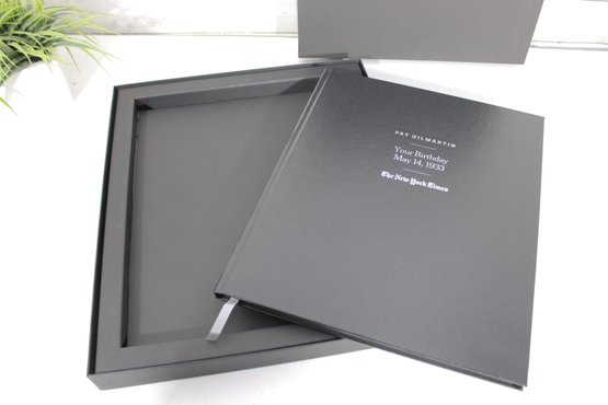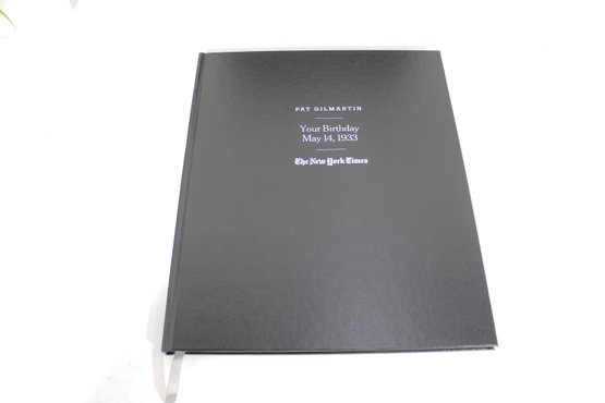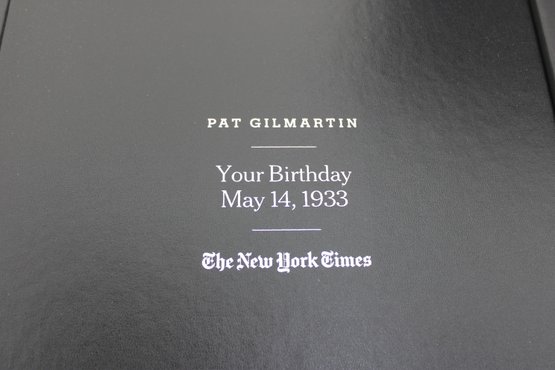 custom-bound edition from The New York Times featuring a curated collection of front pages and articles commemorating a specific birth date: May 14, 1933. This personalized volume is titled with the name “Pat Gilmartin” and presented in a high-quality black hardcover with matching presentation box.