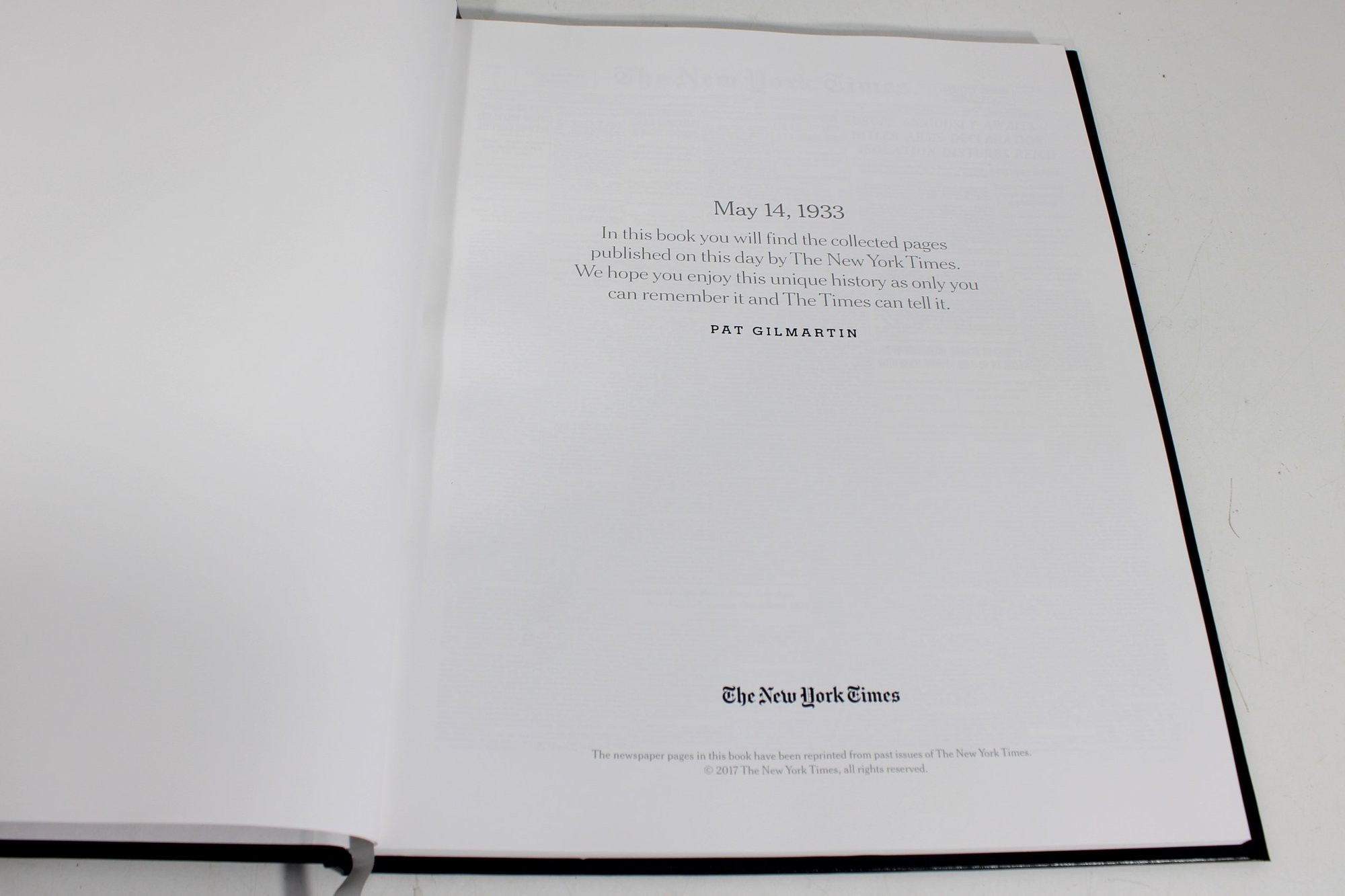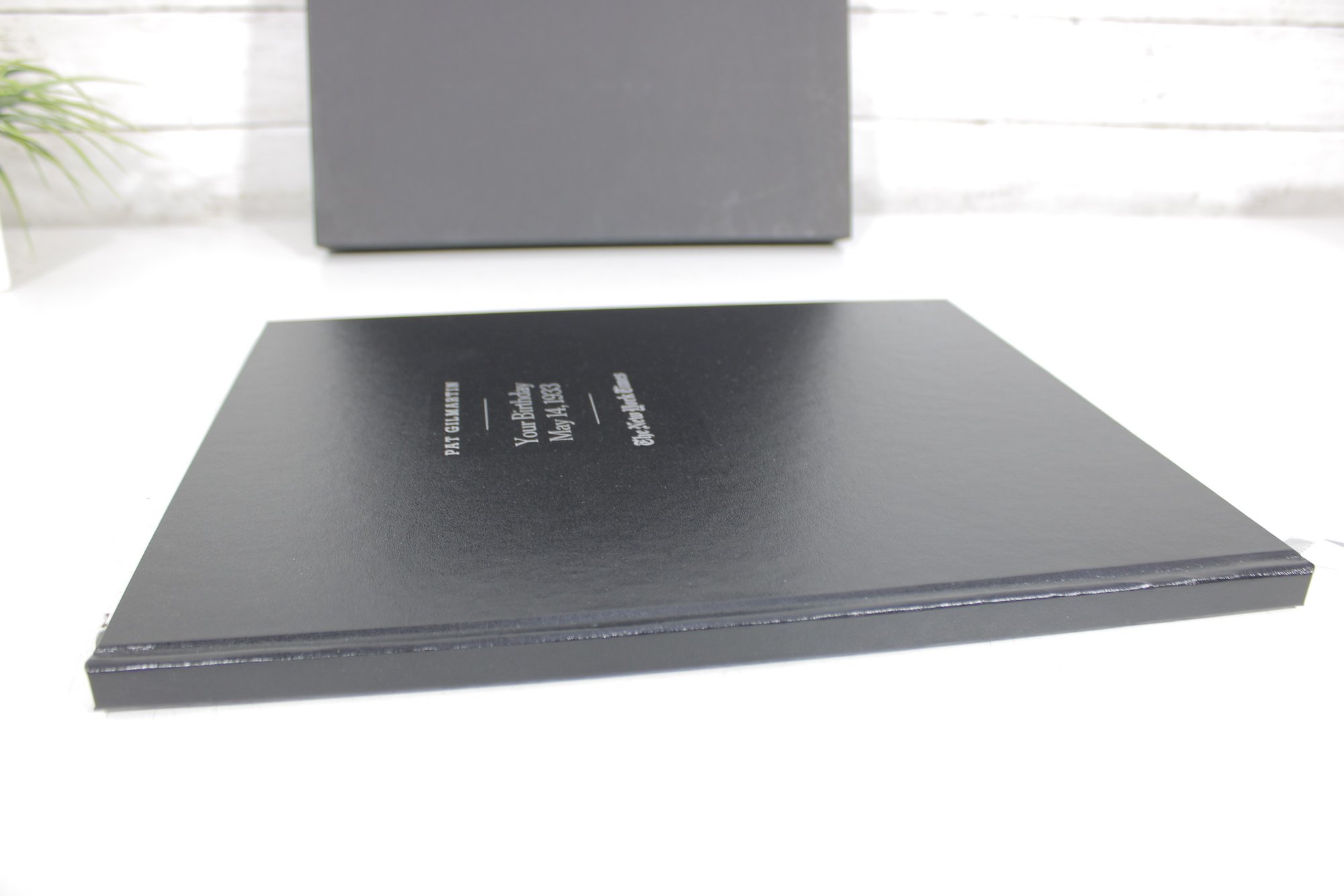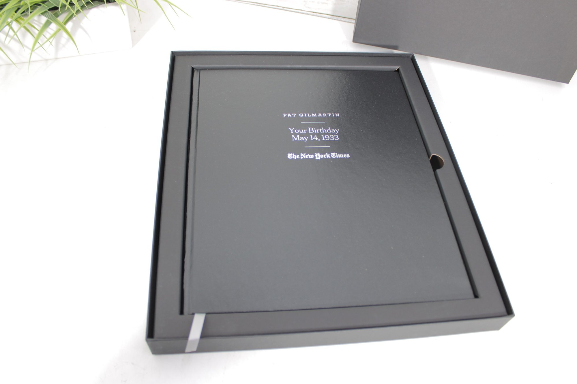 custom-bound edition from The New York Times featuring a curated collection of front pages and articles commemorating a specific birth date: May 14, 1933. This personalized volume is titled with the name “Pat Gilmartin” and presented in a high-quality black hardcover with matching presentation box.