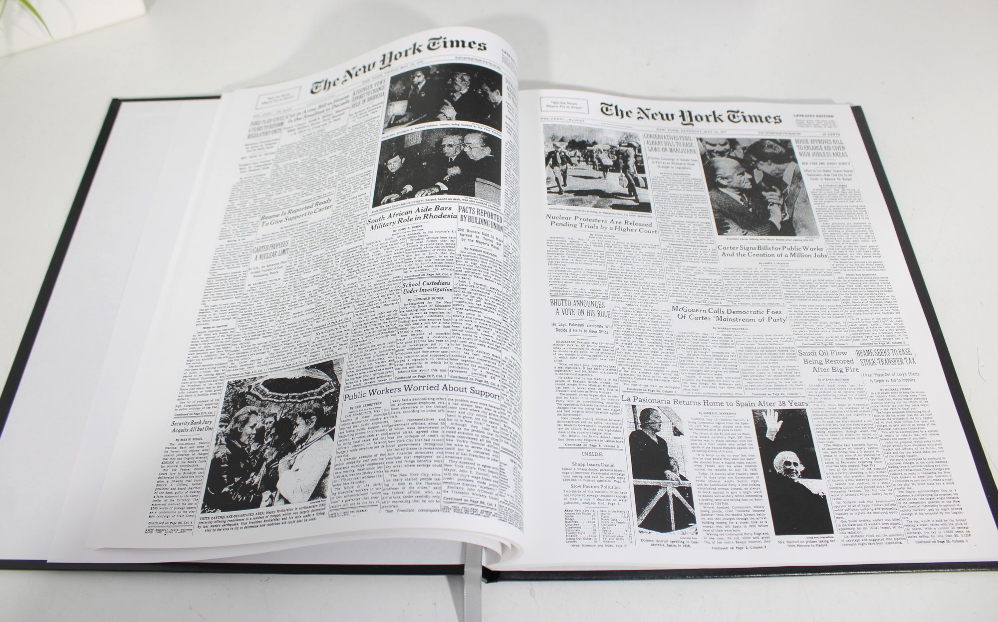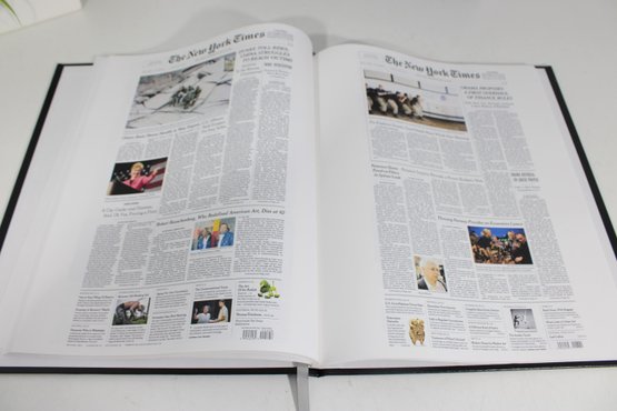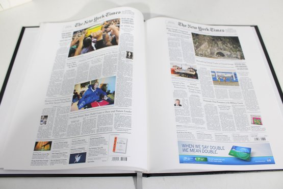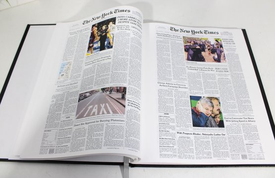 Inside, the book includes reproduced newspaper pages highlighting historic events, headlines, and images spanning decades, offering a fascinating glimpse into world history through the lens of The New York Times.