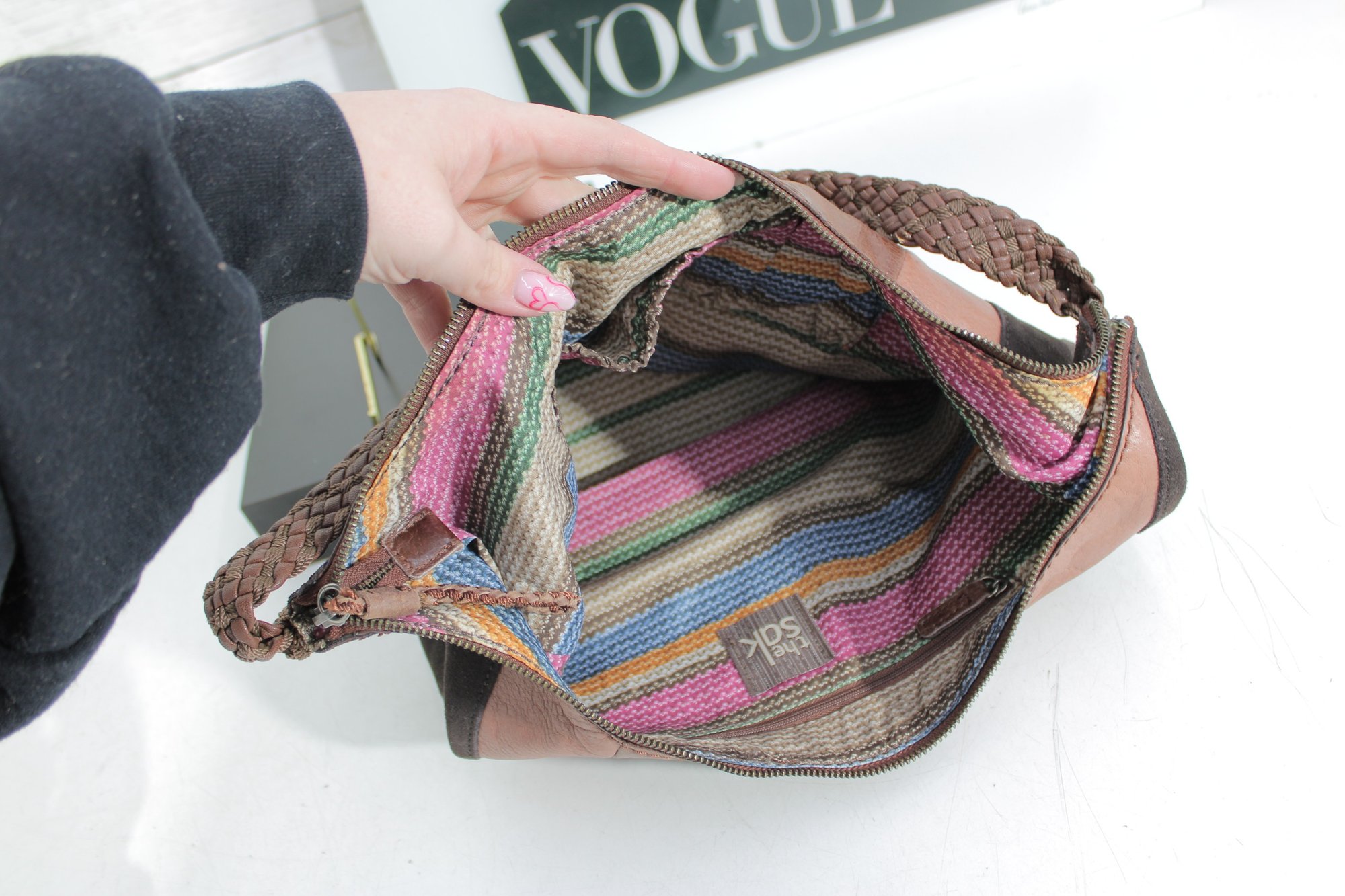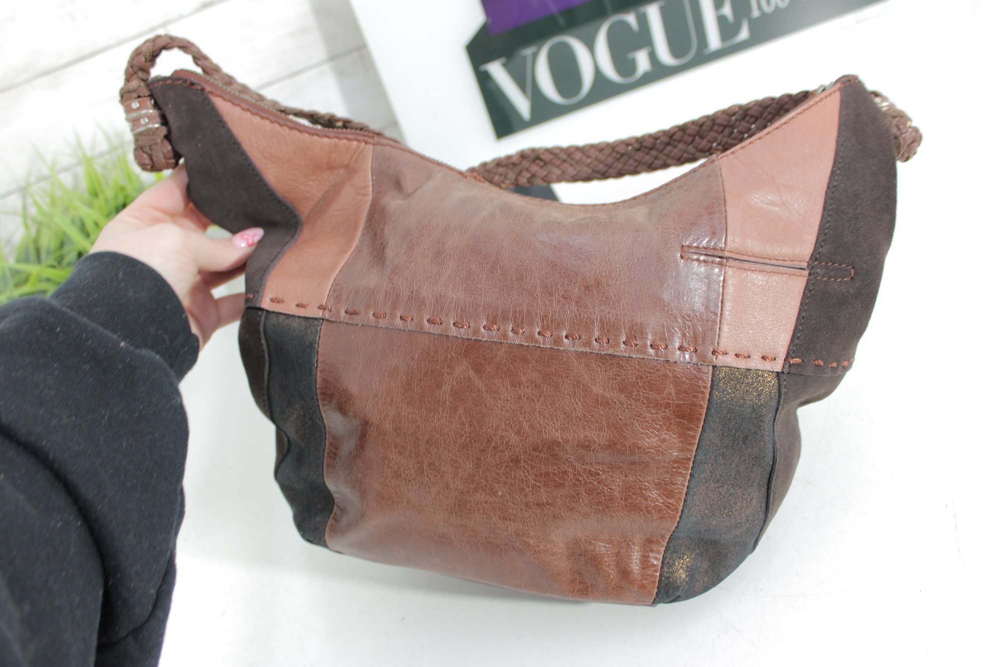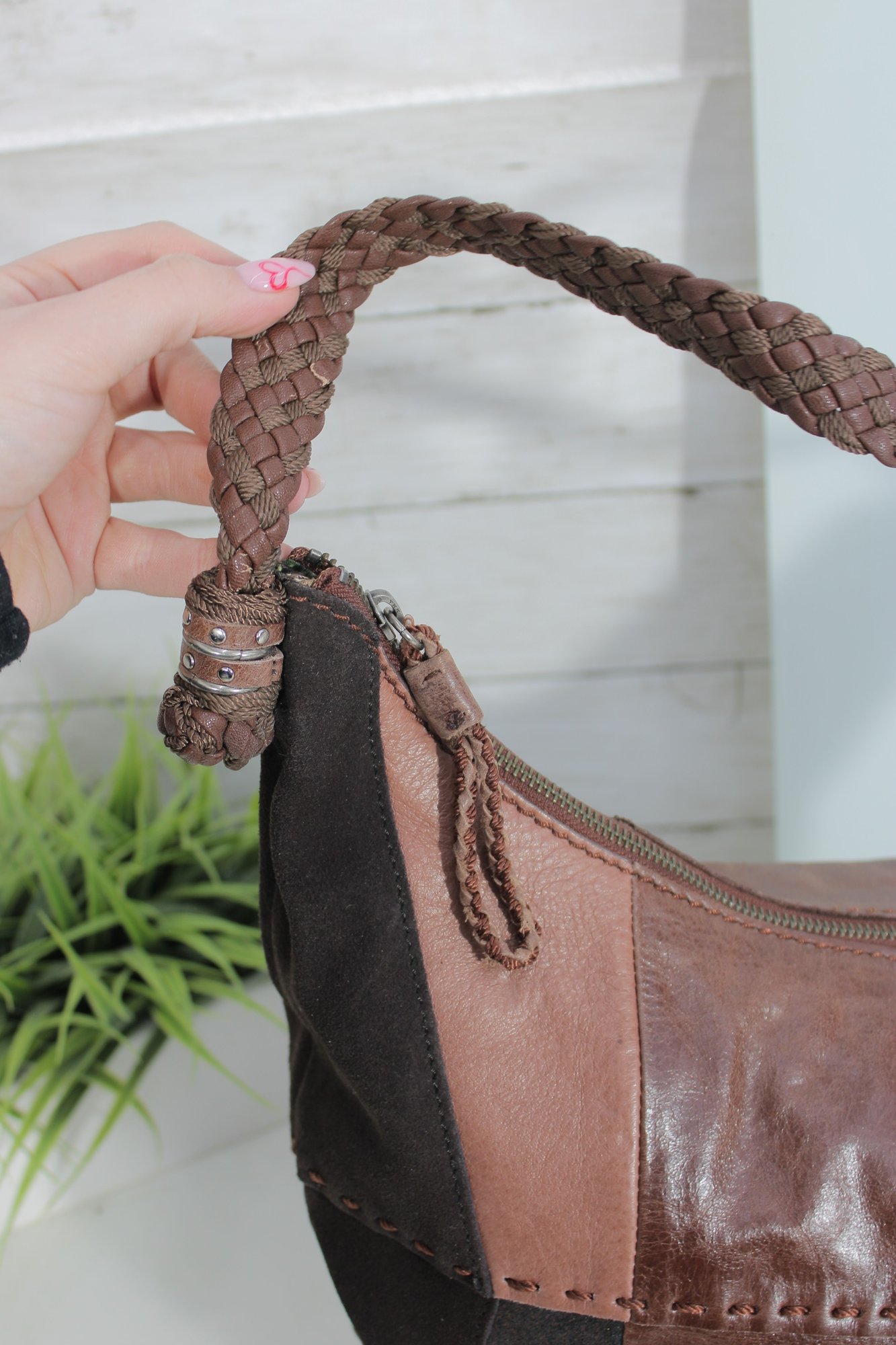 Stylish and relaxed The Sak hobo shoulder bag featuring a unique multi-tone patchwork leather design in warm brown shades. The soft, slouchy silhouette is complemented by a distinctive braided shoulder strap, giving this bag a casual boho-inspired look perfect for everyday wear.