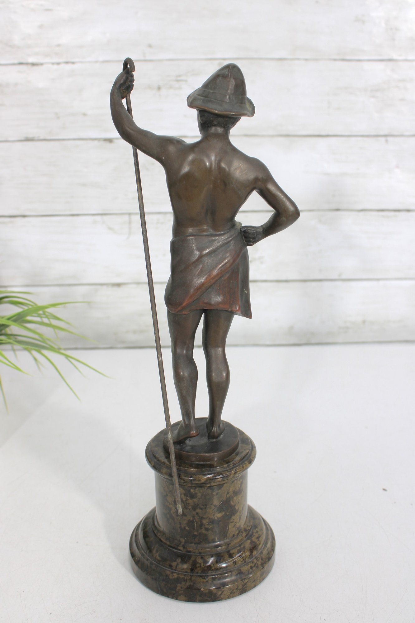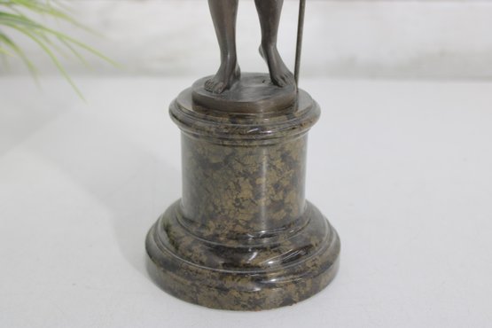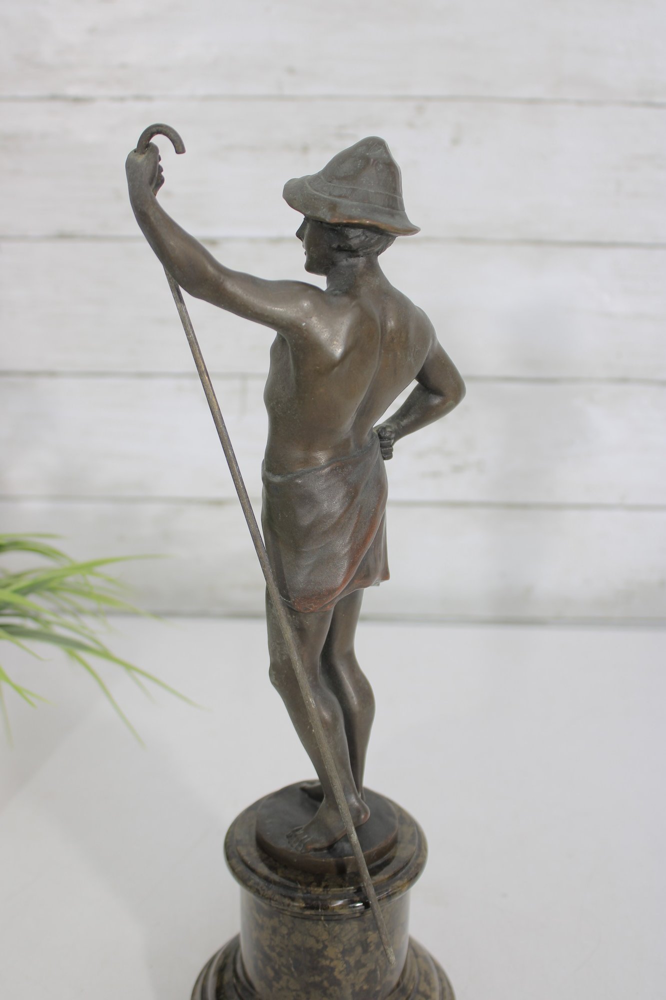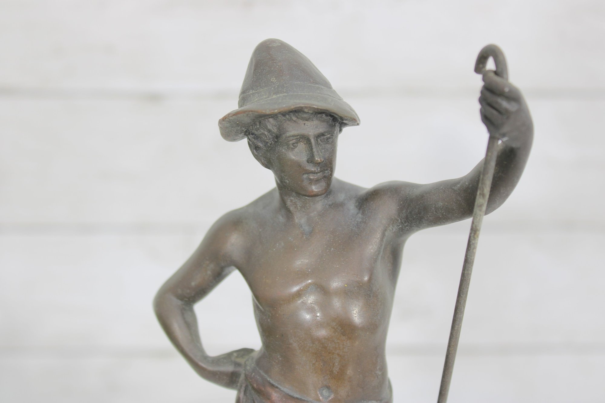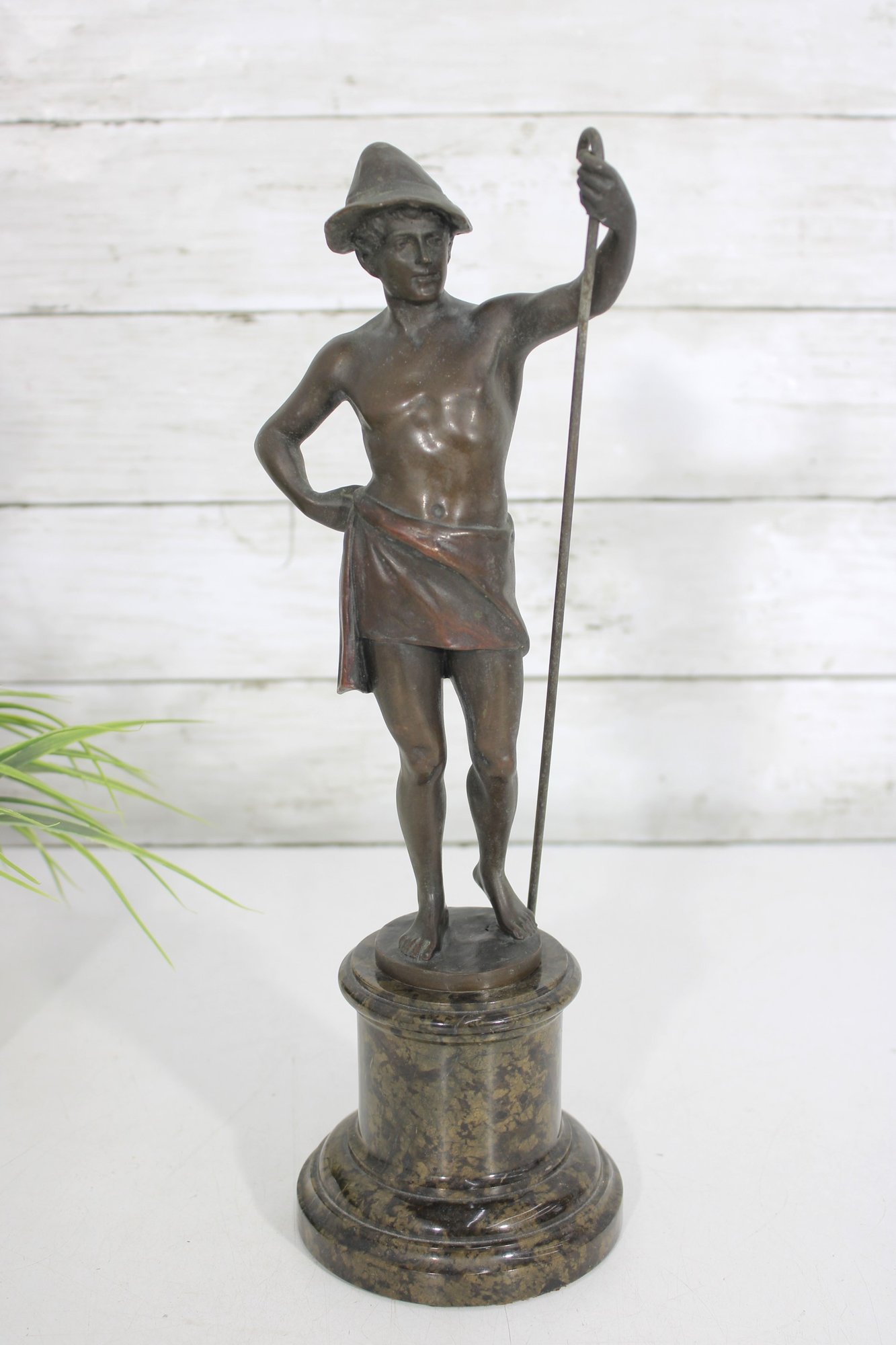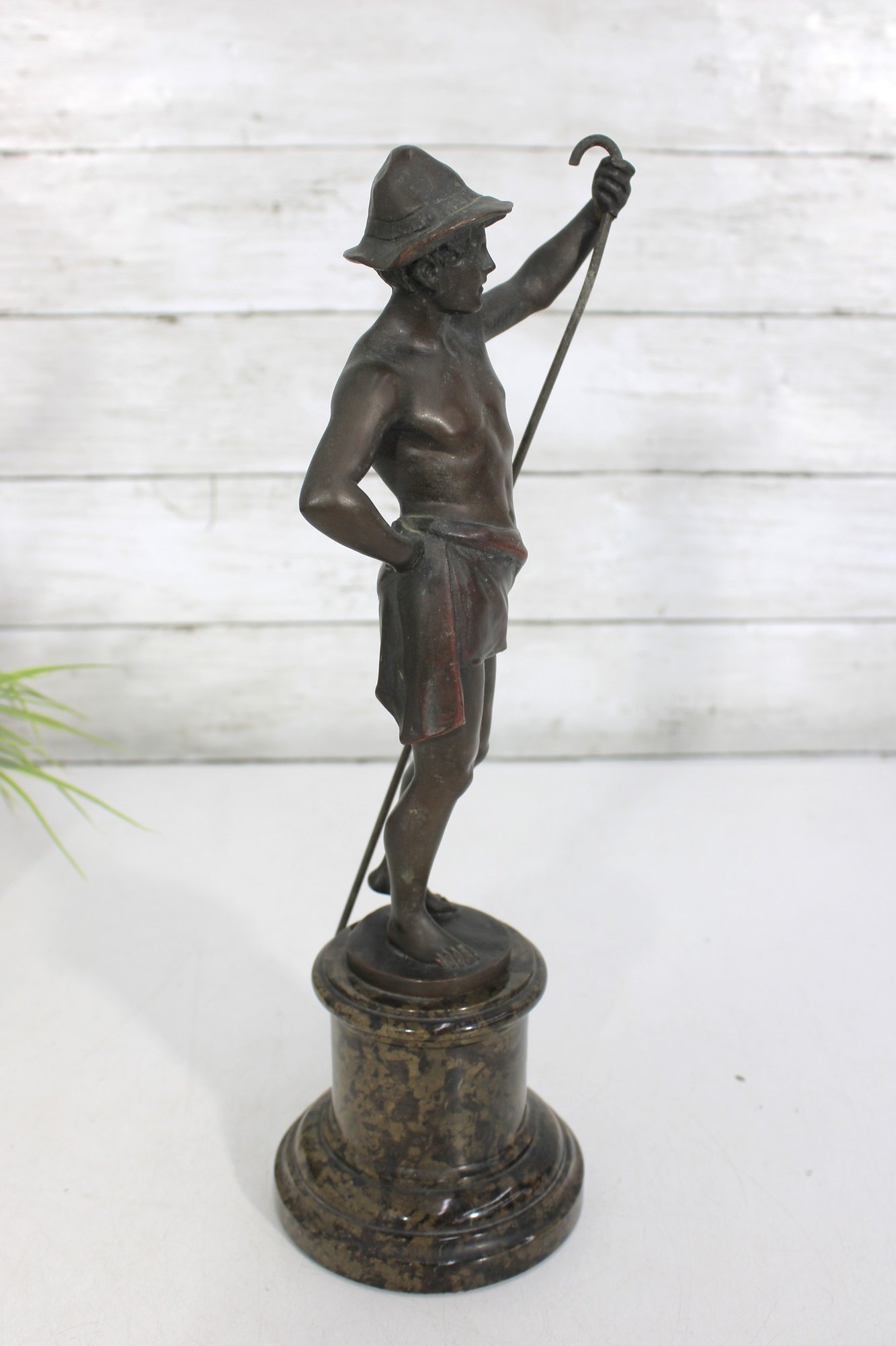 here is “The Shepherd,” a finely detailed patinated bronze sculpture depicting a classical shepherd figure standing confidently with staff in hand. The composition captures a timeless pastoral elegance, blending naturalism with classical proportion and movement.