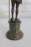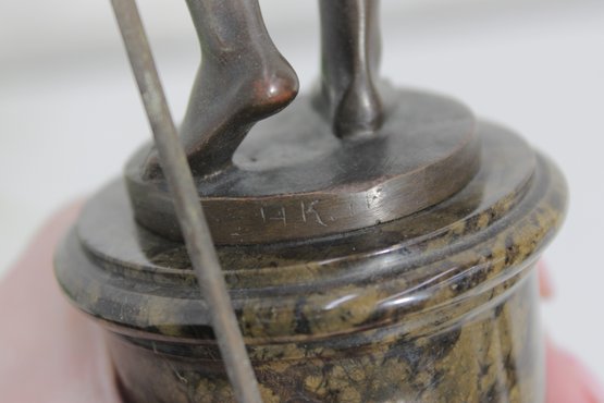 Cast in solid bronze and finished with a rich, warm patina, the sculpture showcases careful attention to anatomical detail and expressive character. The figure is mounted on a polished stone base, providing both visual contrast and stability. The base is signed “HK,” adding collectability and artistic interest.