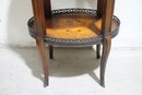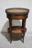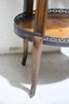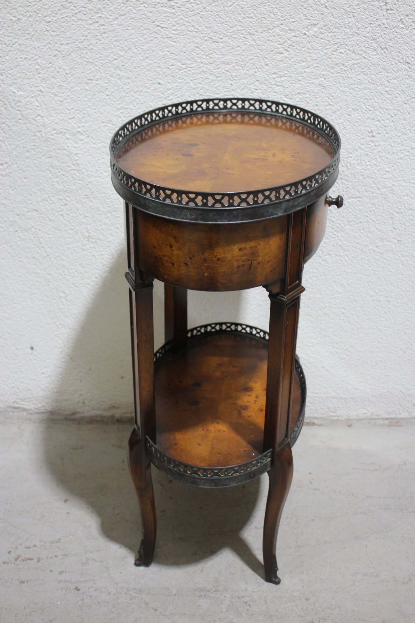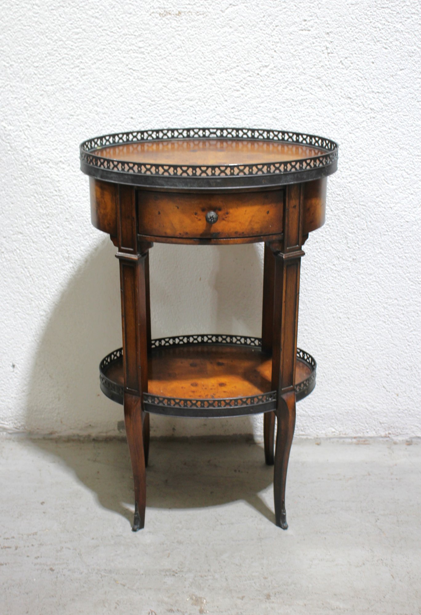 With its compact yet stylish form, this table includes a small drawer for storage, gracefully tapered legs, and a lower tier with matching brass railing, adding both functionality and sophistication.