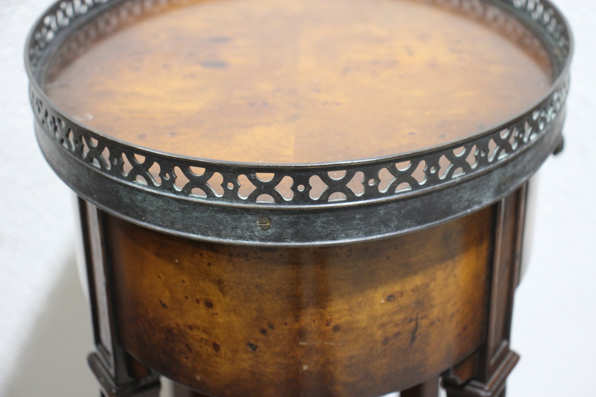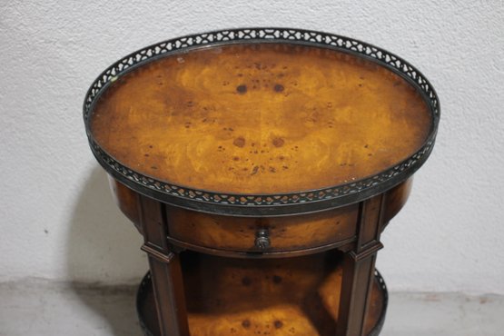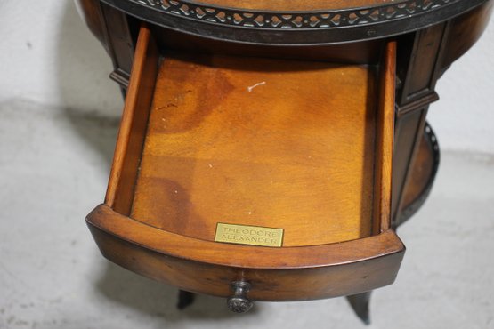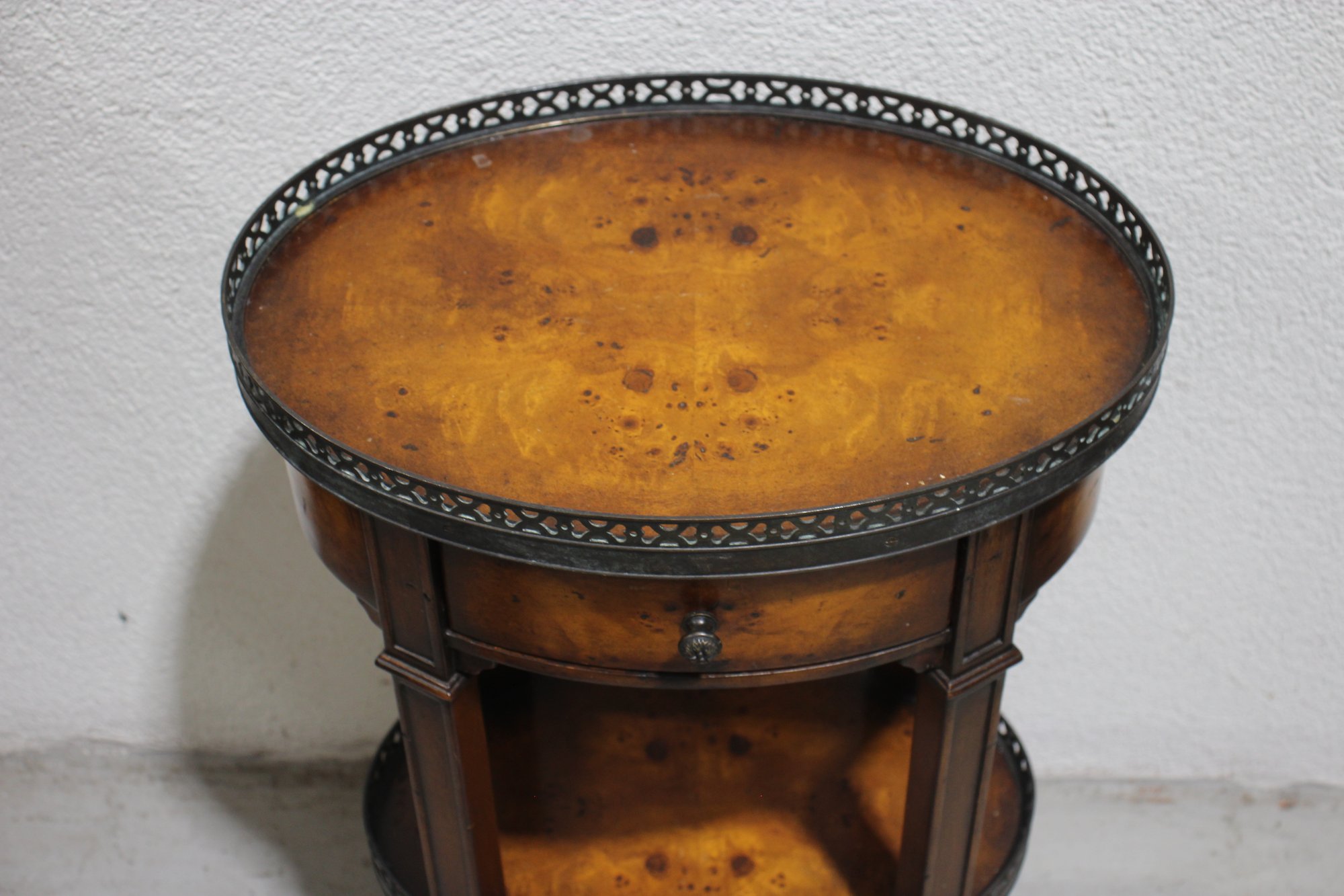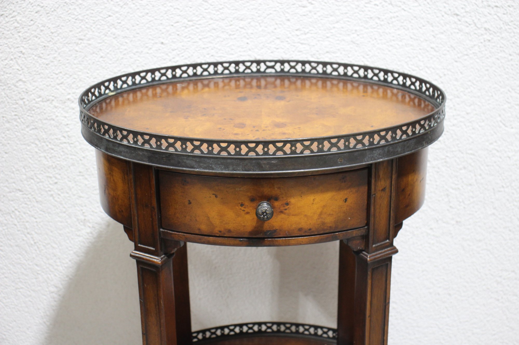 Theodore Alexander oval side table is a stunning piece of craftsmanship, featuring rich burlwood veneer, elegant brass gallery trim, and refined French-inspired design.