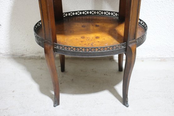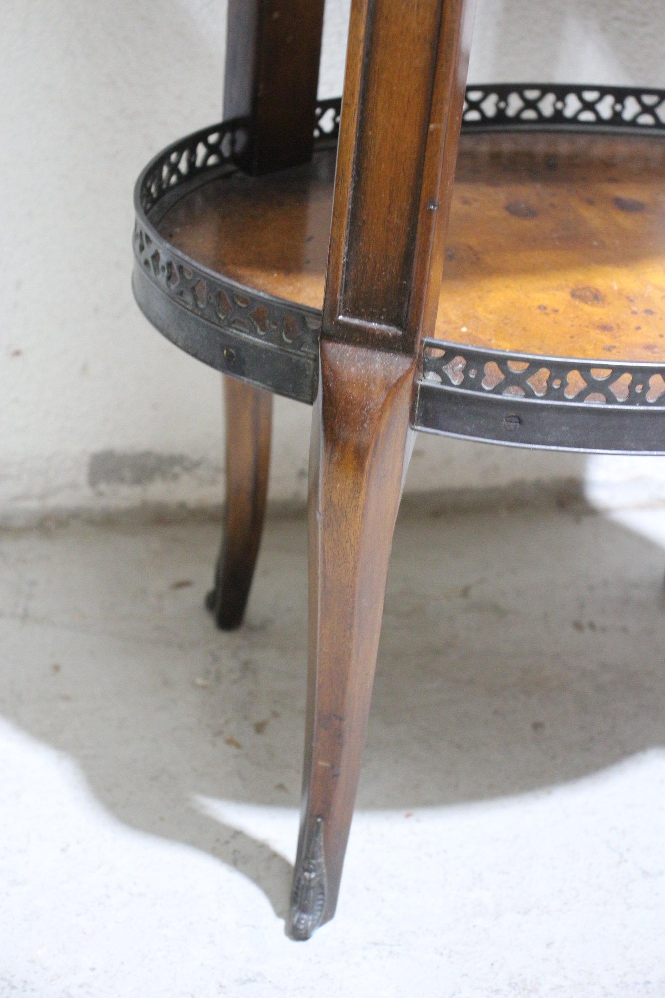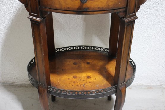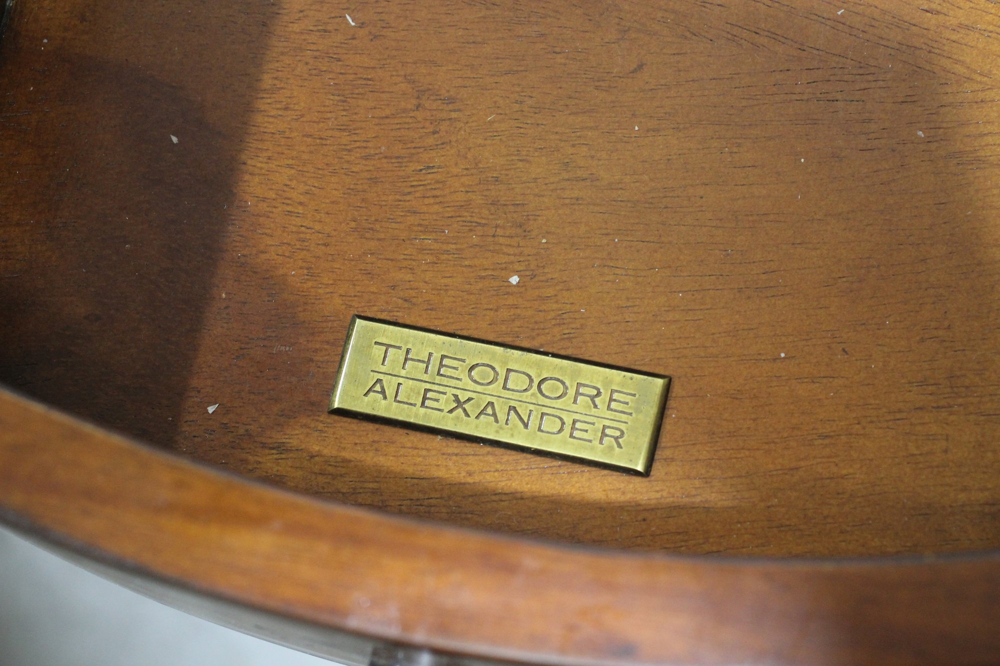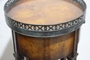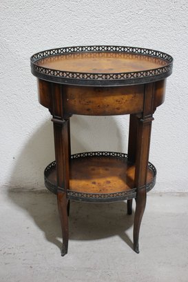 Theodore Alexander oval side table is a stunning piece of craftsmanship, featuring rich burlwood veneer, elegant brass gallery trim, and refined French-inspired design.