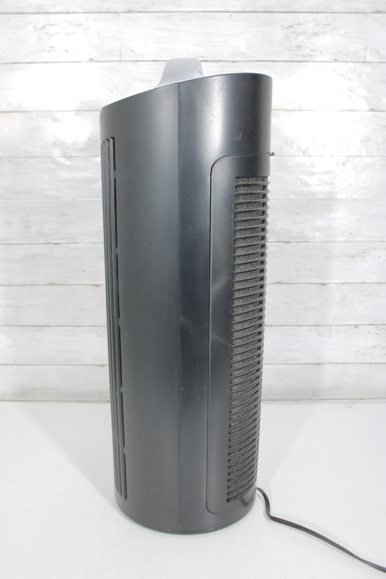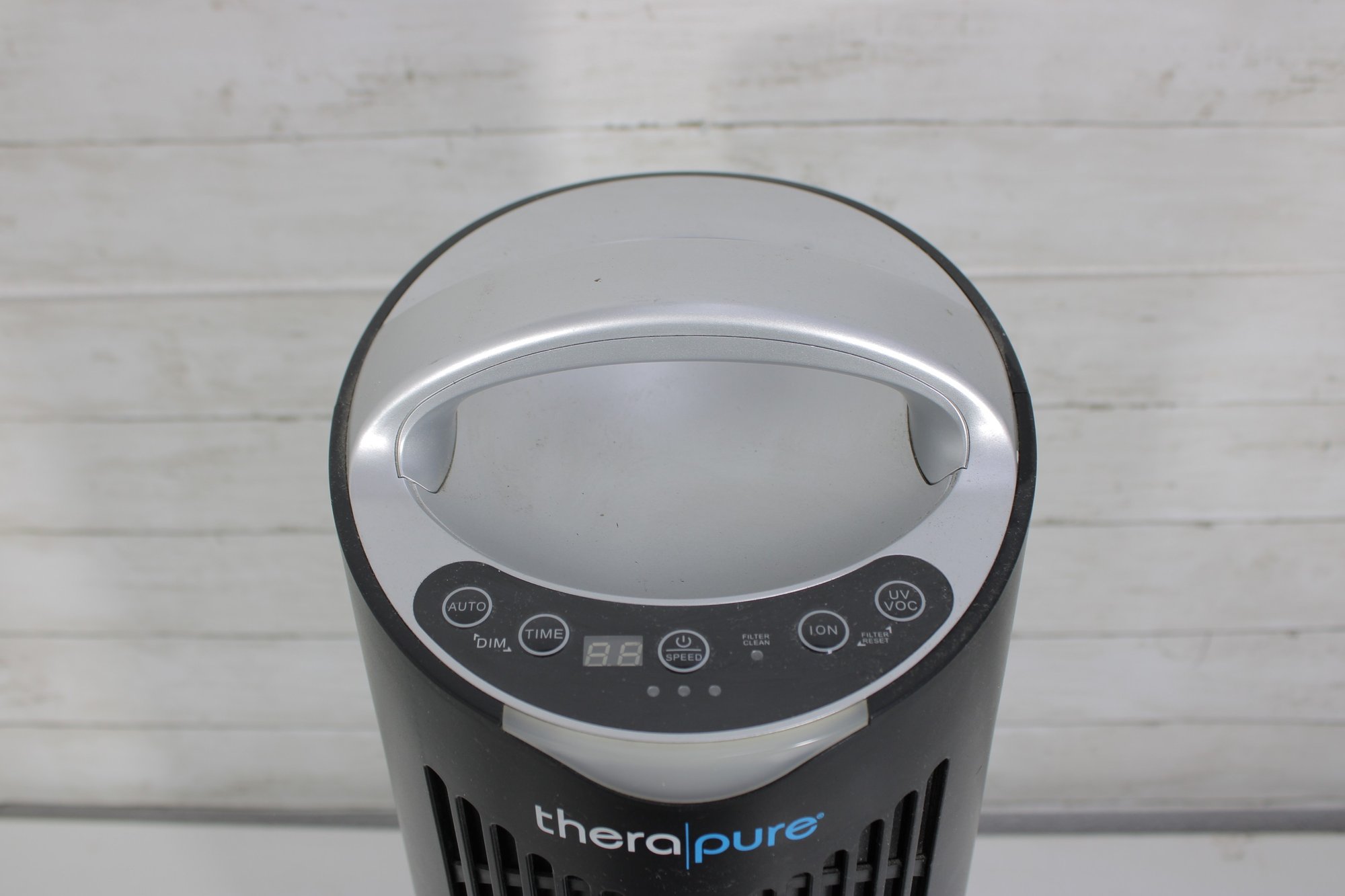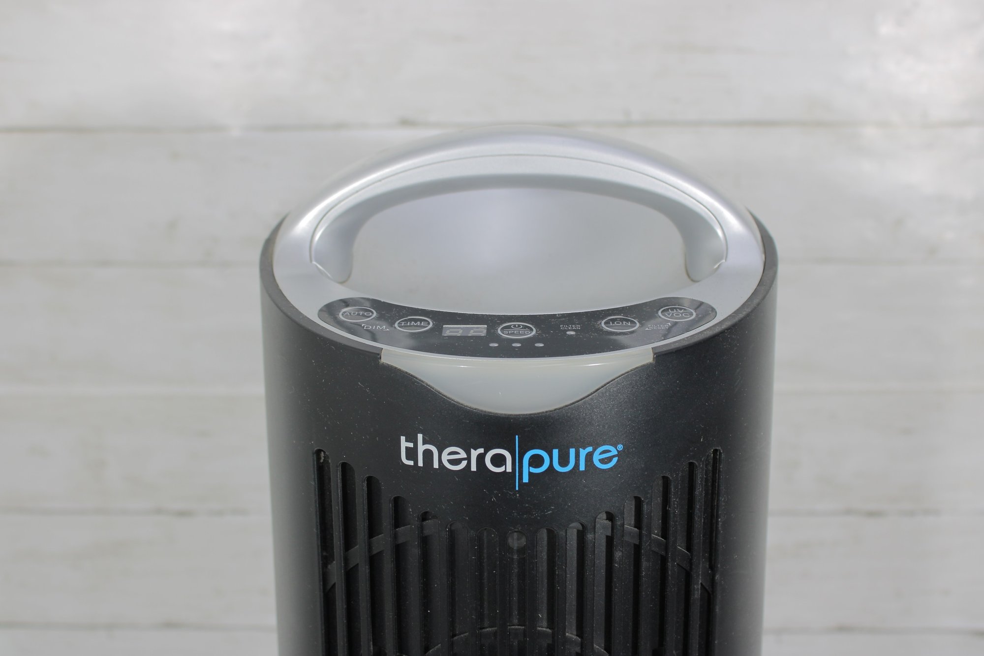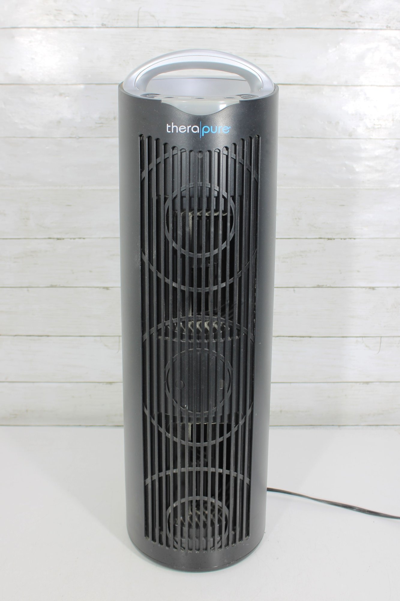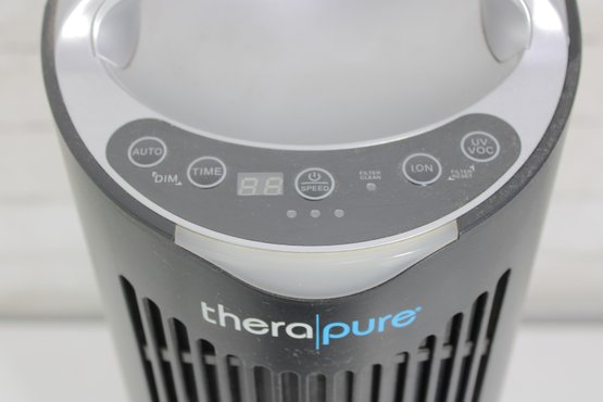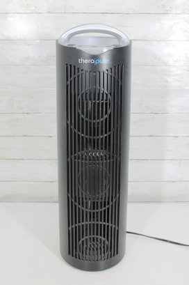 Functional TheraPure tower-style air purifier designed to help improve indoor air quality. The slim vertical design allows it to fit easily in living rooms, bedrooms, offices, or dorm spaces without taking up much floor area.