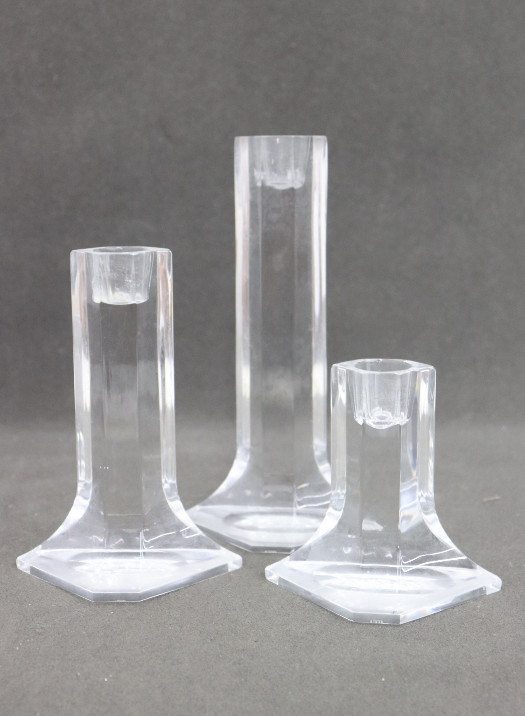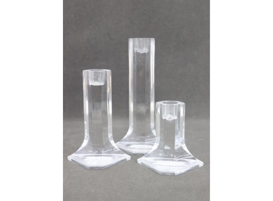 Three Claus Josef Riedel Glass Crystal Candlesticks - Hexagon Over Halved Hex Base Design