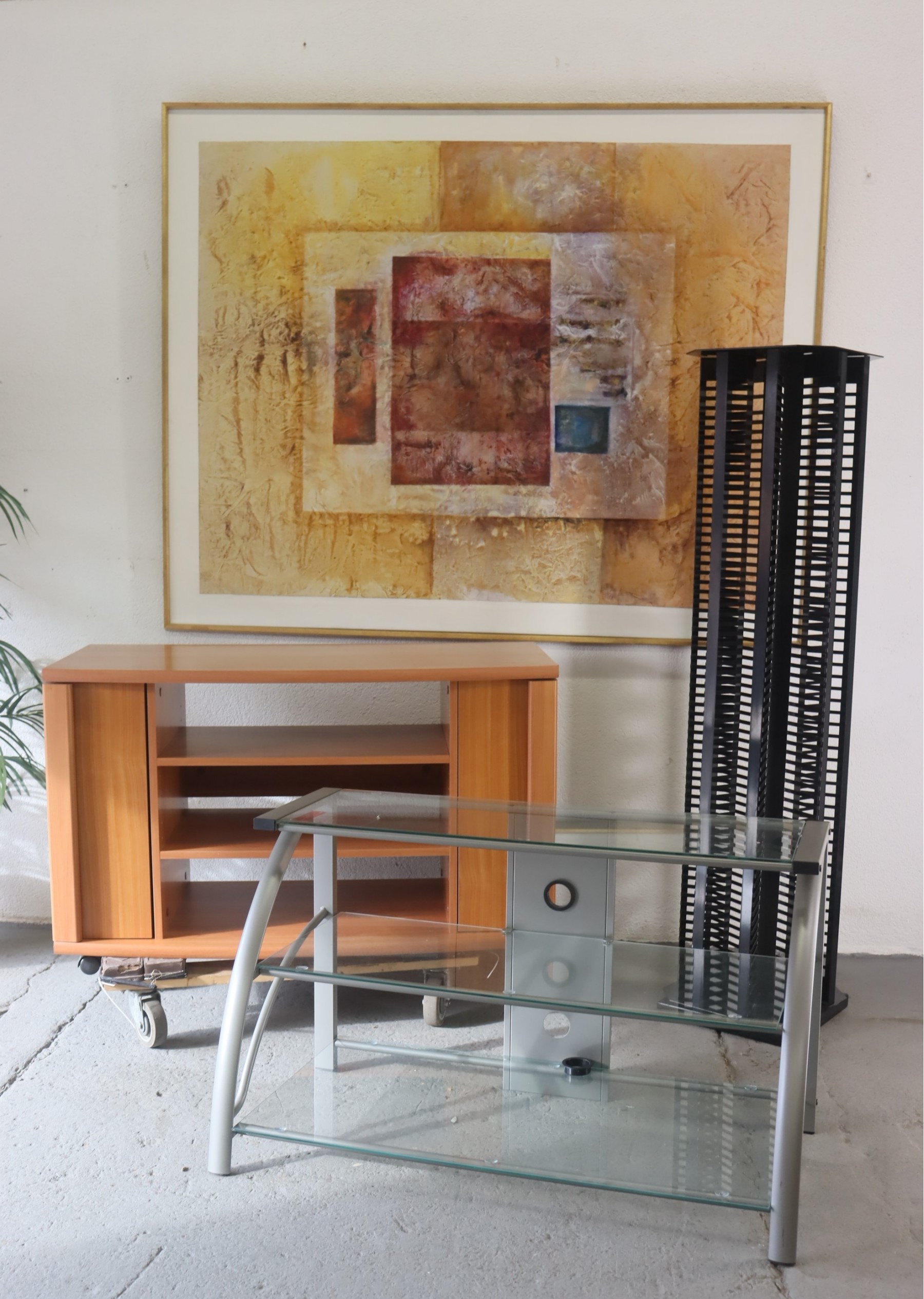 Three Contemporary Media Units - Glass, Wood, And Metal Audio/Visual Display And Storage