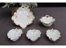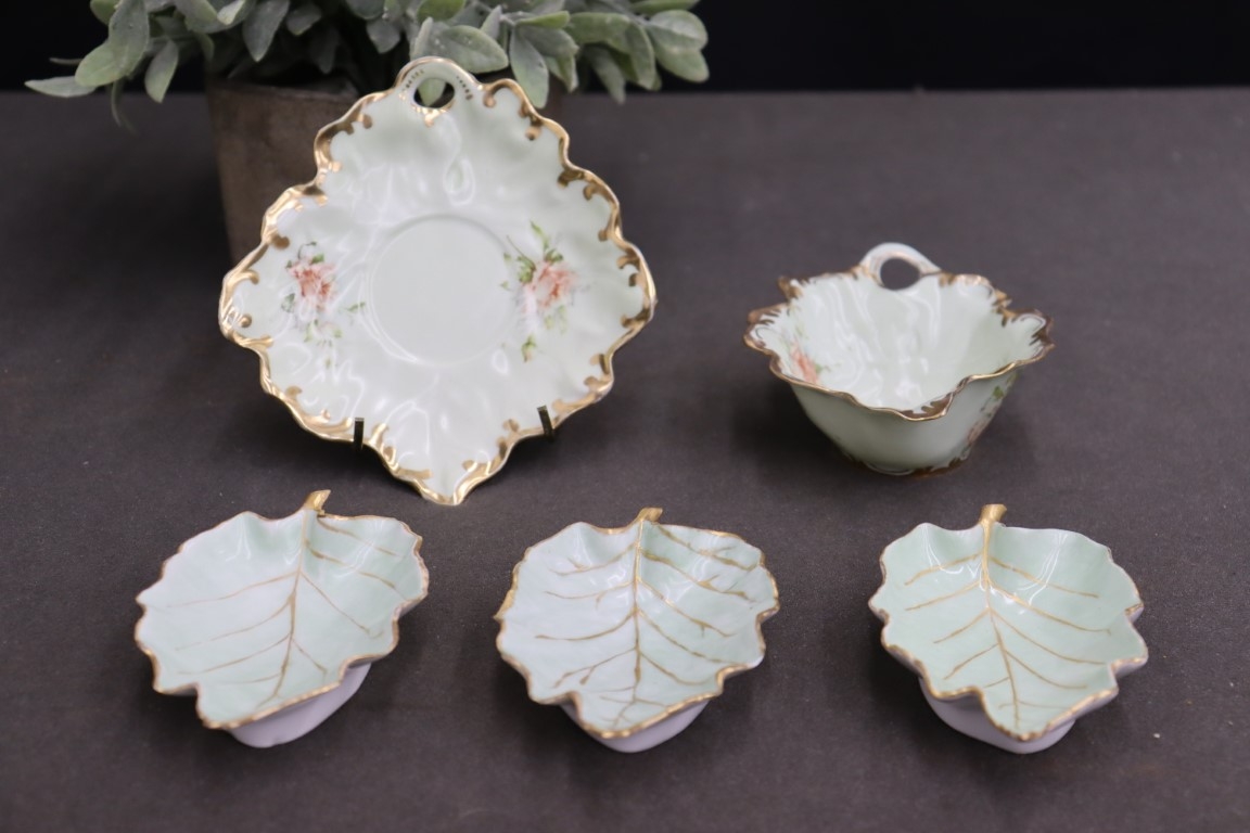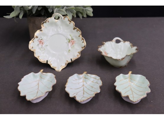 Three T&V Limoges Green Leaf Bowls And A Porcelain Sauce Boat & Saucer Set