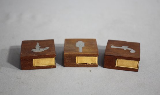 Each piece is meticulously crafted from teak wood and features a unique silver inlay design depicting a candle, lantern, and pistol, respectively.