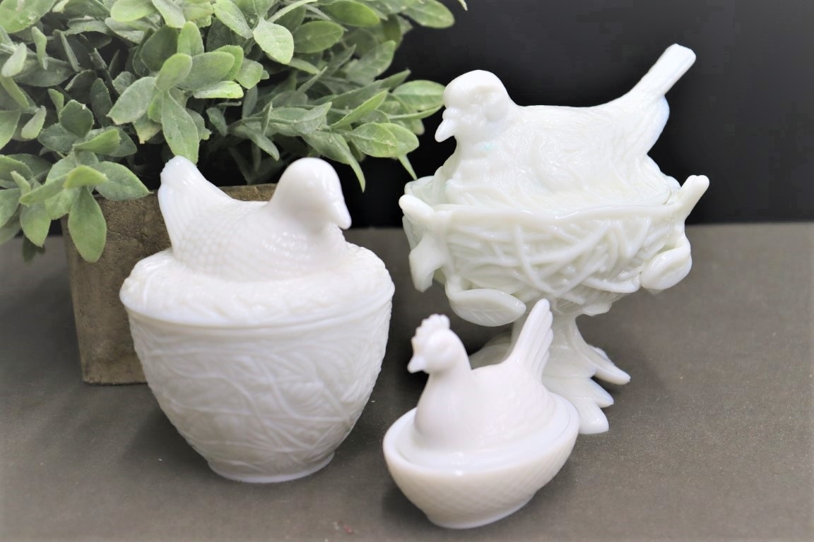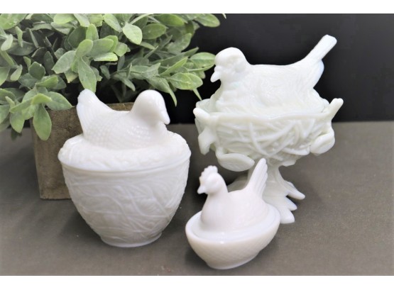 Three White Milk Glass Nesting Bird Covered Bowls - Candy Dish, Salt/Sugar Cellar Etc.