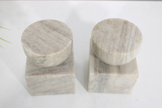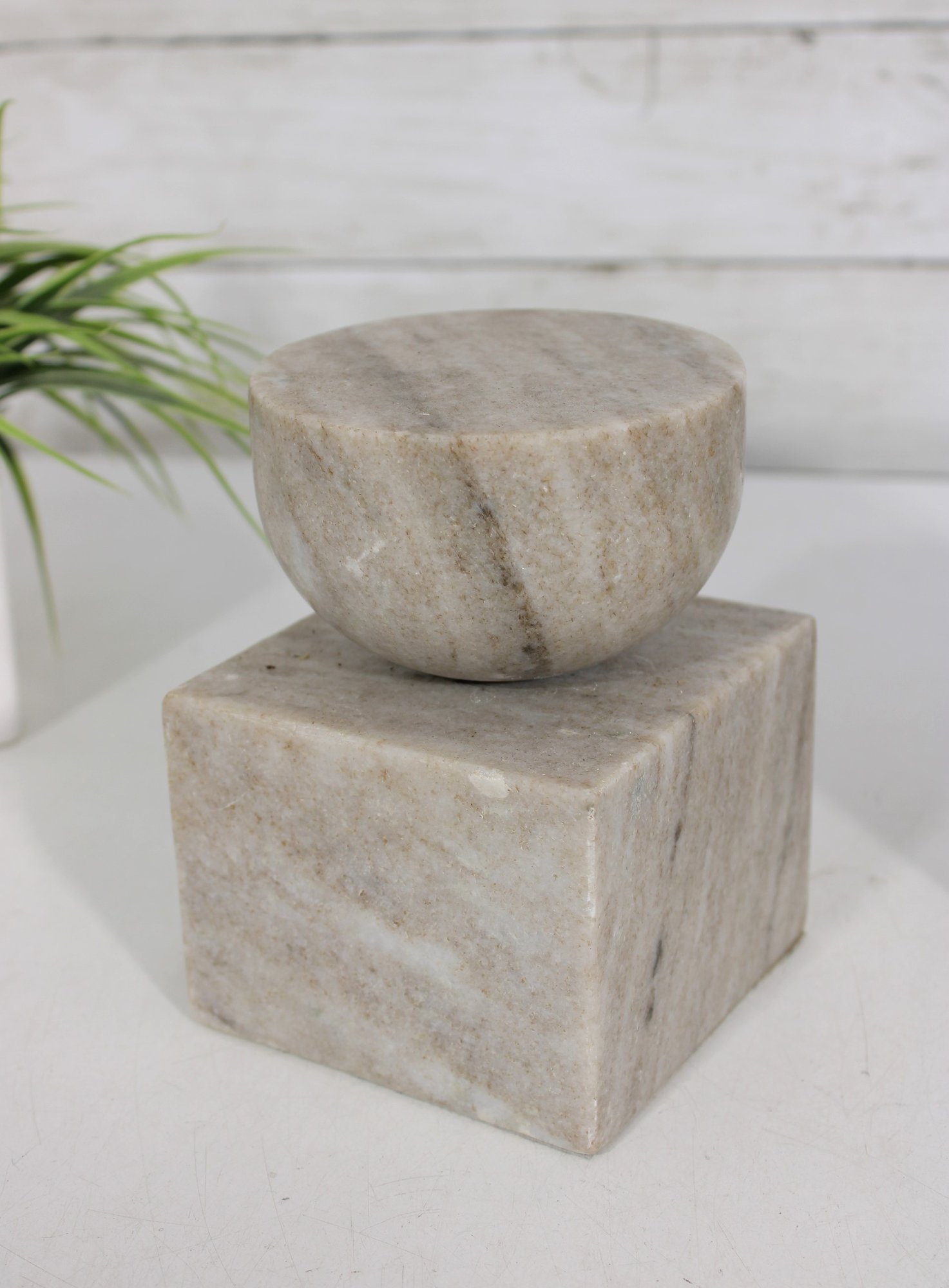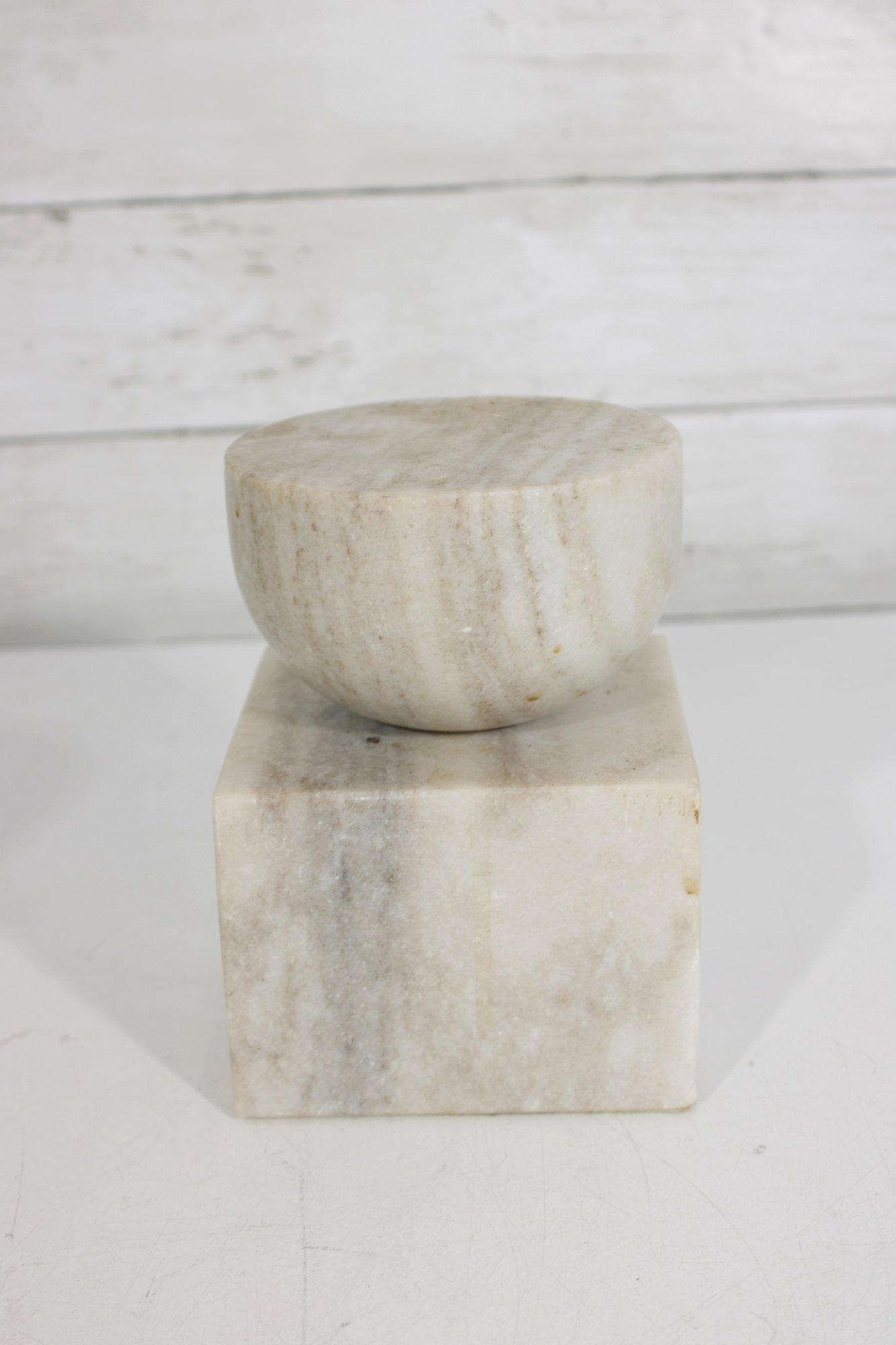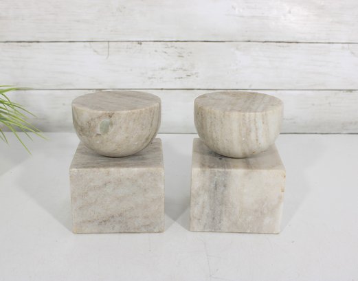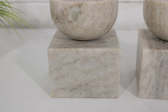 Set of two modern marble figural candle holders from Threshold™ designed with Studio McGee. These sculptural pieces feature a clean, minimalist design with a round cup resting atop a solid cube base, showcasing the natural beauty of beige marble with subtle veining.