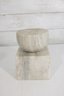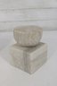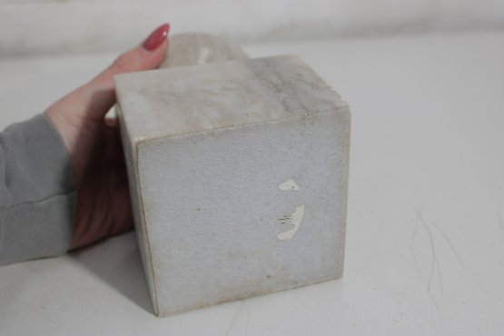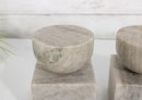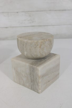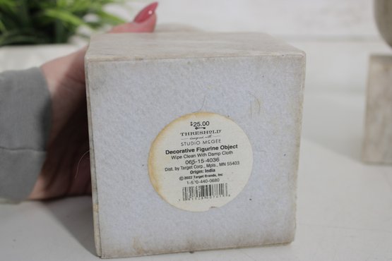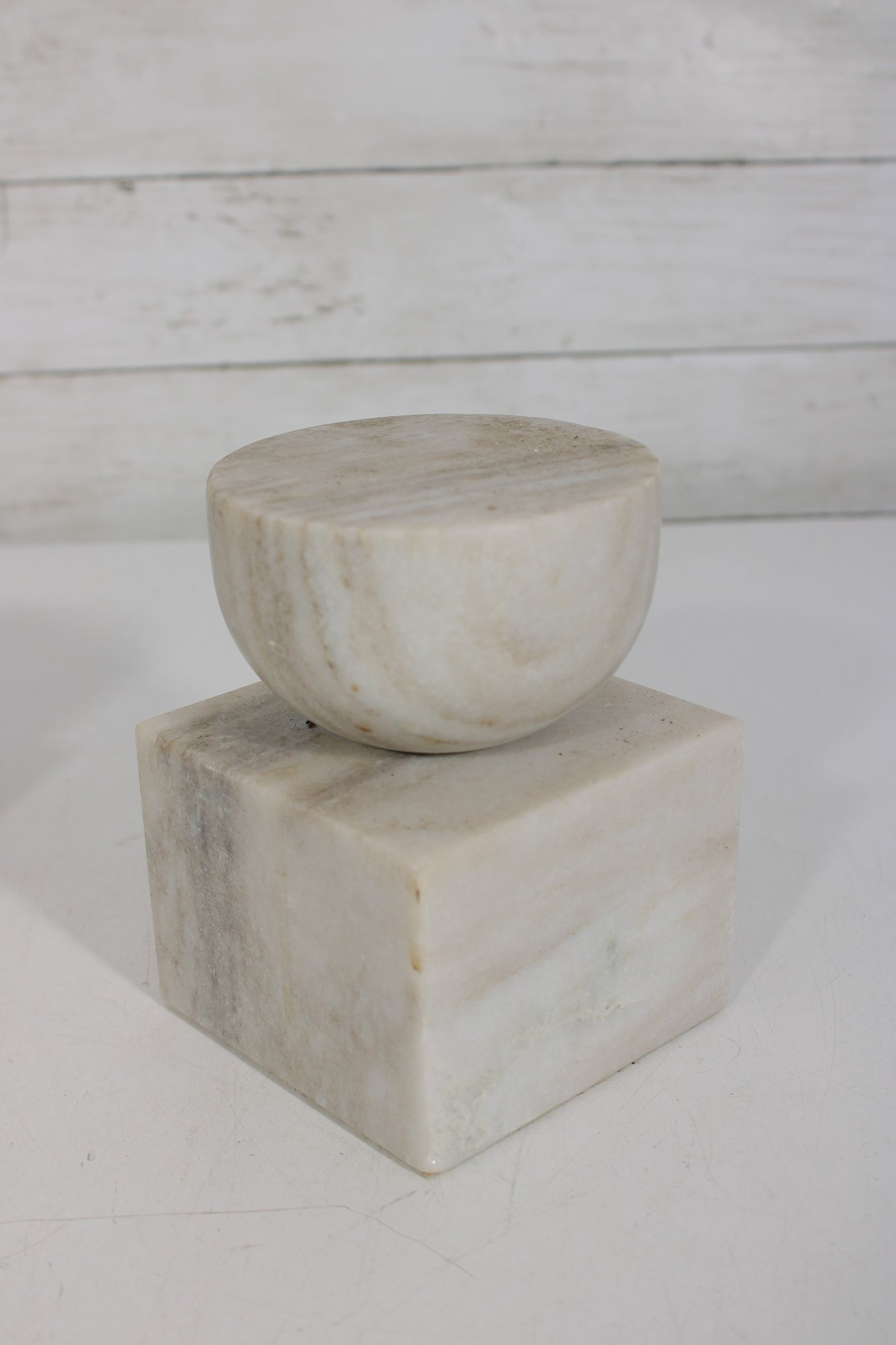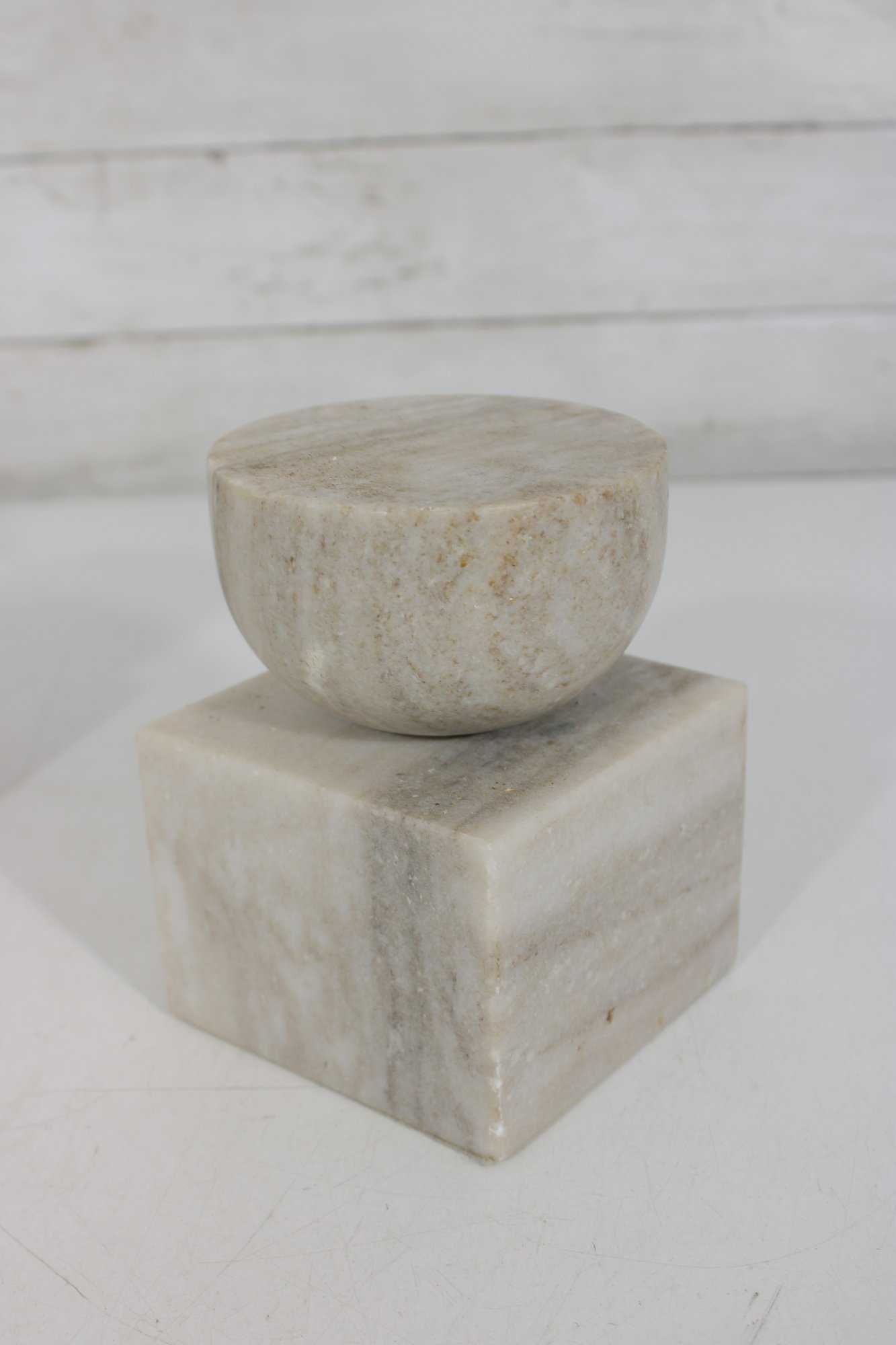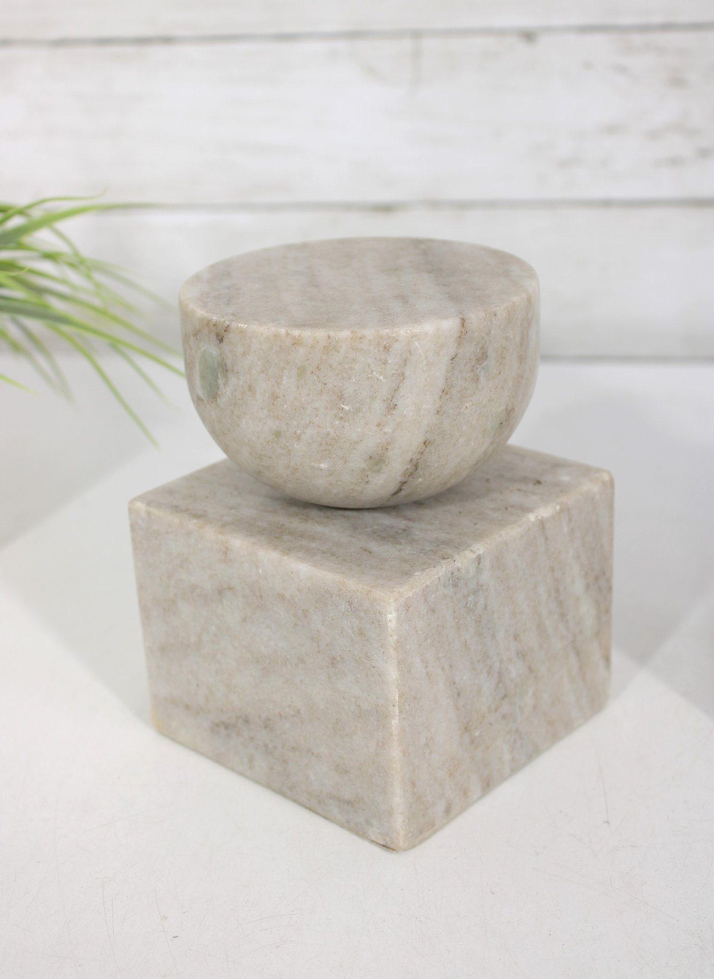 Set of two modern marble figural candle holders from Threshold™ designed with Studio McGee. These sculptural pieces feature a clean, minimalist design with a round cup resting atop a solid cube base, showcasing the natural beauty of beige marble with subtle veining.