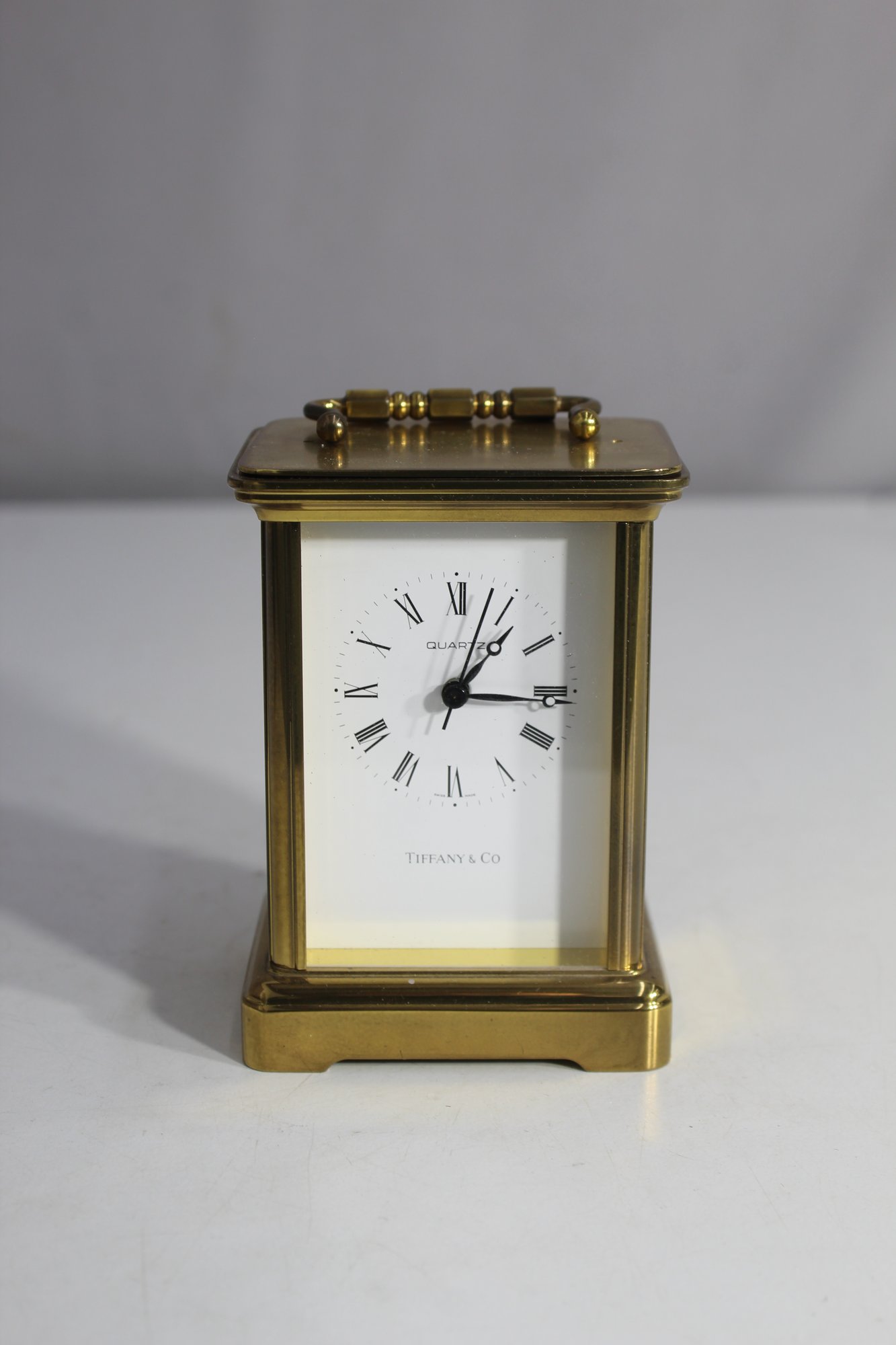 This vintage Tiffany & Co. brass carriage clock is a timeless piece of luxury and sophistication. The clock features a classic Roman numeral dial with "Tiffany & Co." elegantly displayed on the face. A removable brass handle adds charm and portability, while the hinged back door reveals the quartz mechanism, ensuring both style and functionality.