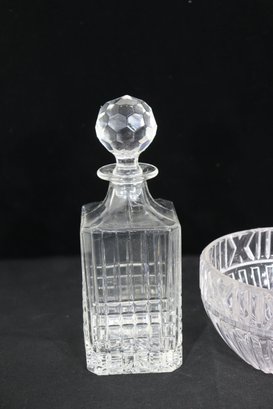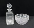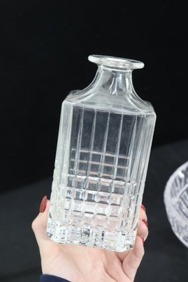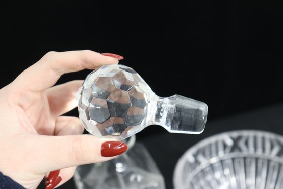 Tiffany & Co. Crystal Decanter w/ Faceted Stopper – approx. 10” H with stopper. Elegant squared body with vertical and cross grid cut pattern and faceted globe stopper. Classic and timeless barware display piece.