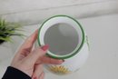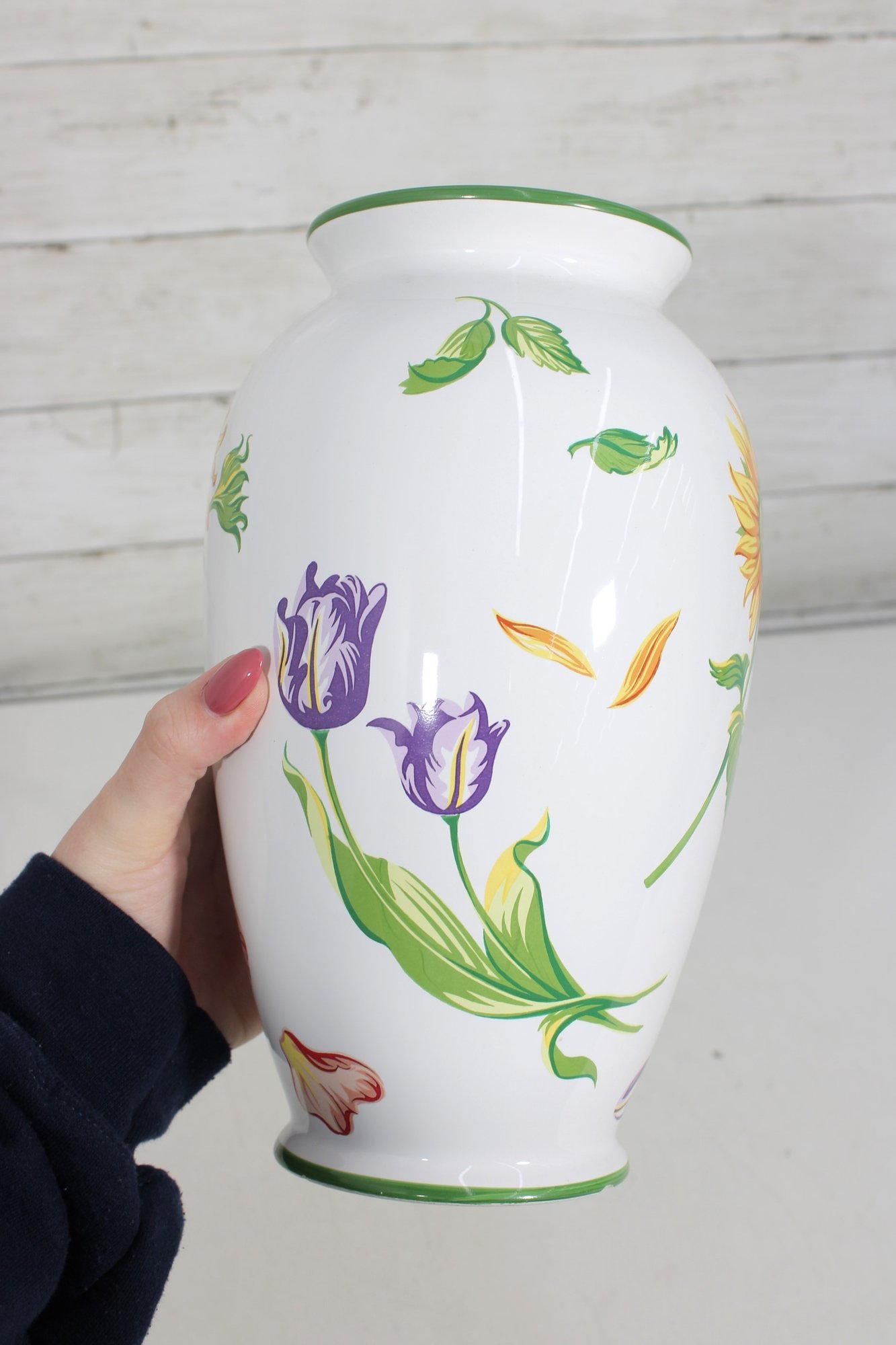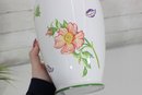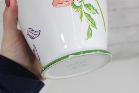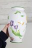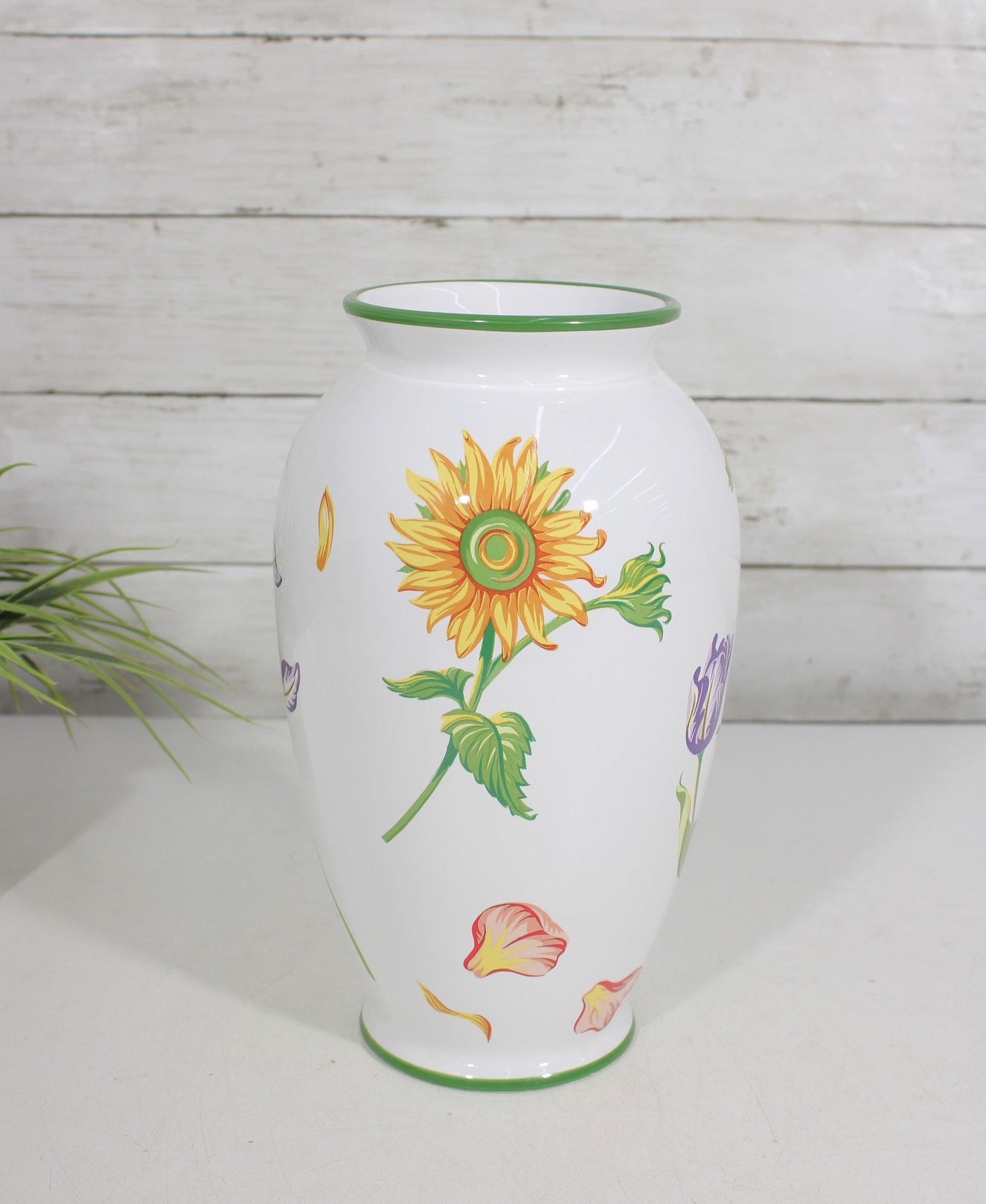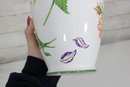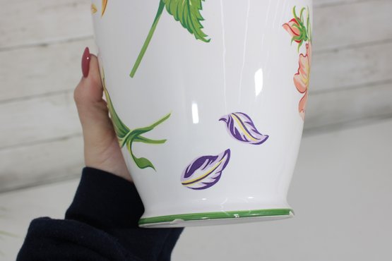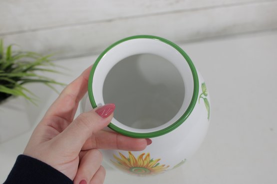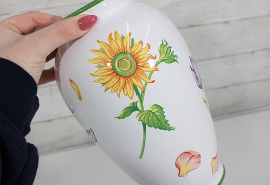 Beautiful Tiffany & Co. porcelain vase from the “Tiffany Garden” collection, featuring colorful hand-decorated floral designs including a vibrant sunflower and delicate botanical accents. The crisp white porcelain background with green trim highlights the bright floral artwork, creating a cheerful and elegant decorative piece.