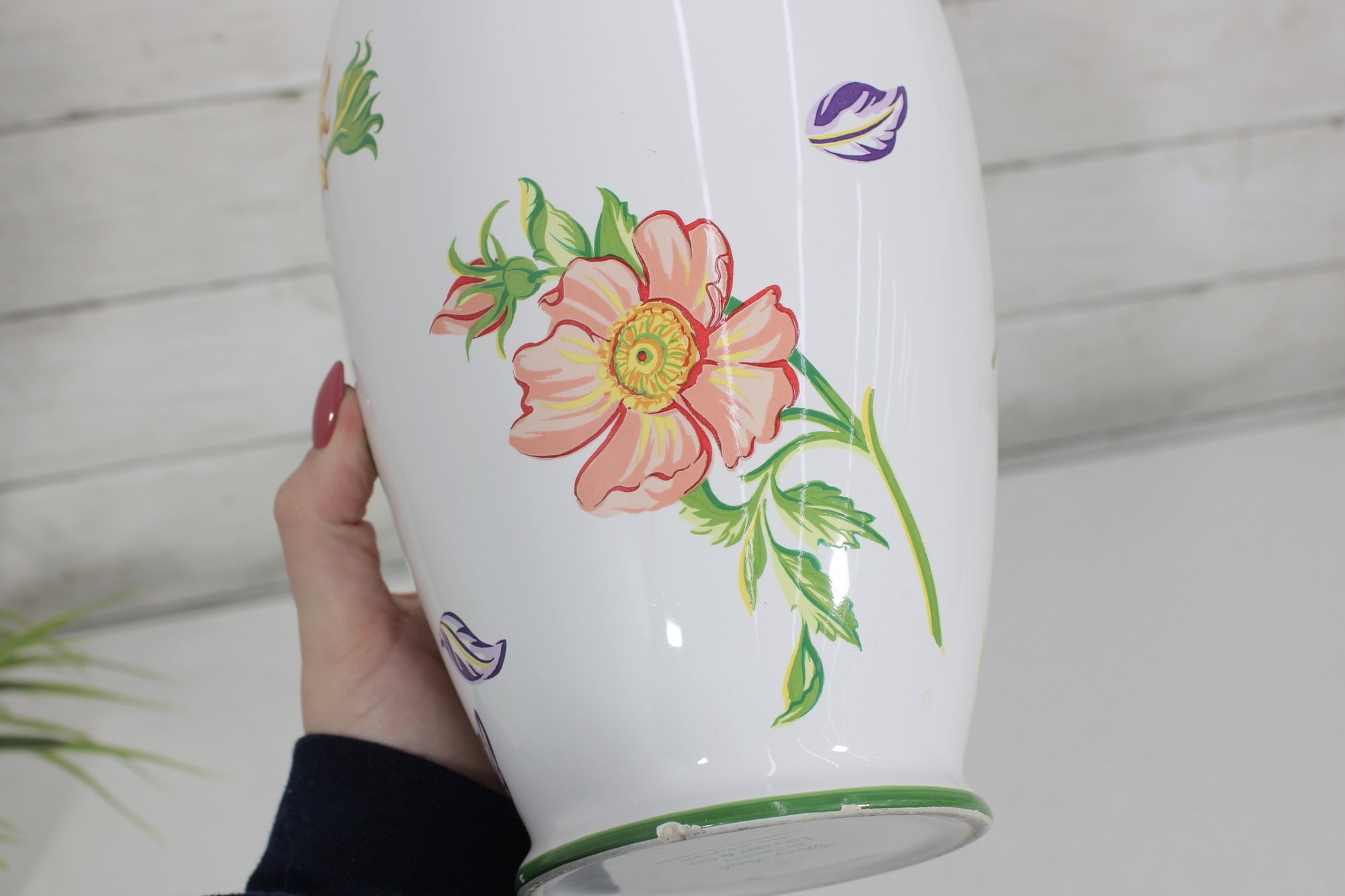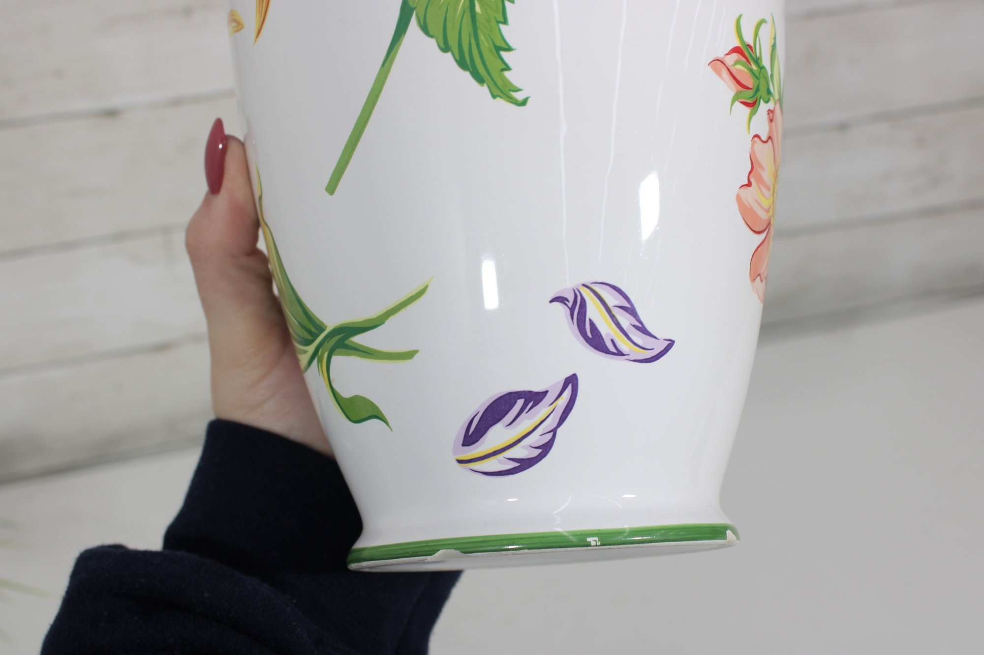 This vase was designed by Tiffany & Co. and made in Japan, reflecting quality craftsmanship and classic Tiffany styling. The lively garden motif makes it perfect for displaying fresh flowers or as a striking decorative accent on its own.