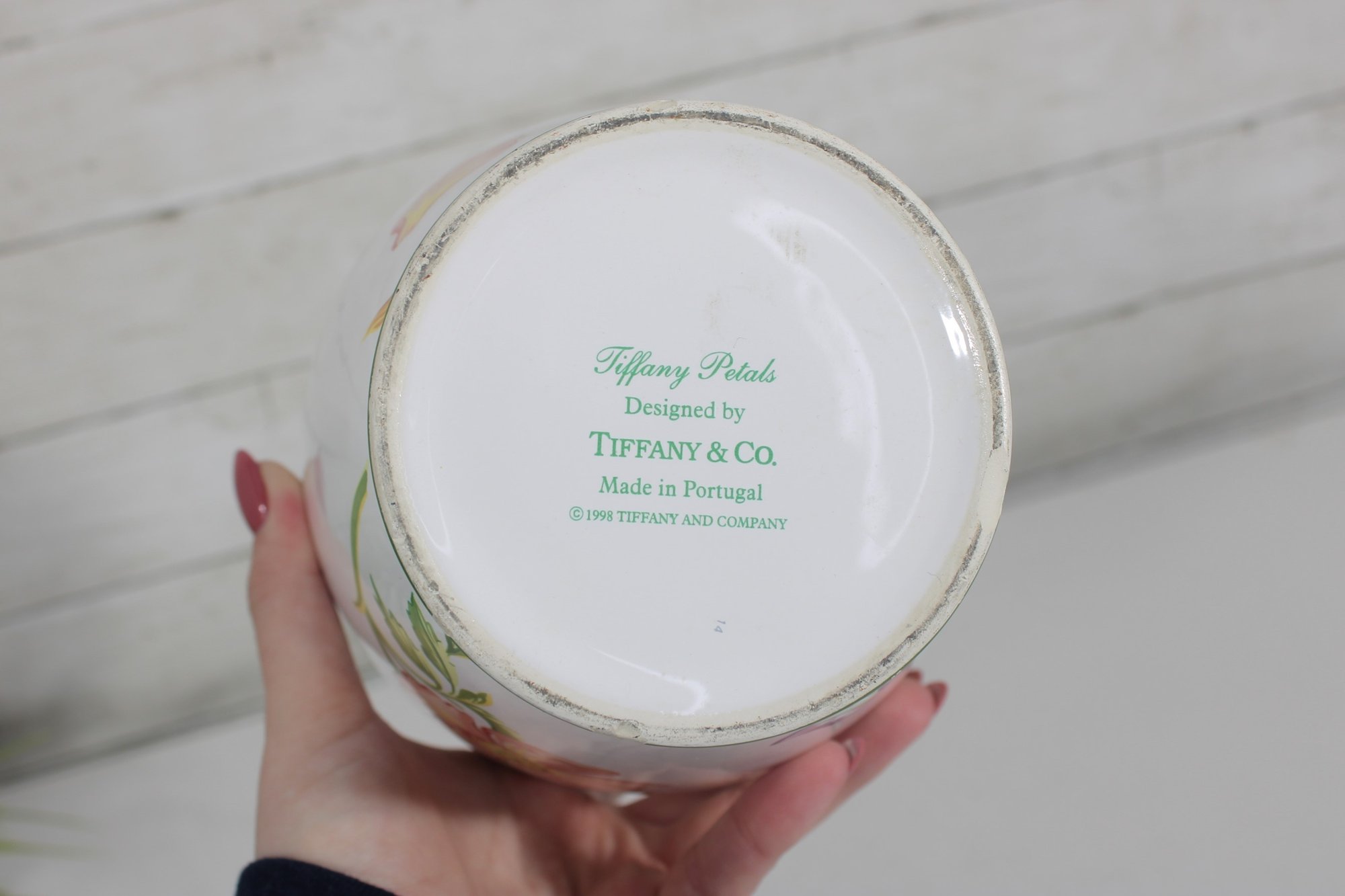 The vase stands approximately 10 inches tall and is marked on the underside “Tiffany Garden – Designed by Tiffany & Co. – Made in Japan.”