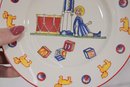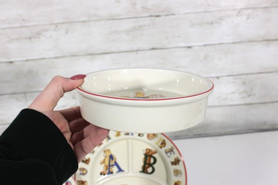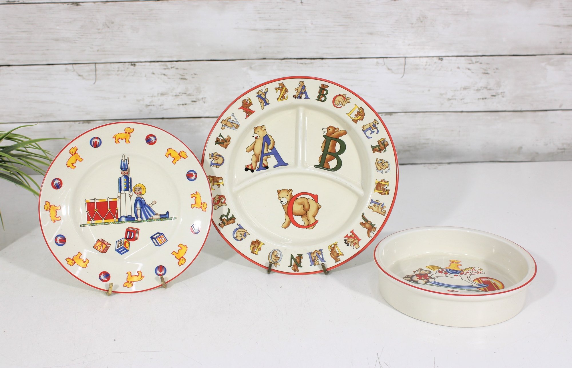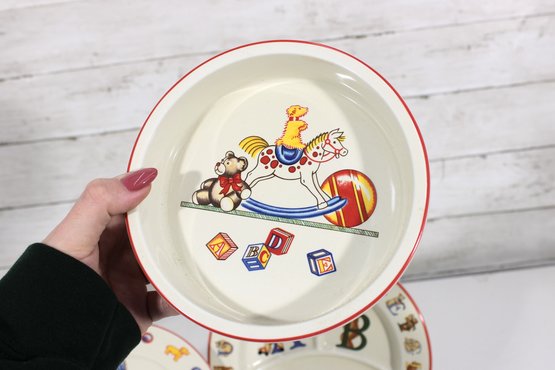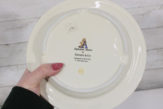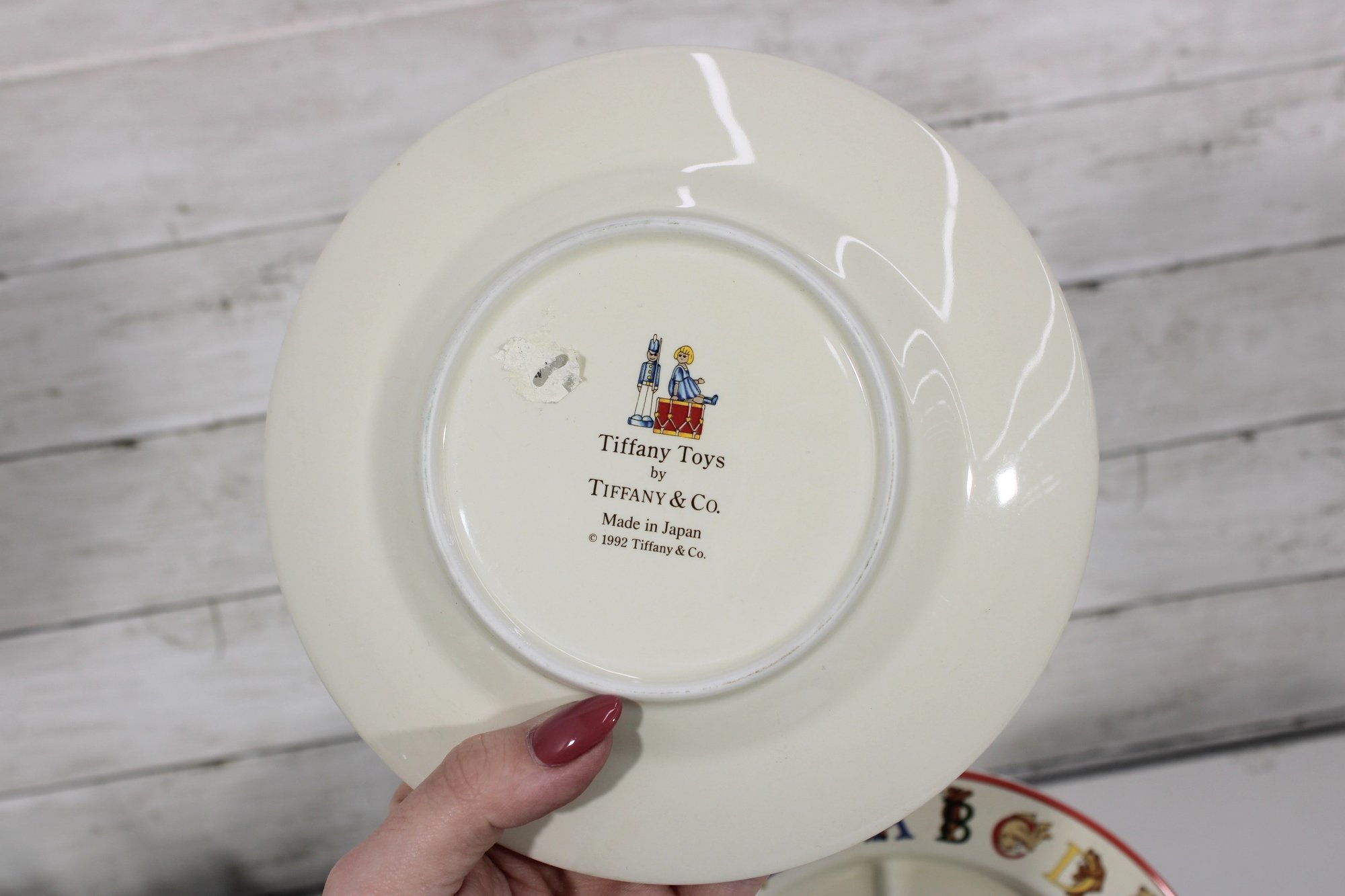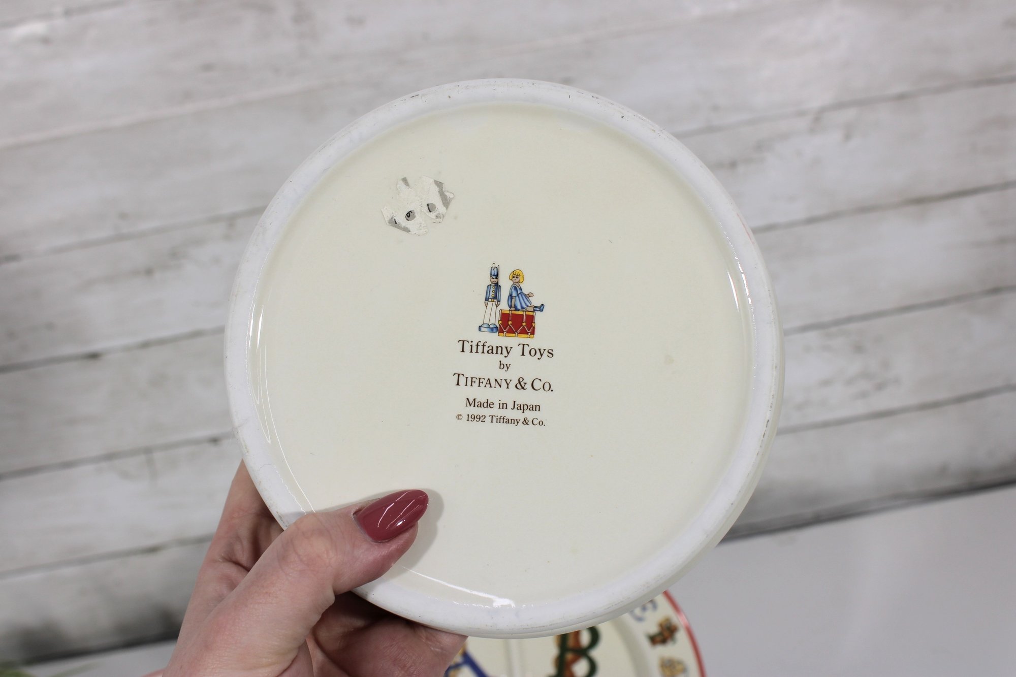 a charming Tiffany & Co. “Tiffany Toys” children’s dish set featuring colorful illustrations of toys, alphabet letters, and bears. This delightful set includes three coordinating pieces with playful designs perfect for collectors or display.