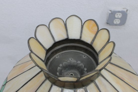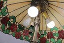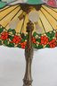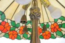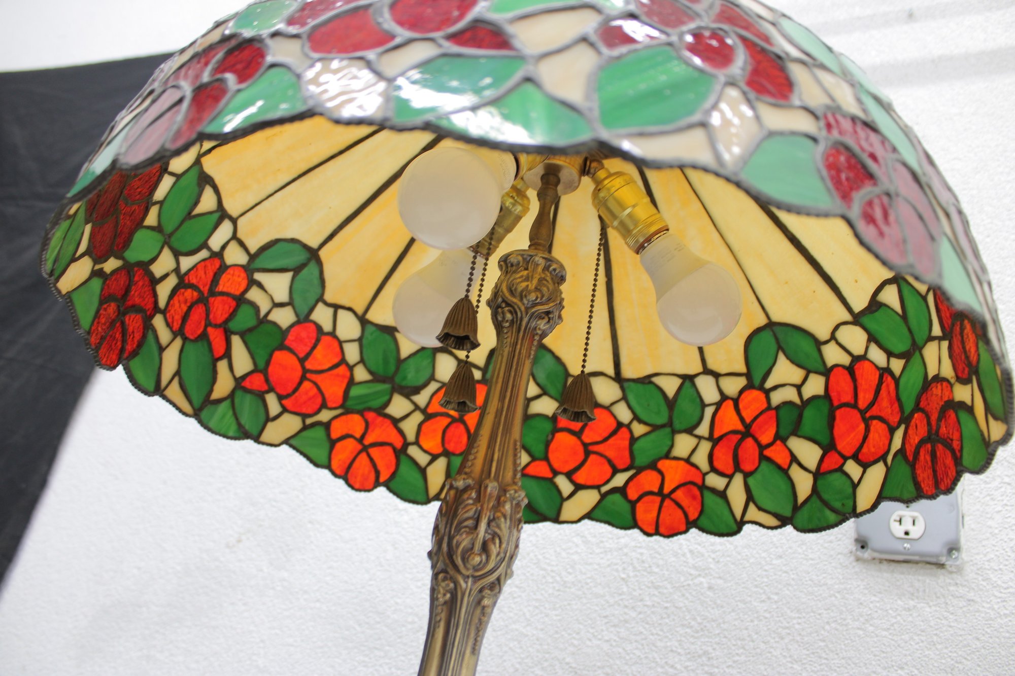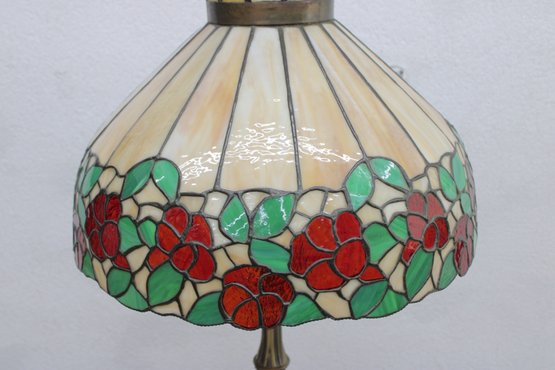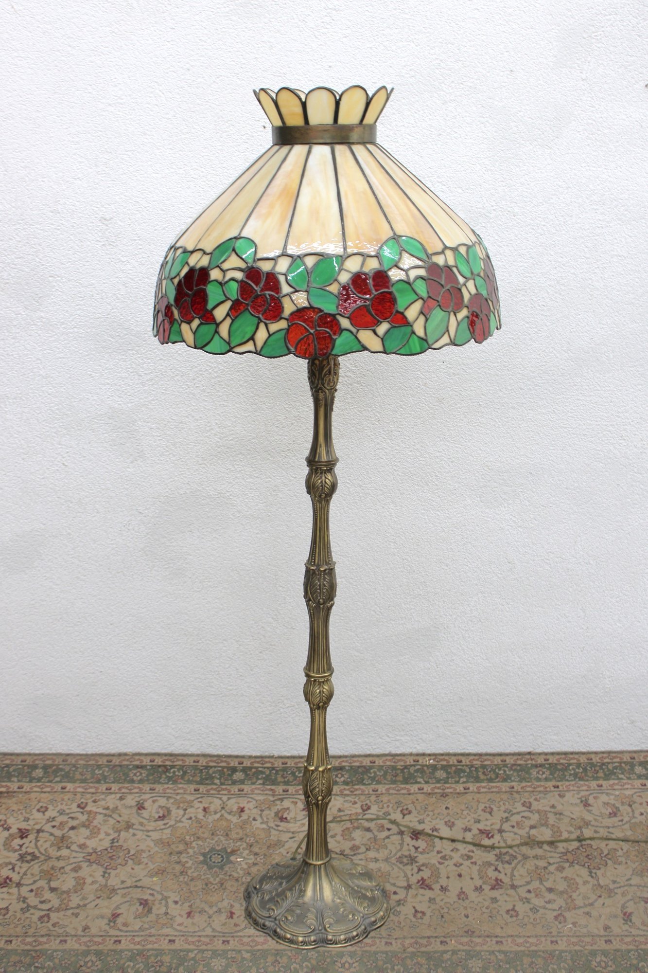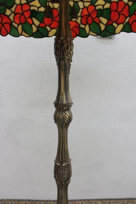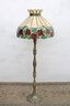 Gorgeous Tiffany-style floor lamp featuring a vibrant floral shade and beautifully detailed cast metal base. This is a true statement lighting piece with rich color, classic design, and substantial presence.