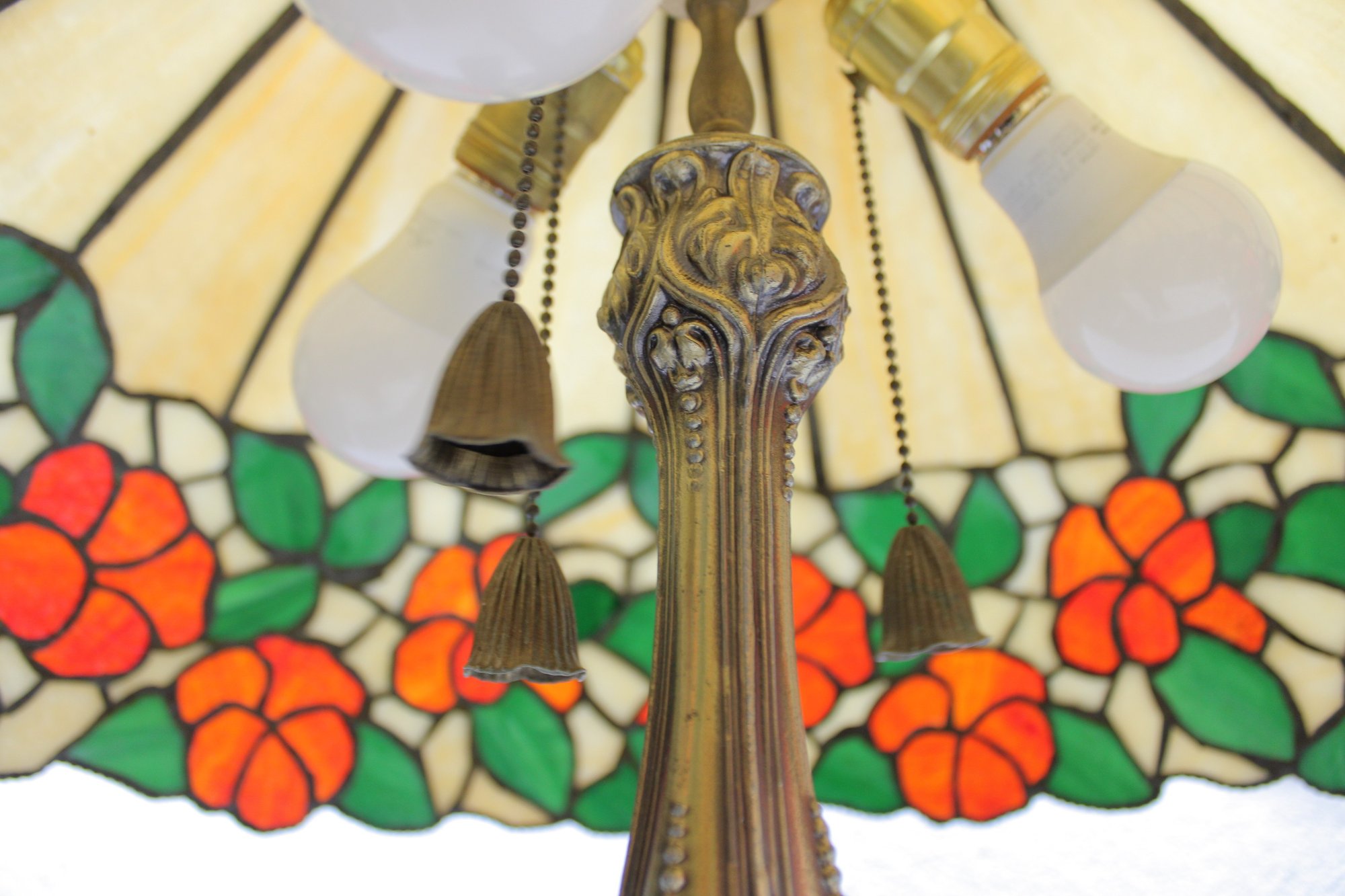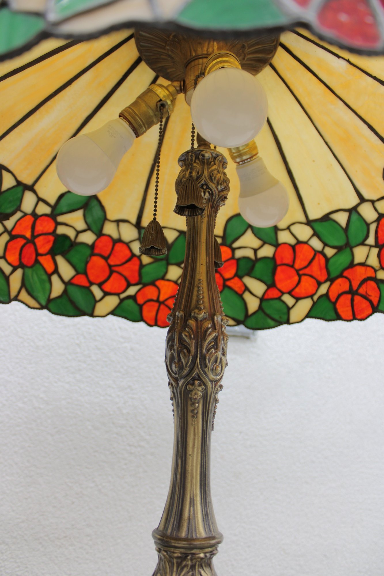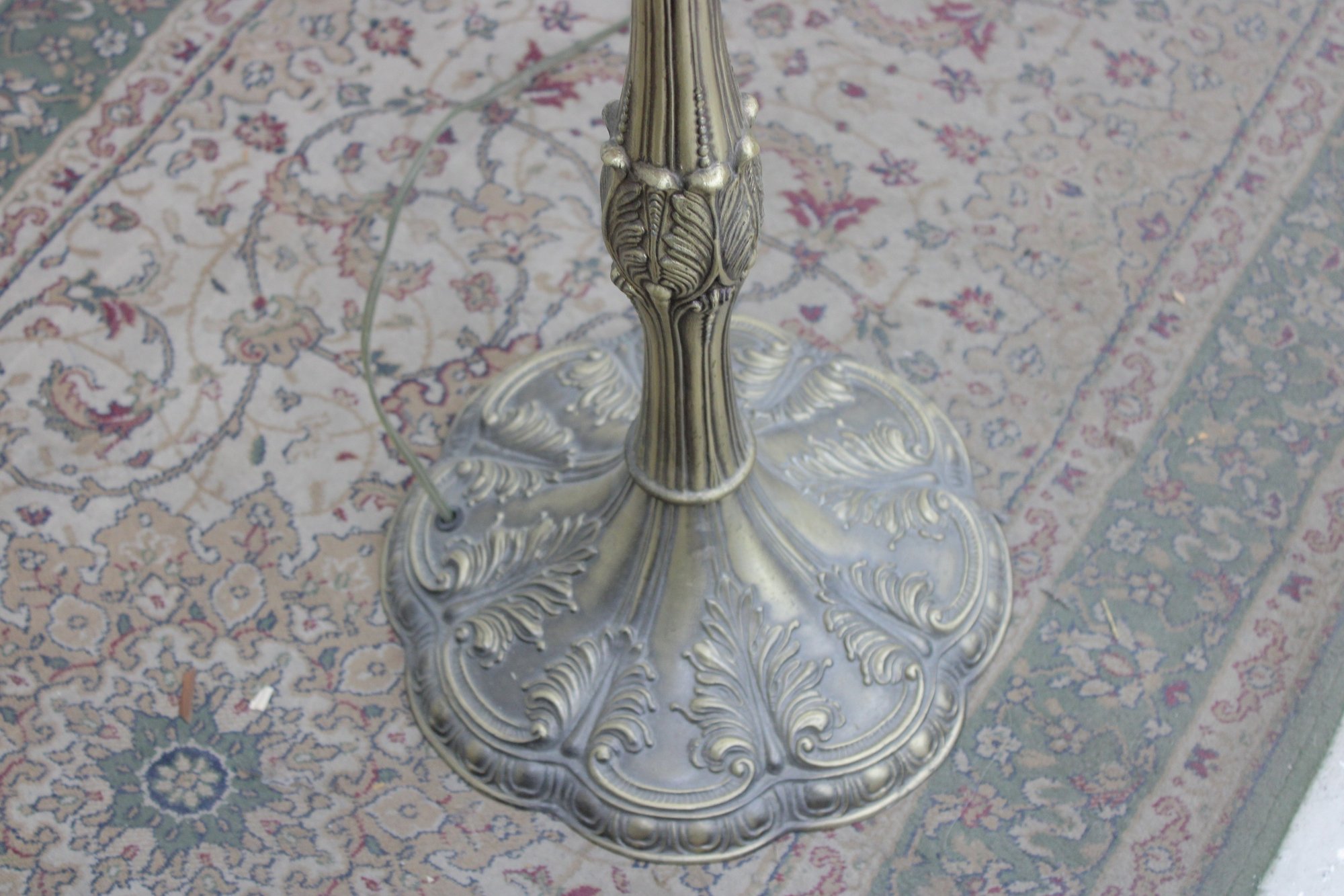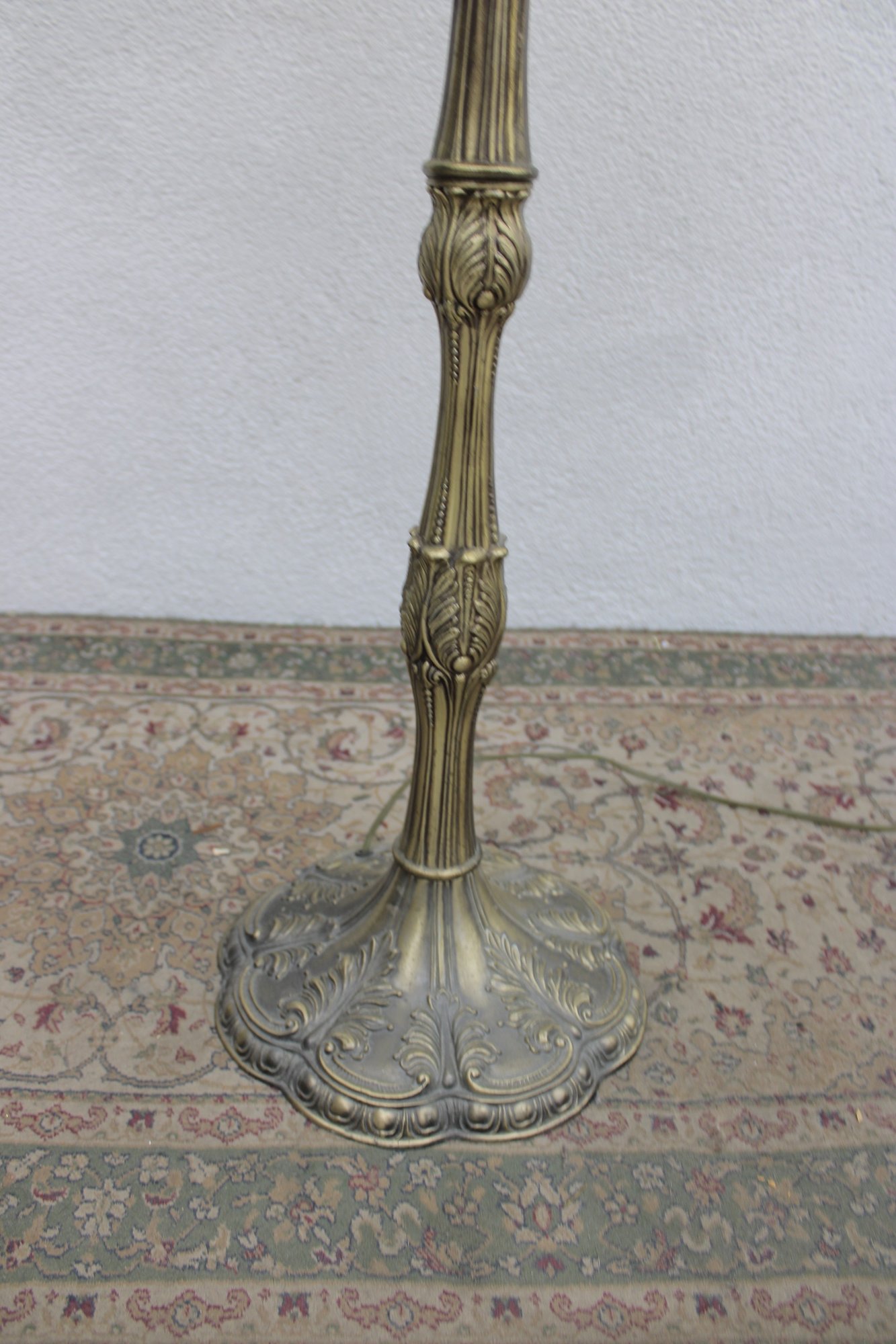 The base is equally impressive — tall, elegant, and heavily detailed with flowing lines and decorative relief work in an antique brass finish. This lamp blends beautifully with vintage, traditional, Arts & Crafts, or eclectic interiors.