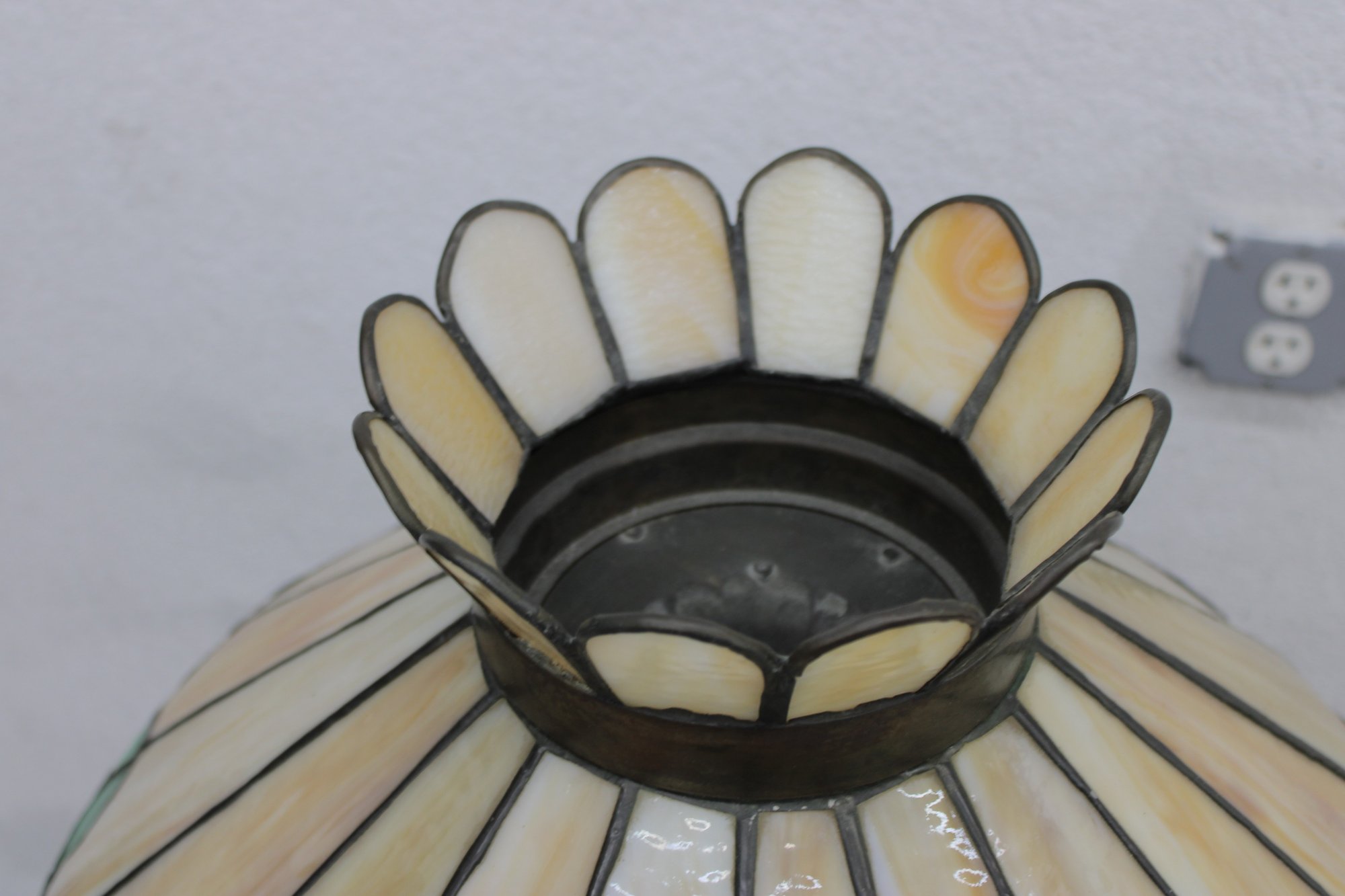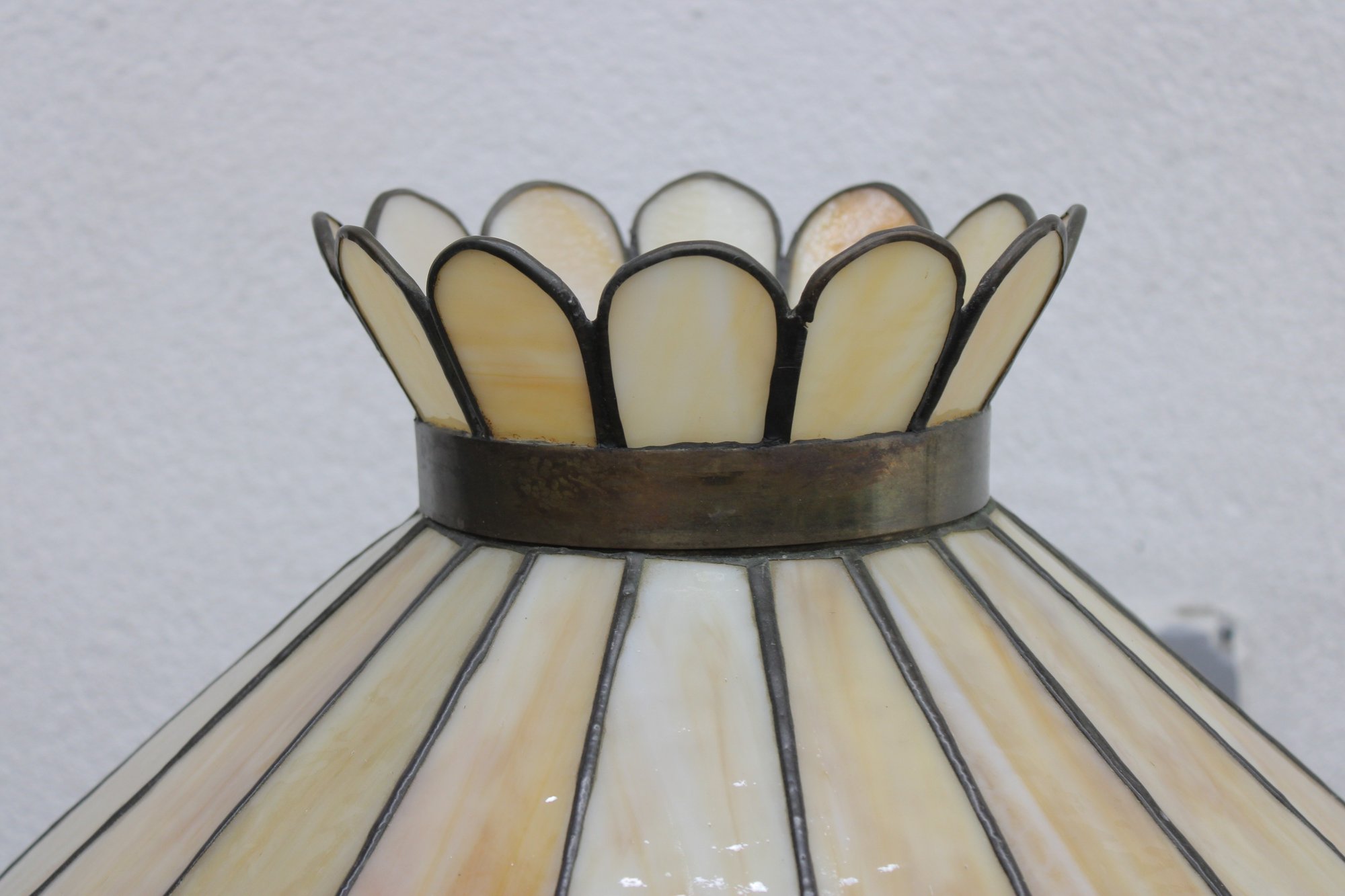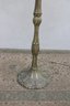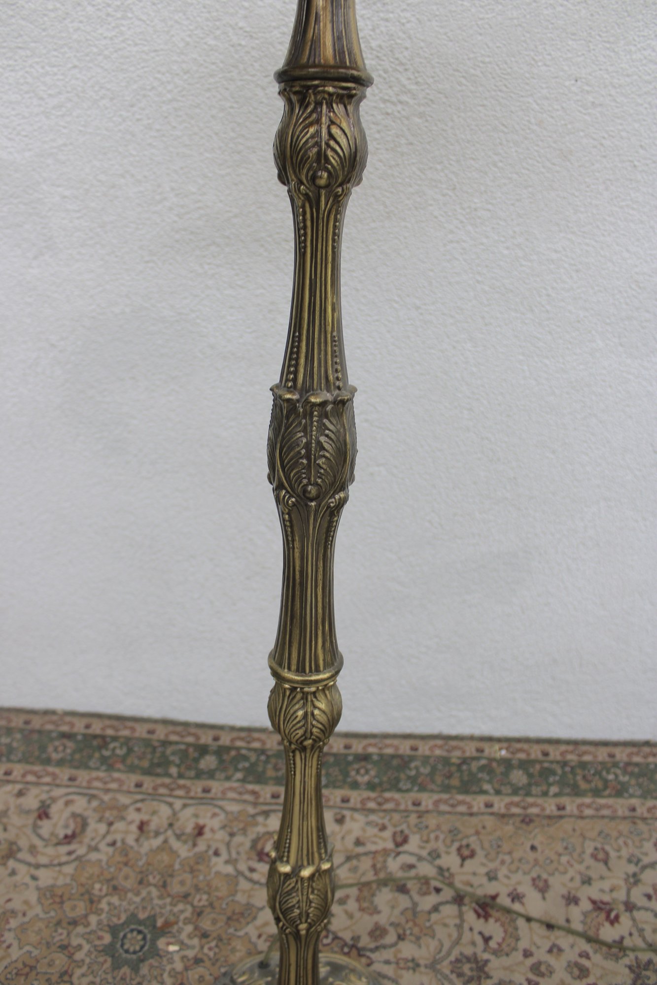 The base is equally impressive — tall, elegant, and heavily detailed with flowing lines and decorative relief work in an antique brass finish. This lamp blends beautifully with vintage, traditional, Arts & Crafts, or eclectic interiors.
