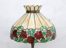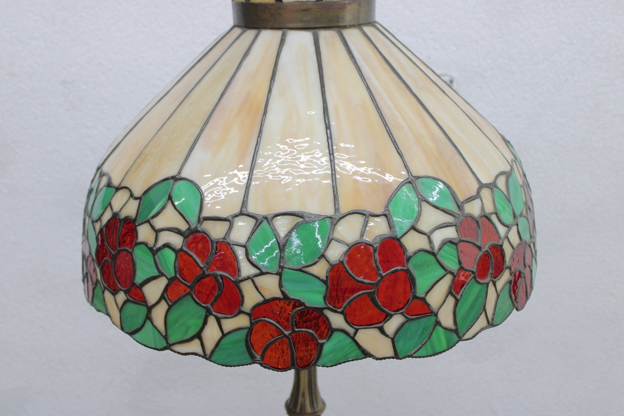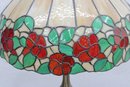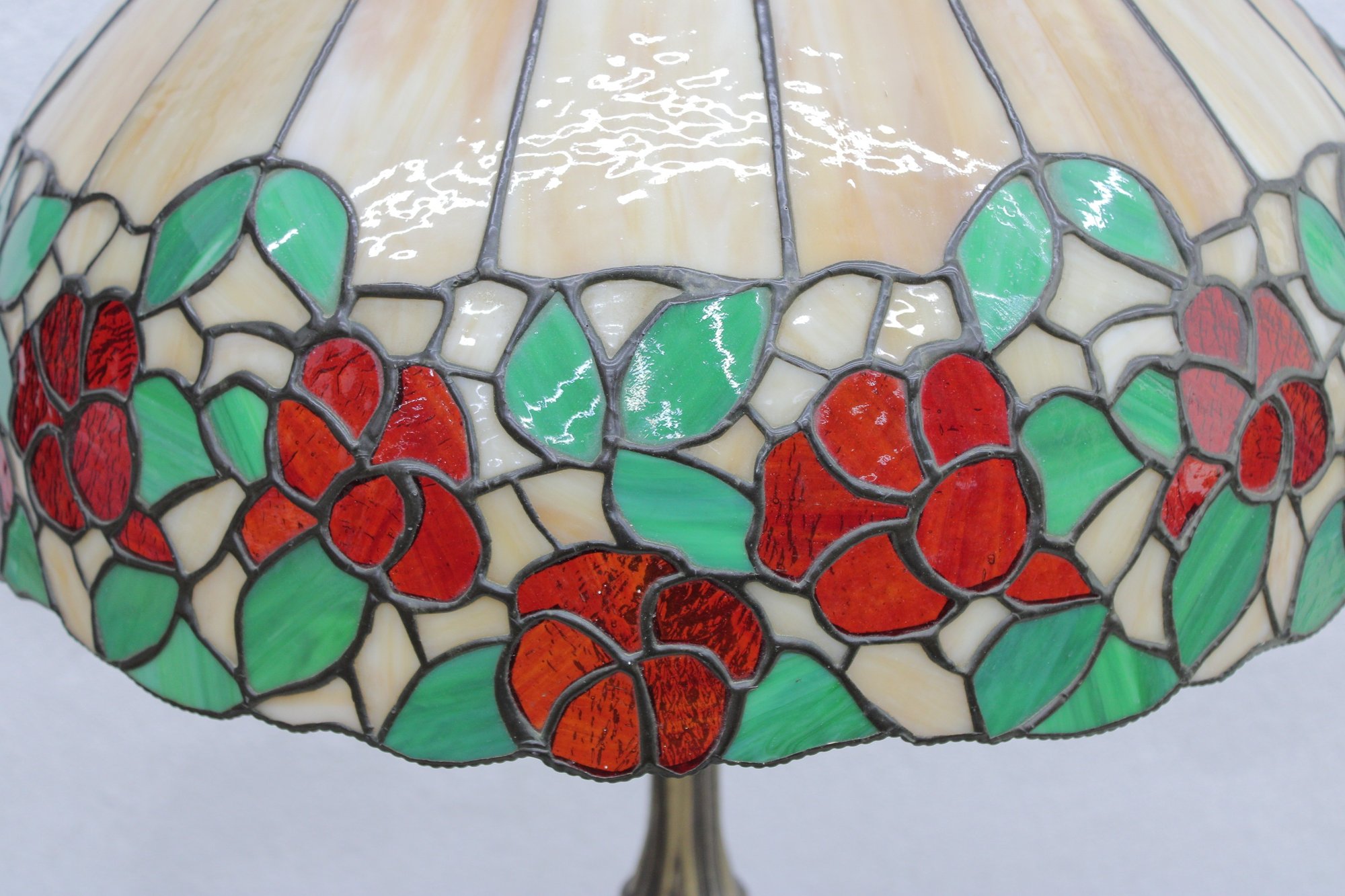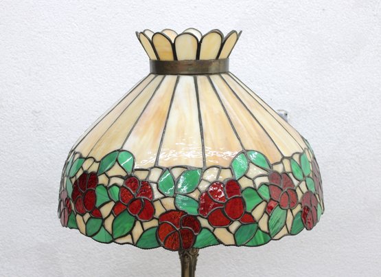 The domed shade showcases a band of lush red and orange flowers with green leaves encircling the lower edge, set against creamy opalescent glass panels that glow warmly when lit. The crown-style top cap and scalloped upper detail add to the traditional Art Nouveau / early 20th-century inspired look.