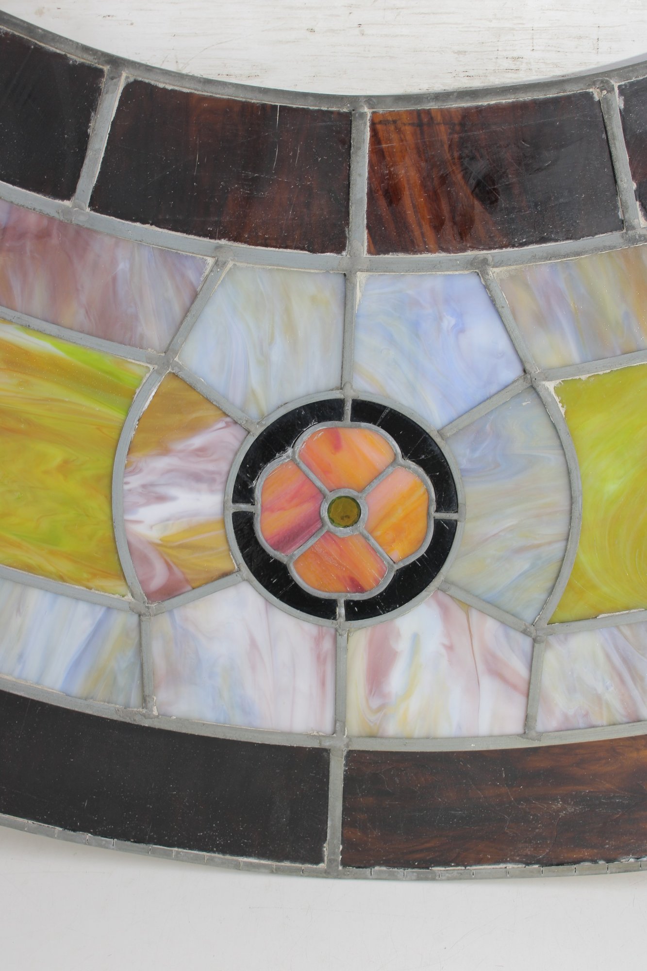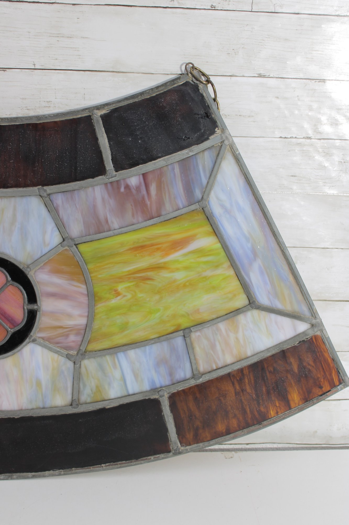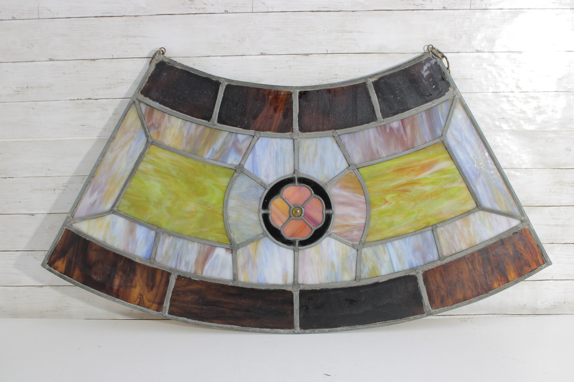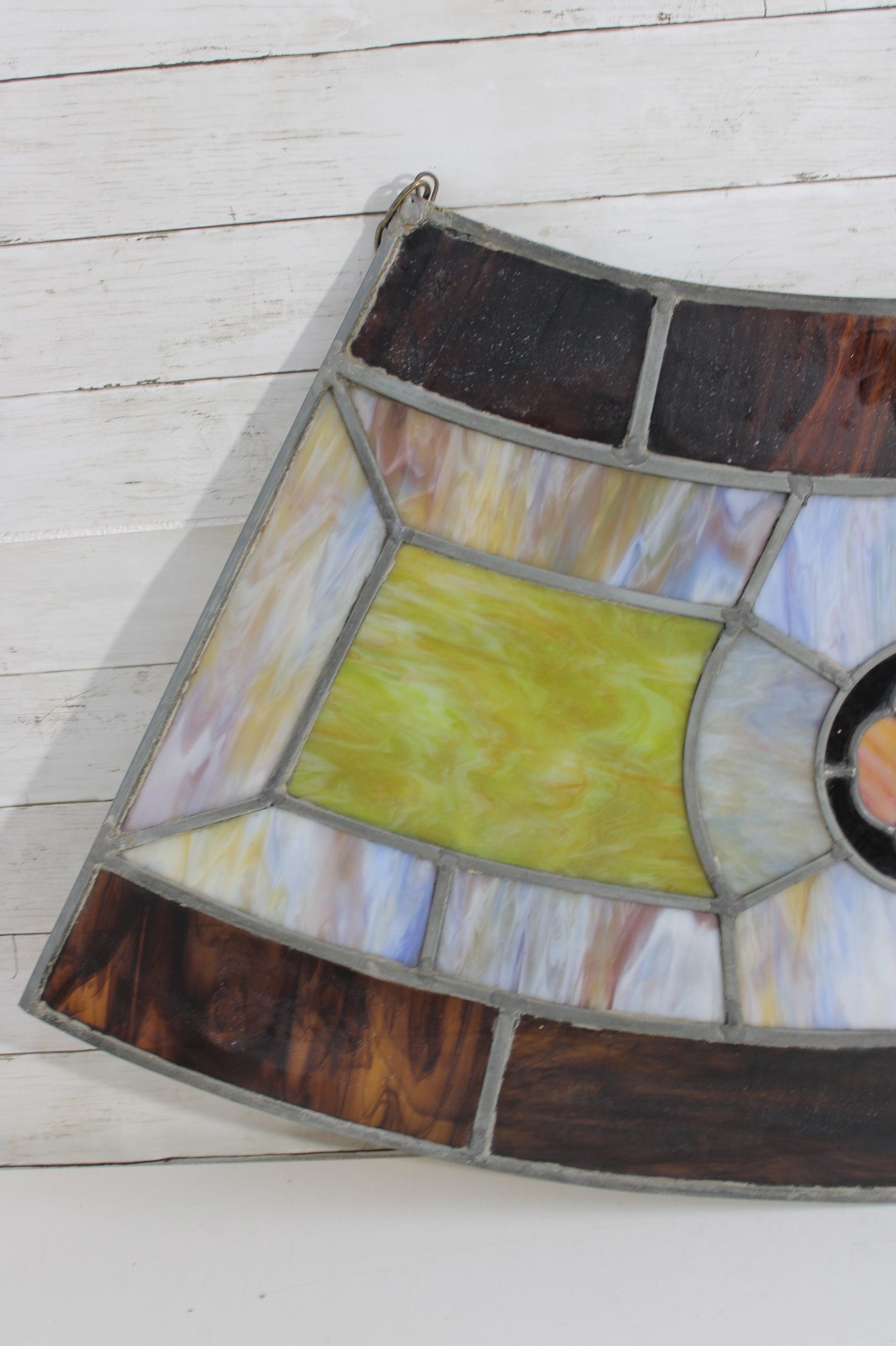 Tiffany style panel featuring a graceful curved design and glowing sunburst center medallion. This piece has the look of a classic transom window and makes an incredible architectural statement on any wall.