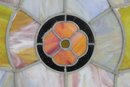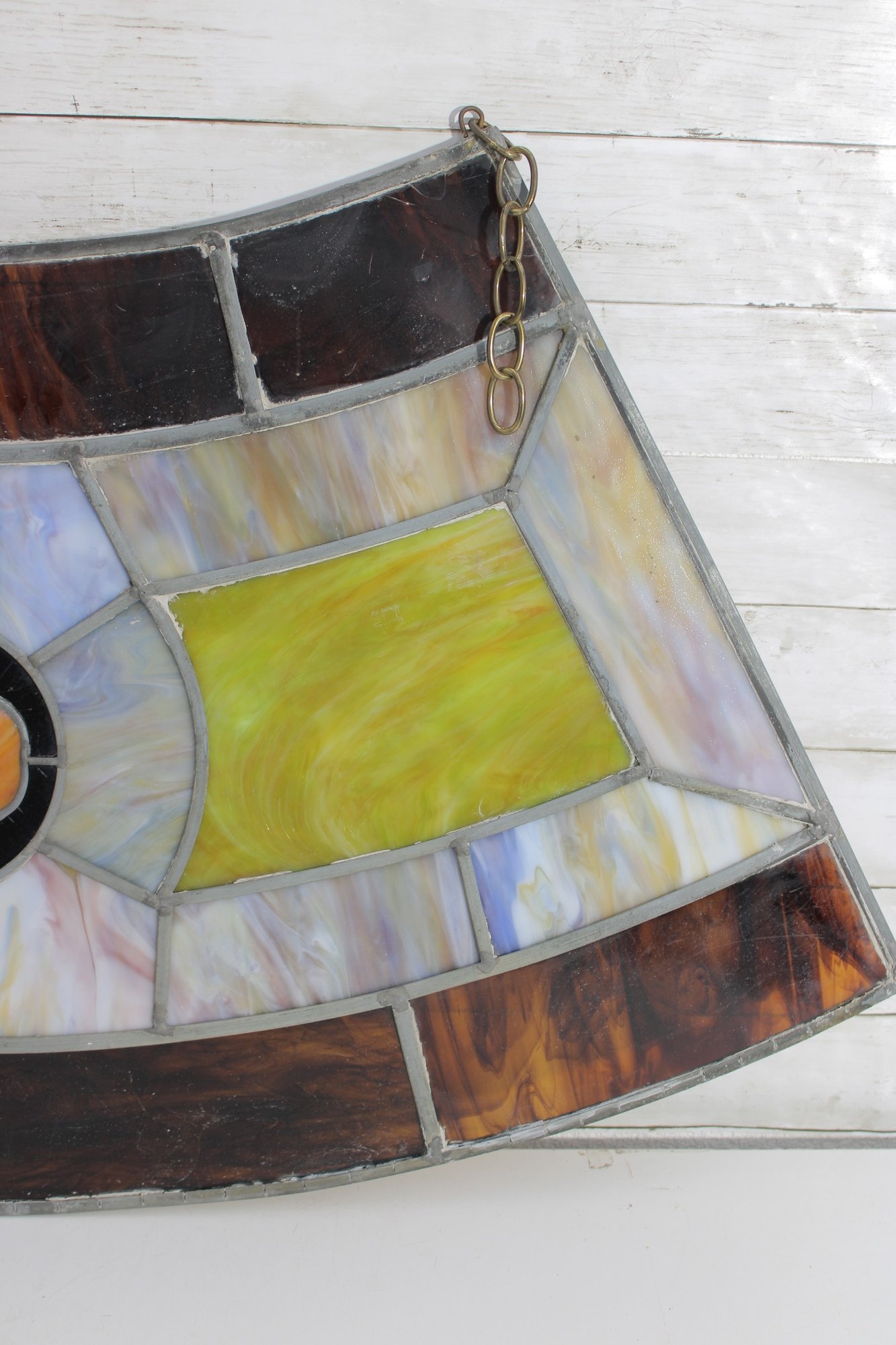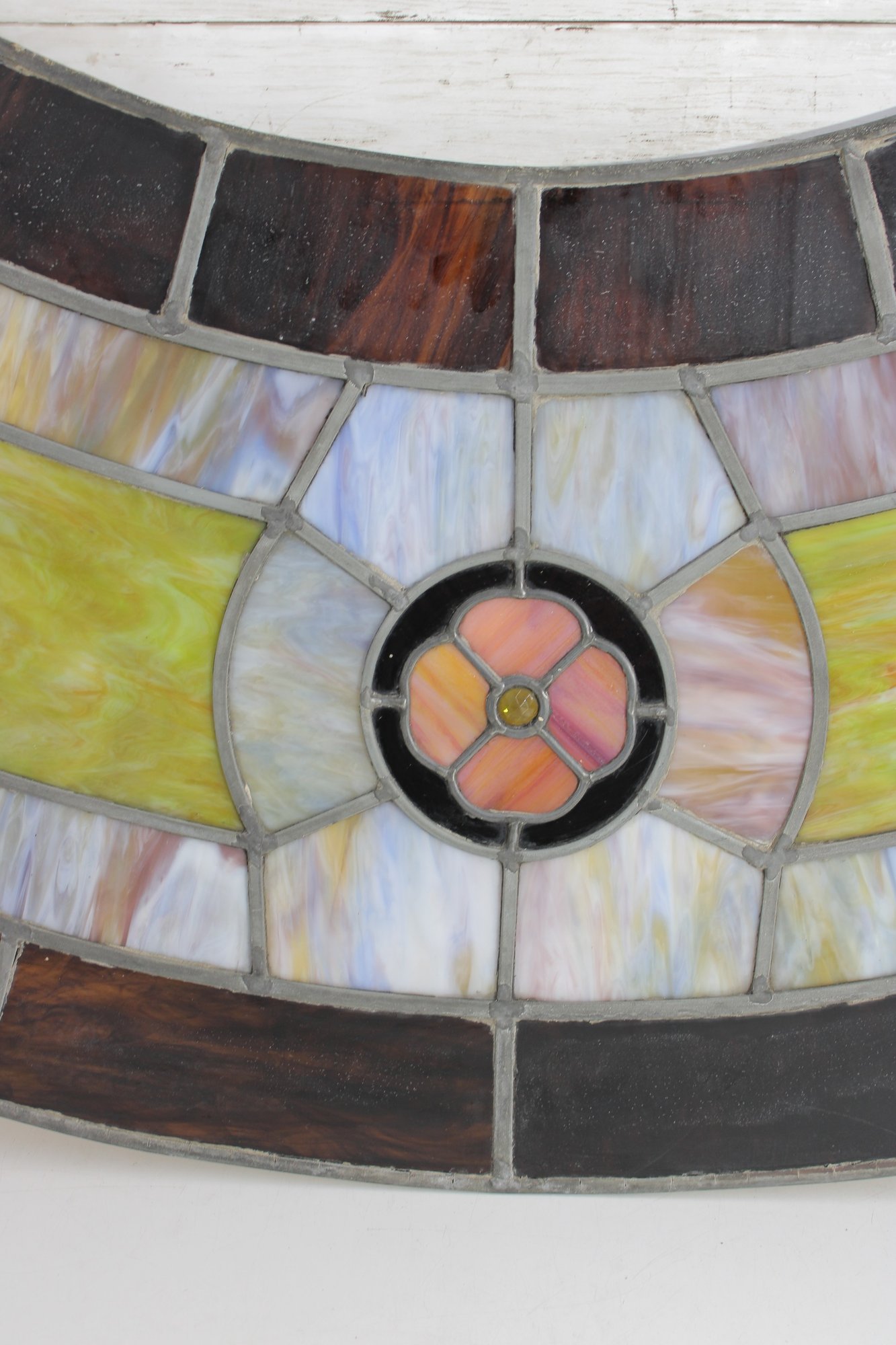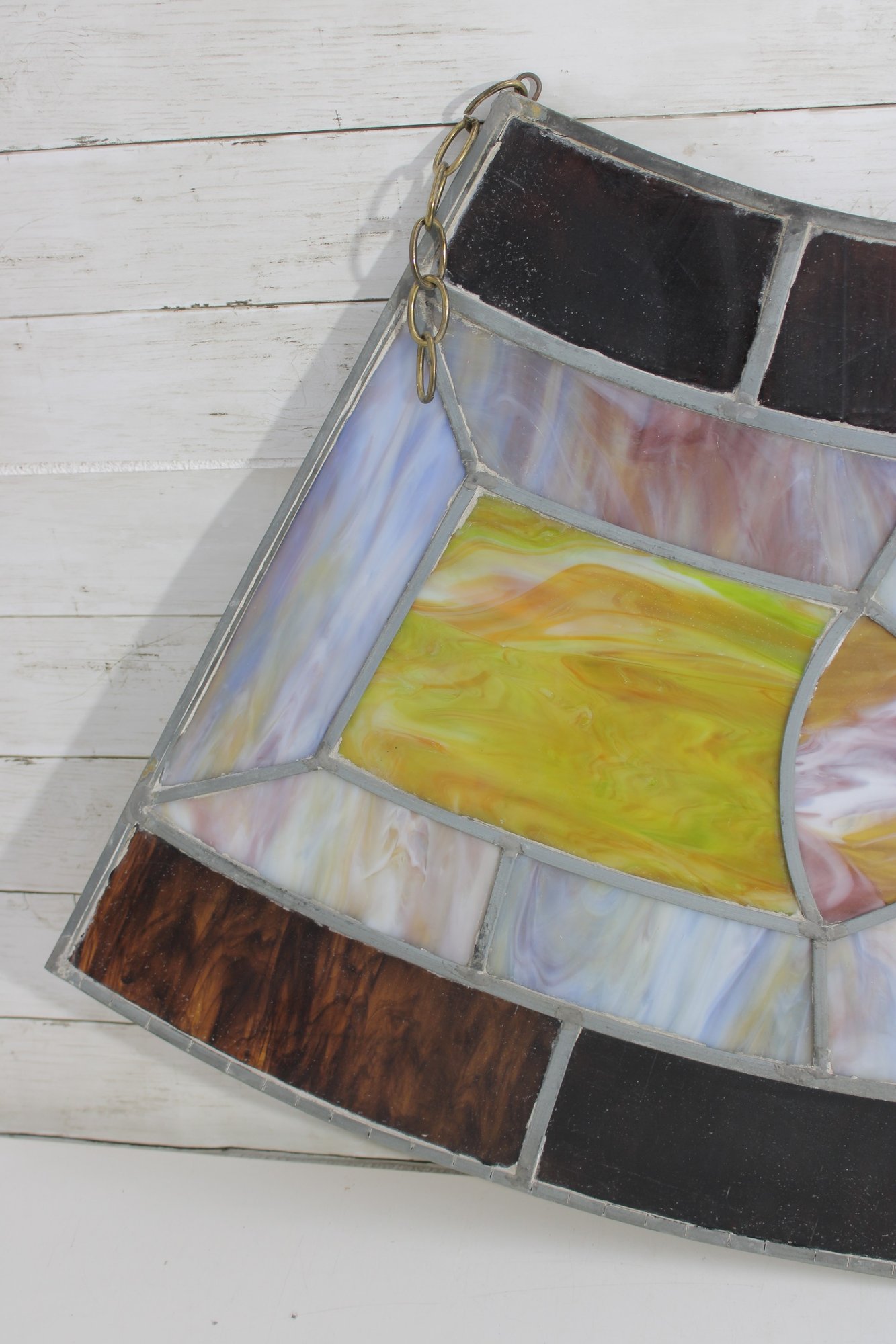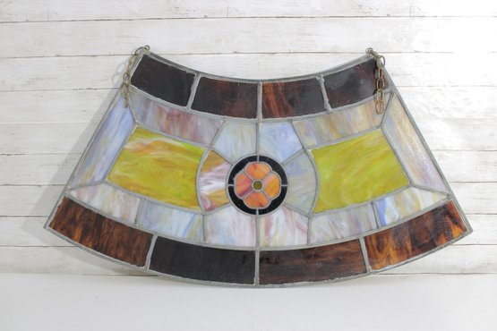 Tiffany style panel featuring a graceful curved design and glowing sunburst center medallion. This piece has the look of a classic transom window and makes an incredible architectural statement on any wall.