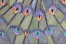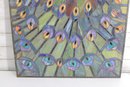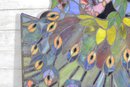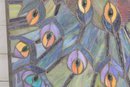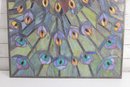 . The composition showcases a majestic peacock with its tail fully fanned, accented by lush florals and rich jewel tones of blue, green, purple, and gold. Each “feather” is rendered with eye-like detailing, creating beautiful depth and movement across the piece.