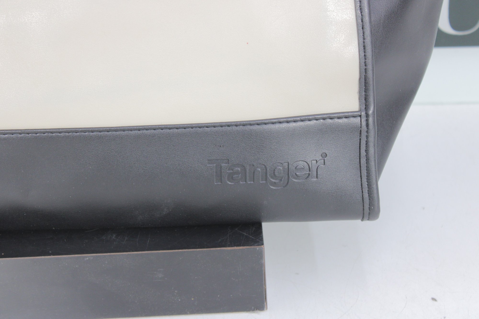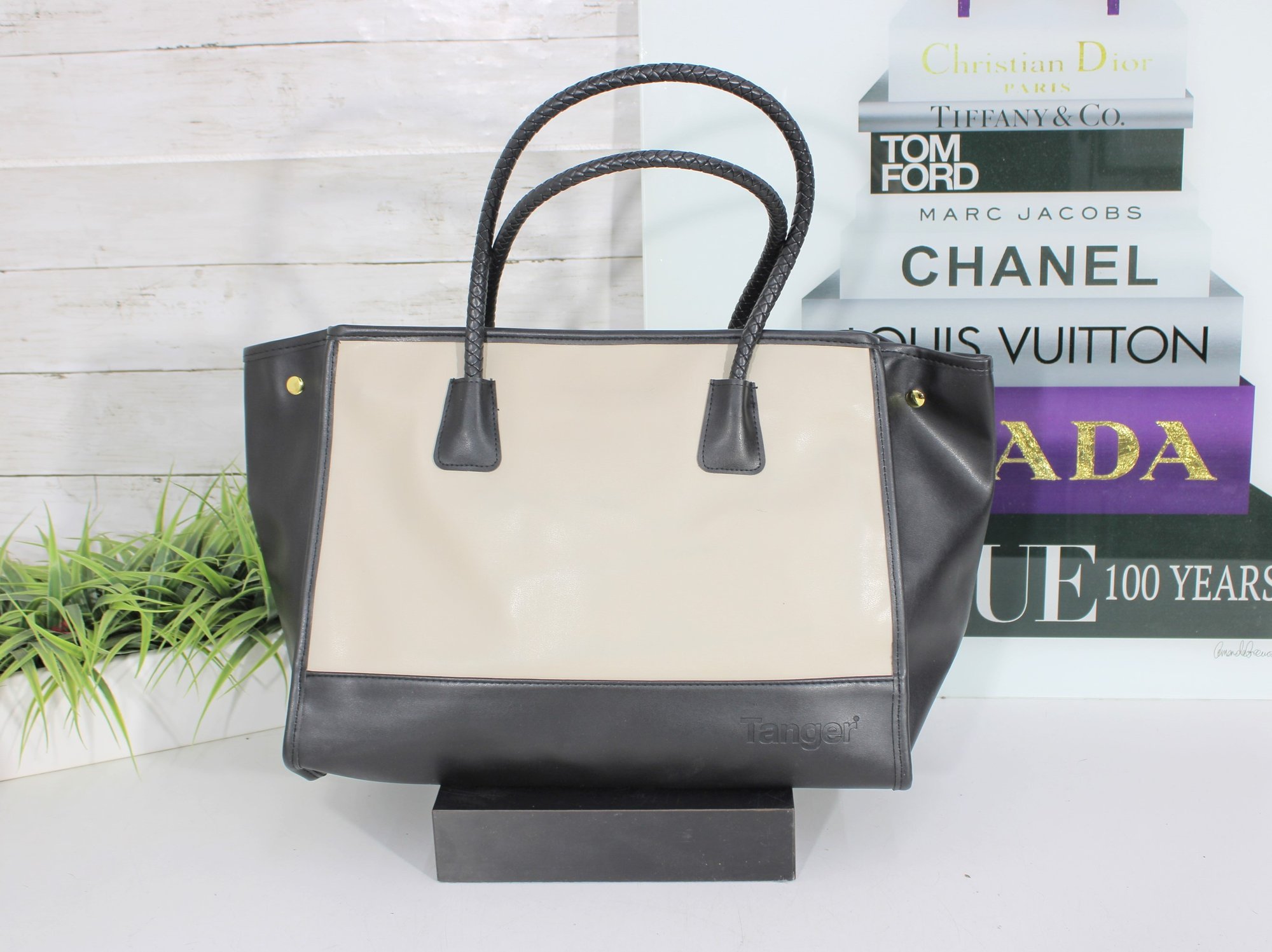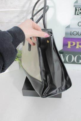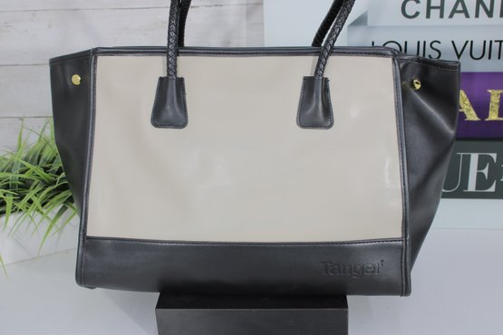 a sophisticated Tignanello “Tanger” leather tote handbag in a timeless black and taupe color block design. This structured tote offers a clean, modern silhouette with classic craftsmanship.