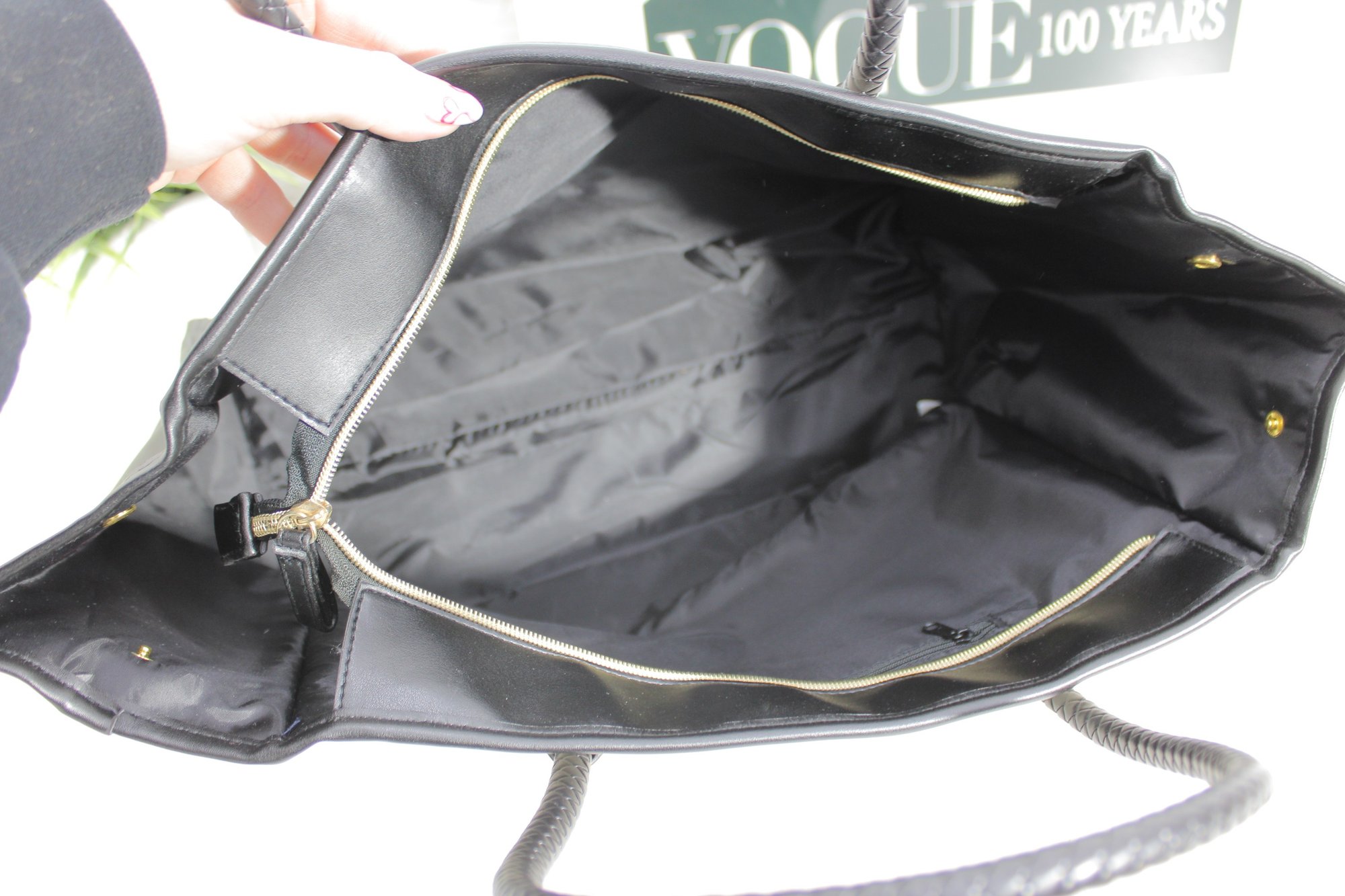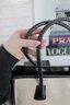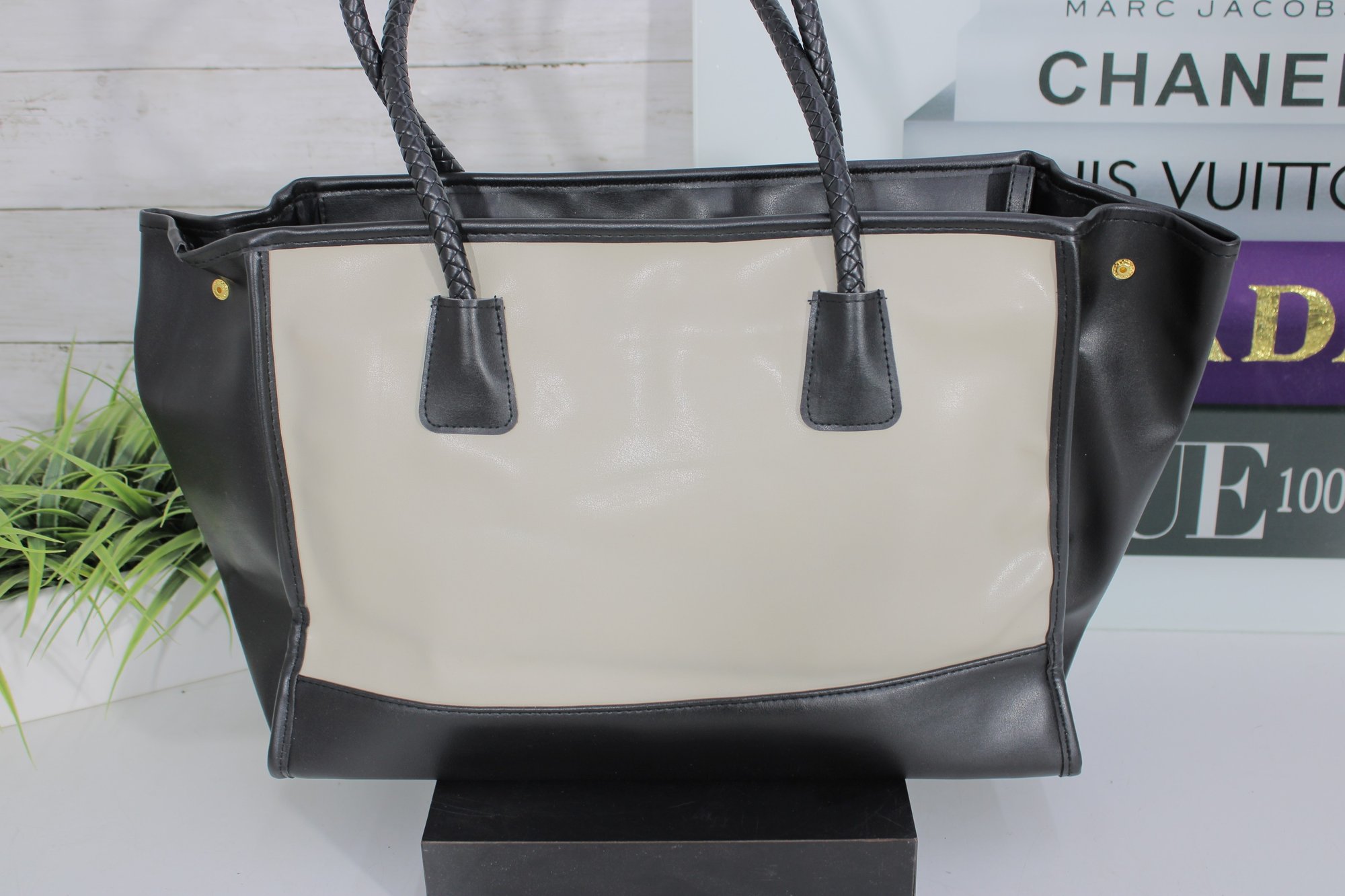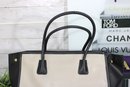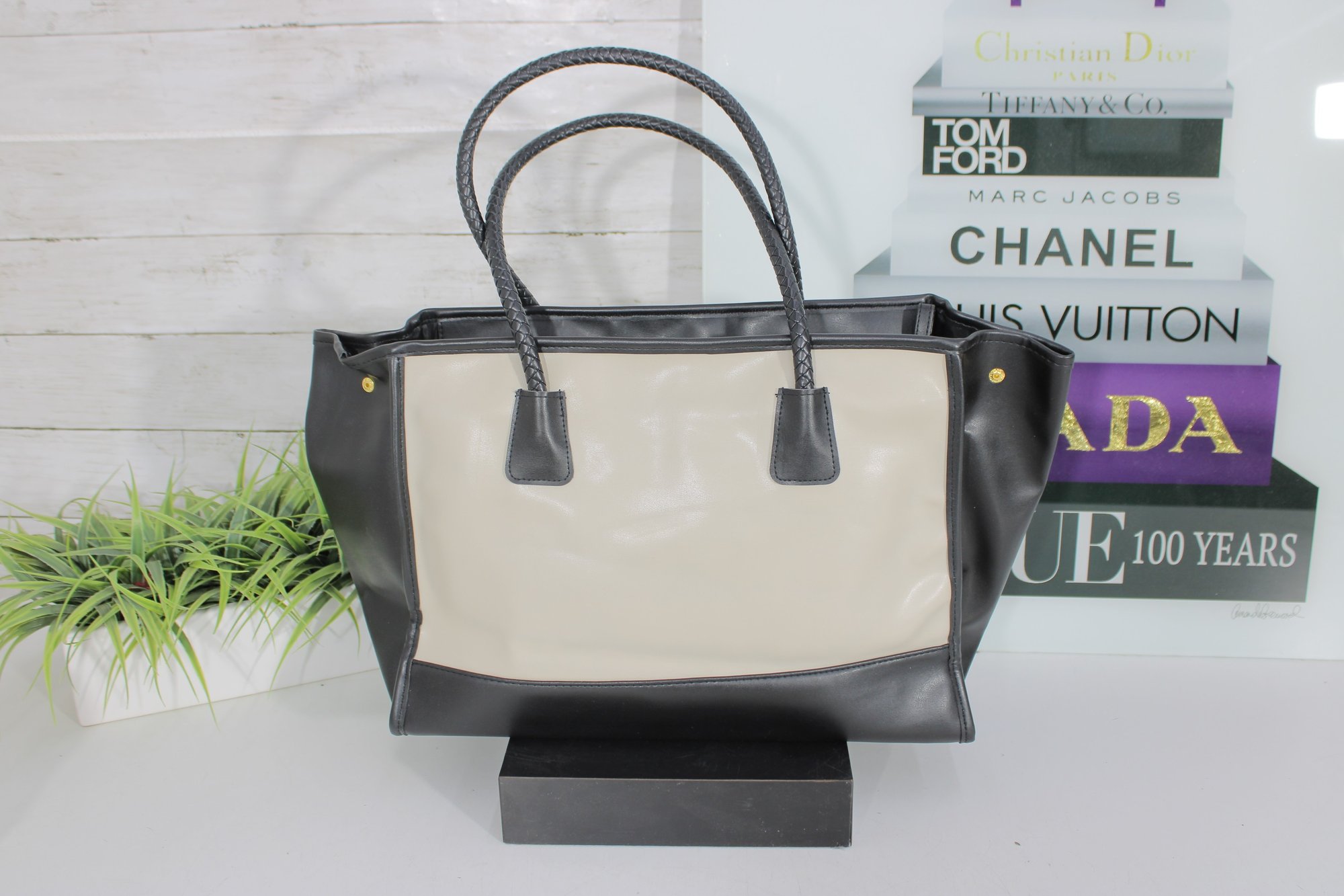 a sophisticated Tignanello “Tanger” leather tote handbag in a timeless black and taupe color block design. This structured tote offers a clean, modern silhouette with classic craftsmanship.