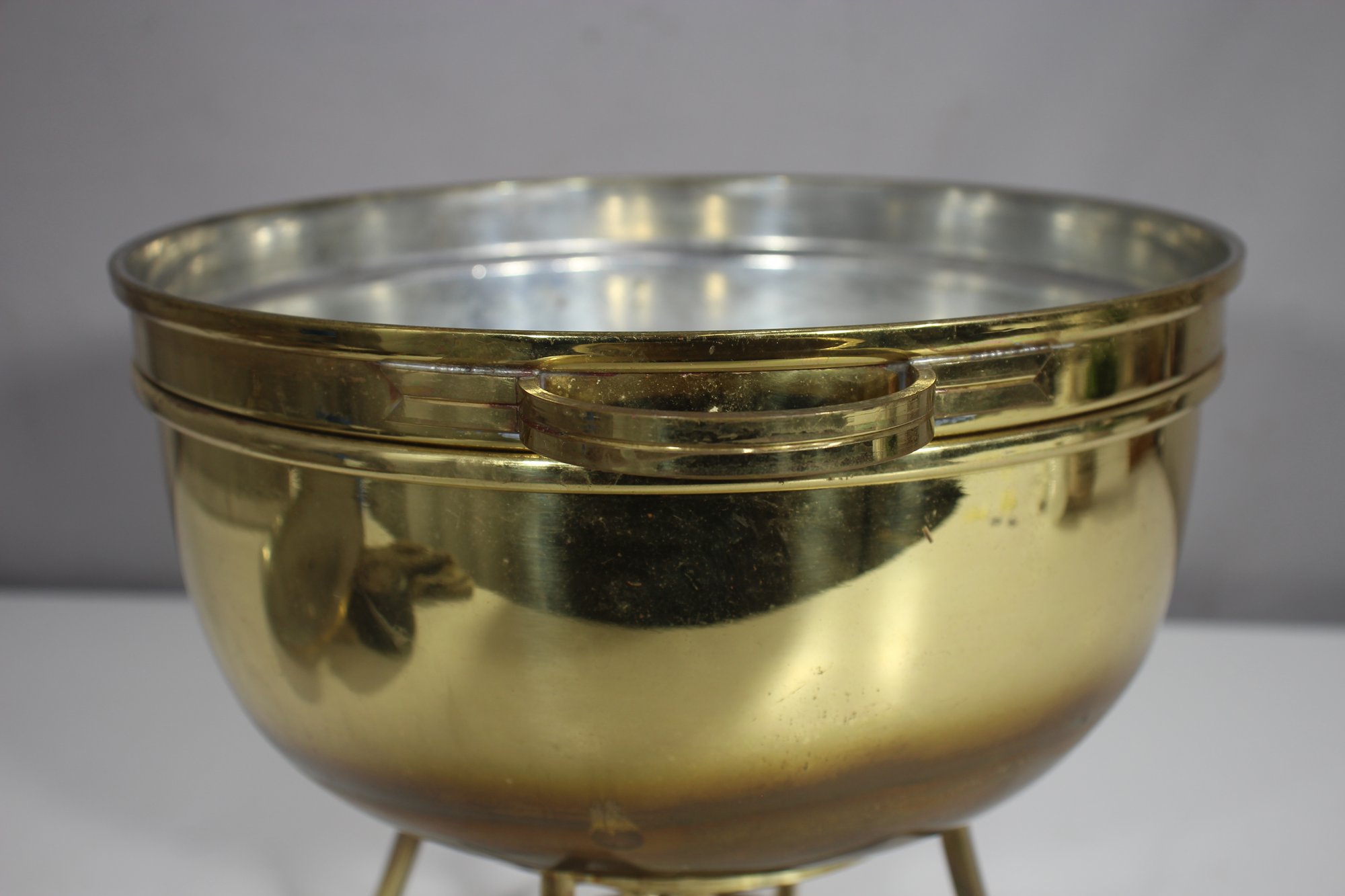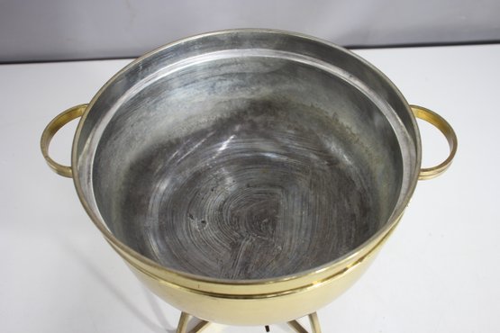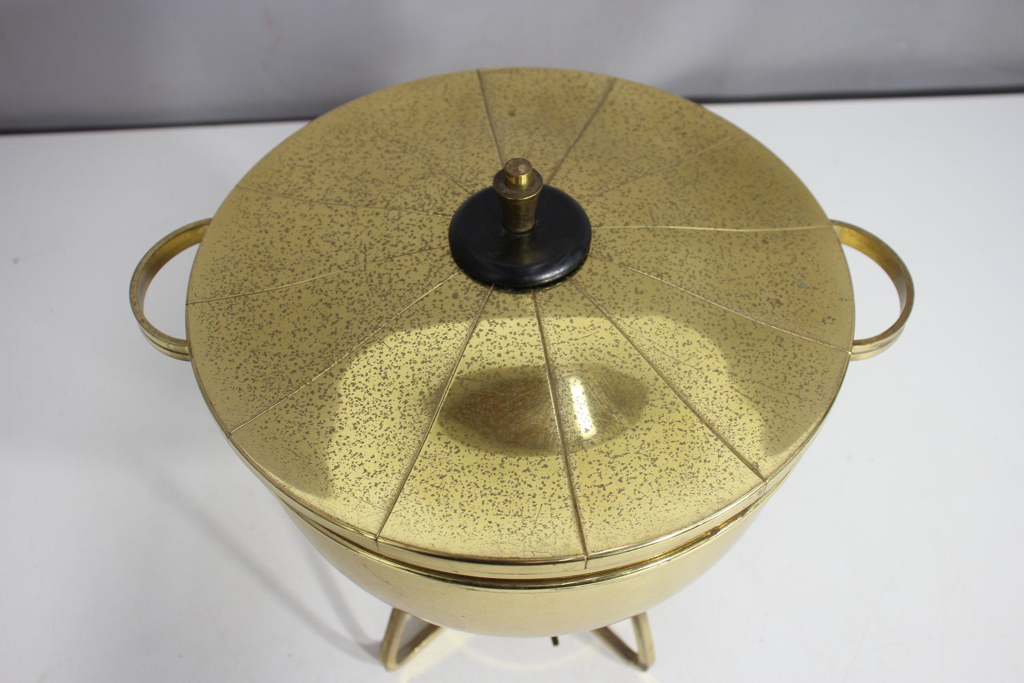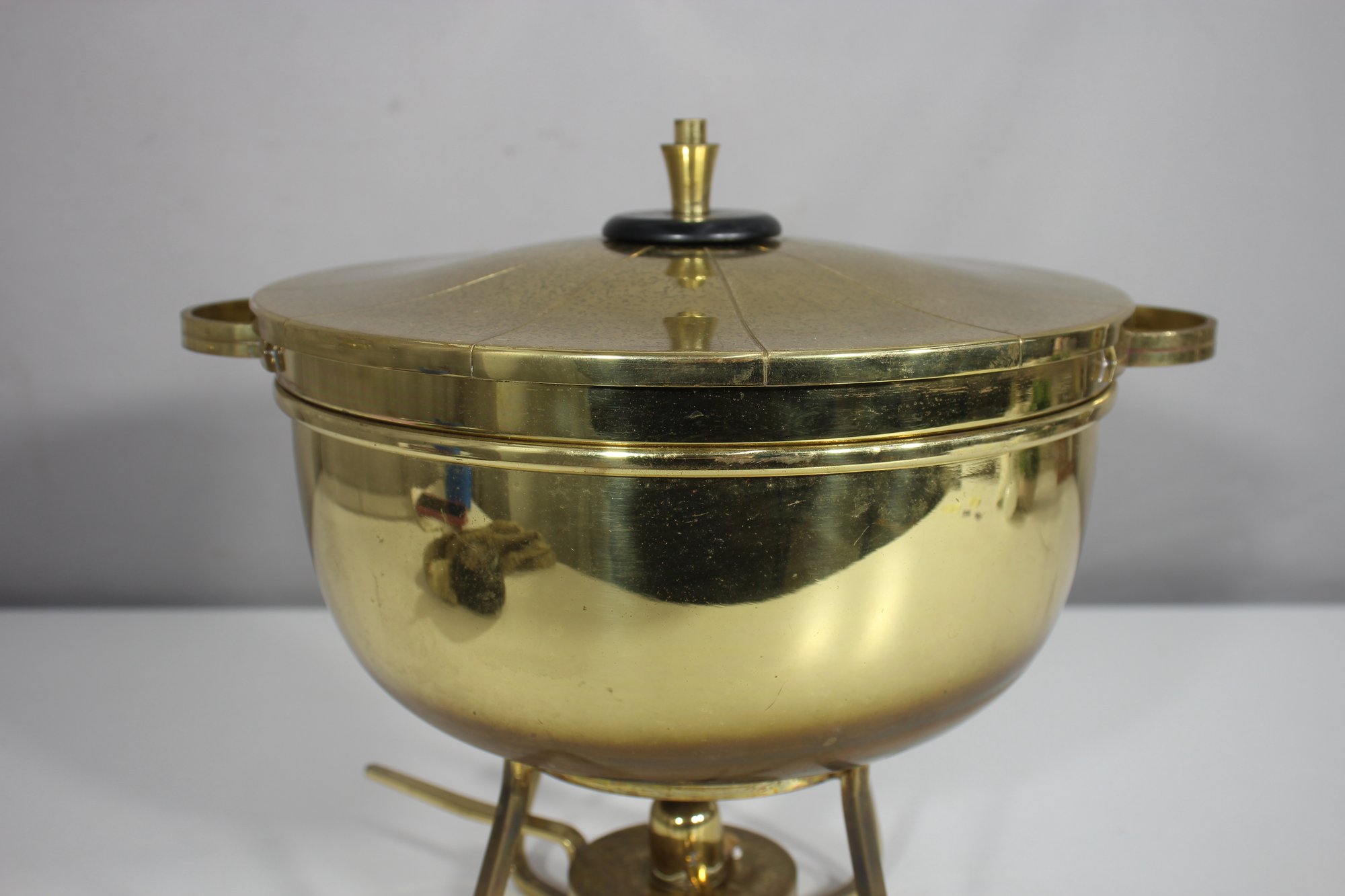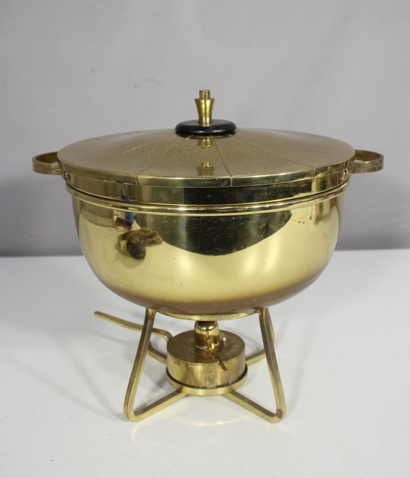 A stunning mid-century modern brass chafing dish Tommi Parzinger, featuring a sleek, polished design with a textured brass lid, black knob handle, and tripod warming stand. This sophisticated serving piece embodies the refined elegance of Hollywood Regency and Mid-Century Modern design, making it a stylish addition to any collection.