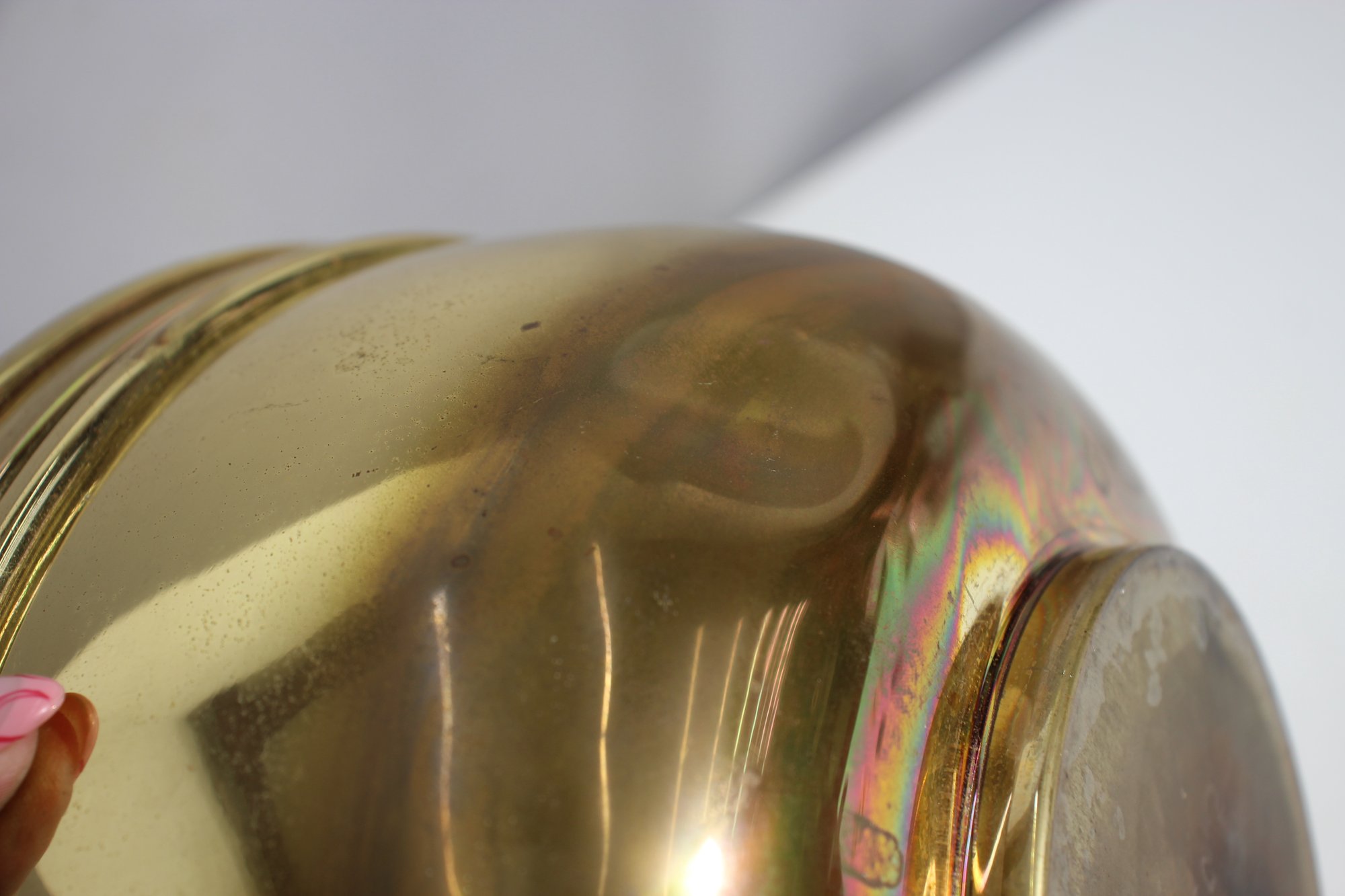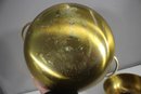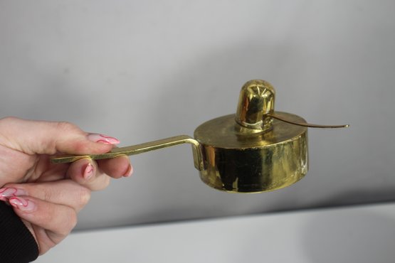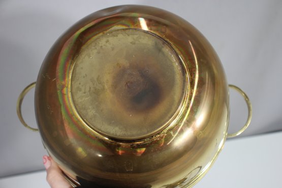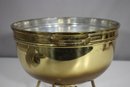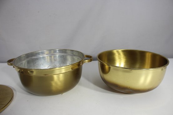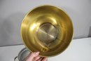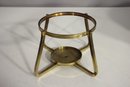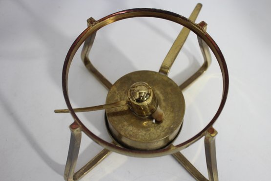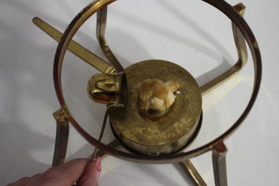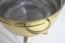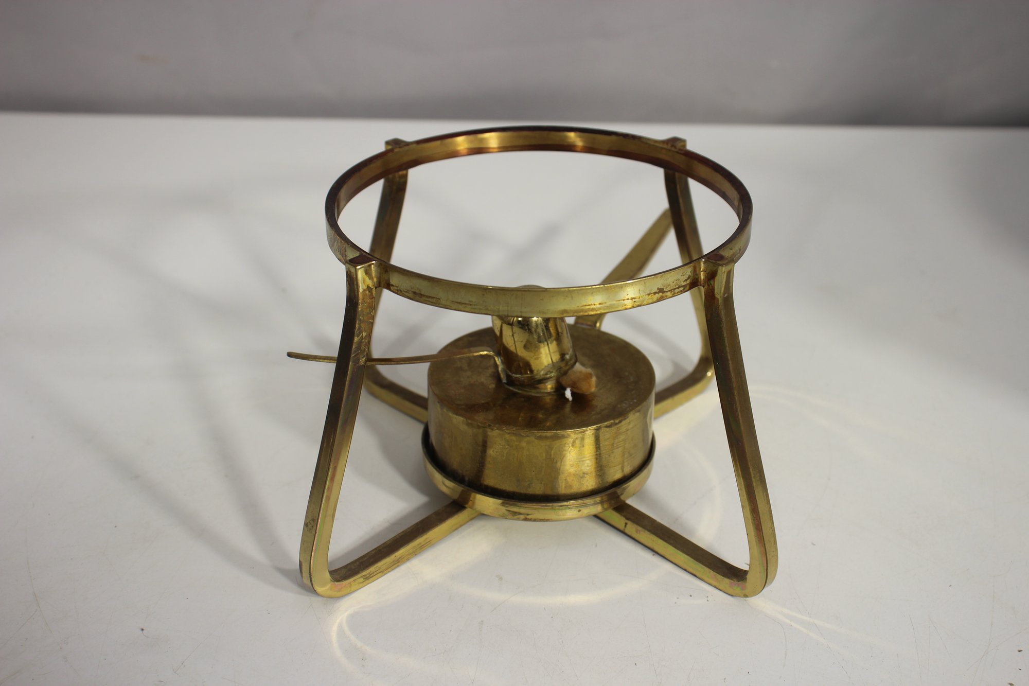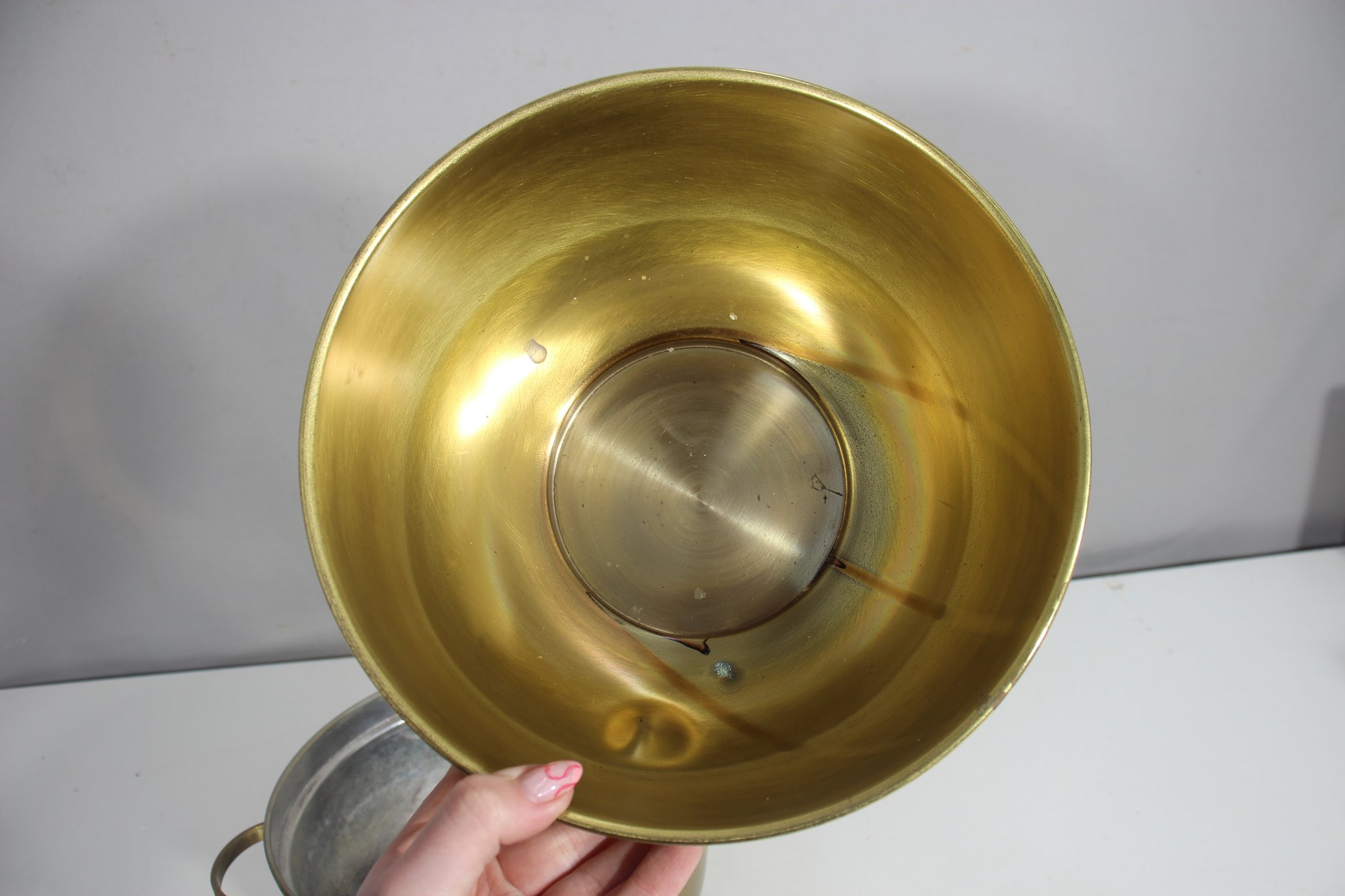 A stunning mid-century modern brass chafing dish Tommi Parzinger, featuring a sleek, polished design with a textured brass lid, black knob handle, and tripod warming stand. This sophisticated serving piece embodies the refined elegance of Hollywood Regency and Mid-Century Modern design, making it a stylish addition to any collection.