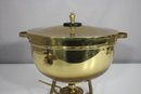 The chafing dish is designed with side handles for easy serving, a removable liner for functionality, and a brass burner stand for keeping food warm at gatherings.