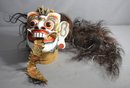 his mask features a fearsome yet majestic face, adorned with bold colors and intricate patterns that capture the essence of the mythological creature it represents. The Barong is considered a guardian spirit in Balinese culture, and masks like this one are used in ritual dances that depict the battle between good and evil. The mask's elaborate details include high-contrast red and white paint around the eyes and mouth, signifying power and protection. Gold leaf accents create a regal appearance, while real hair is attached to the mask for a lifelike effect, giving the piece a dynamic and potent charm.