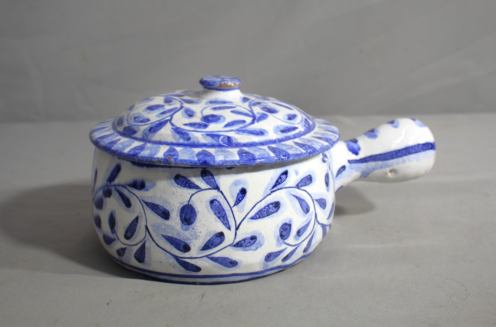 This is a beautifully crafted ceramic saucepan that exudes a charming traditional aesthetic with its vibrant blue and white color palette. The piece features a captivating floral pattern that wraps around its body and lid, with splashes of cobalt blue providing a stark and appealing contrast against the white background. The glaze has a slight speckle, giving it a rustic, handmade appeal.