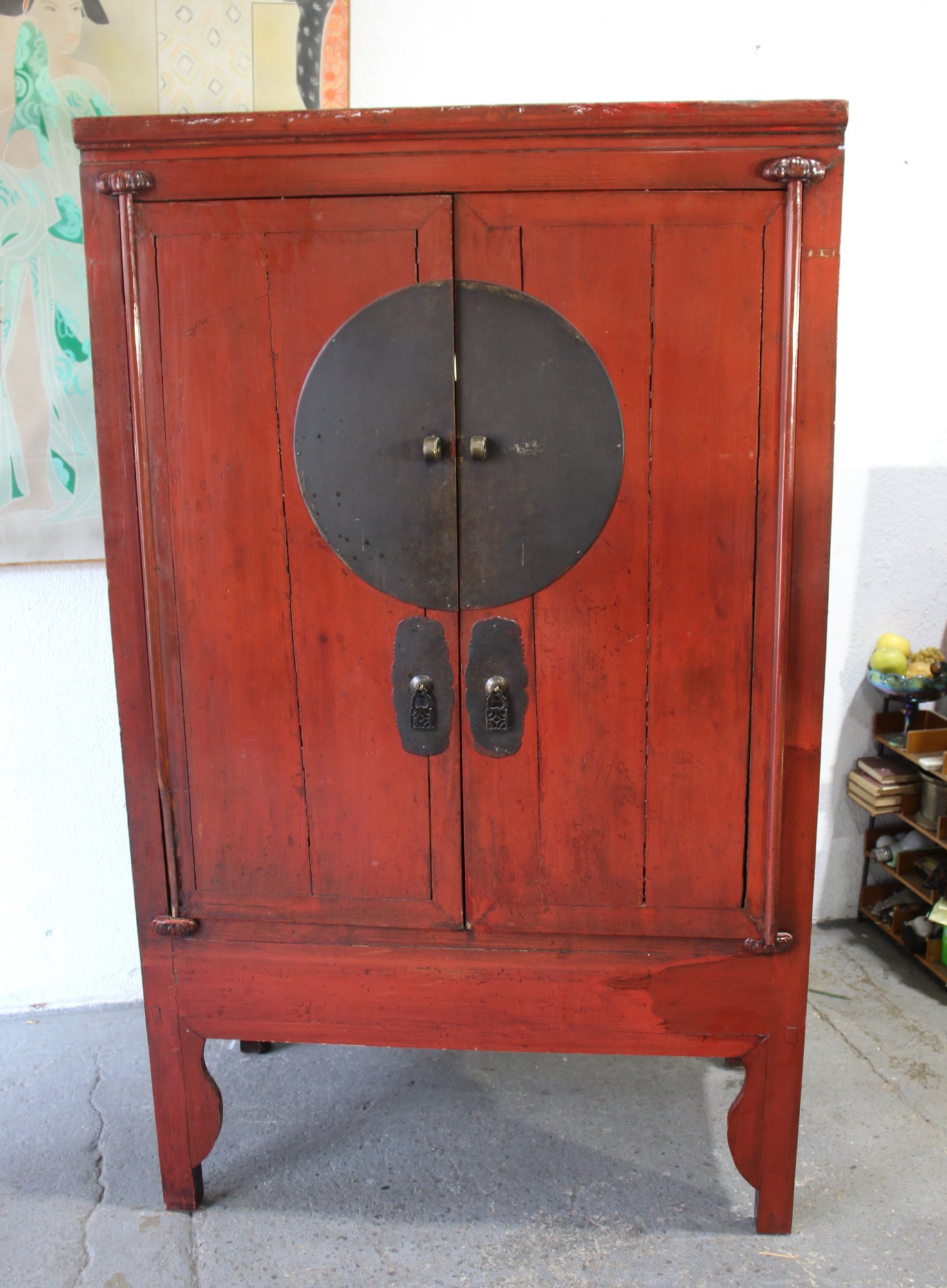 This striking piece features a vibrant red finish that exemplifies classic Chinese aesthetic and craftsmanship. The cabinet is adorned with unique circular central hardware and traditional Chinese lock plates, providing a distinct and culturally rich appeal. With ample interior space