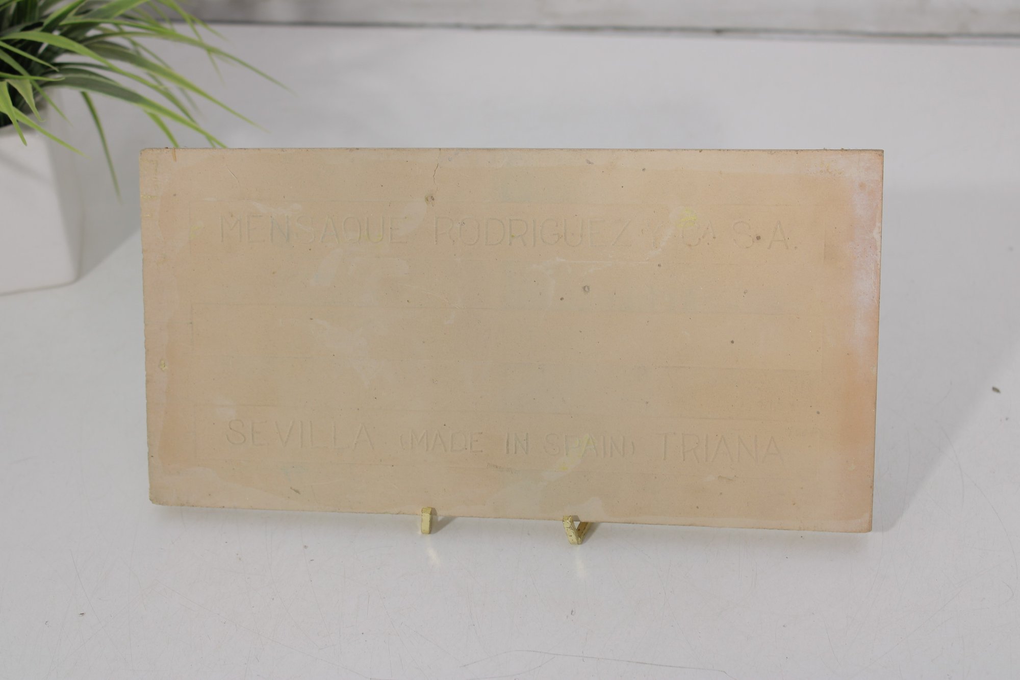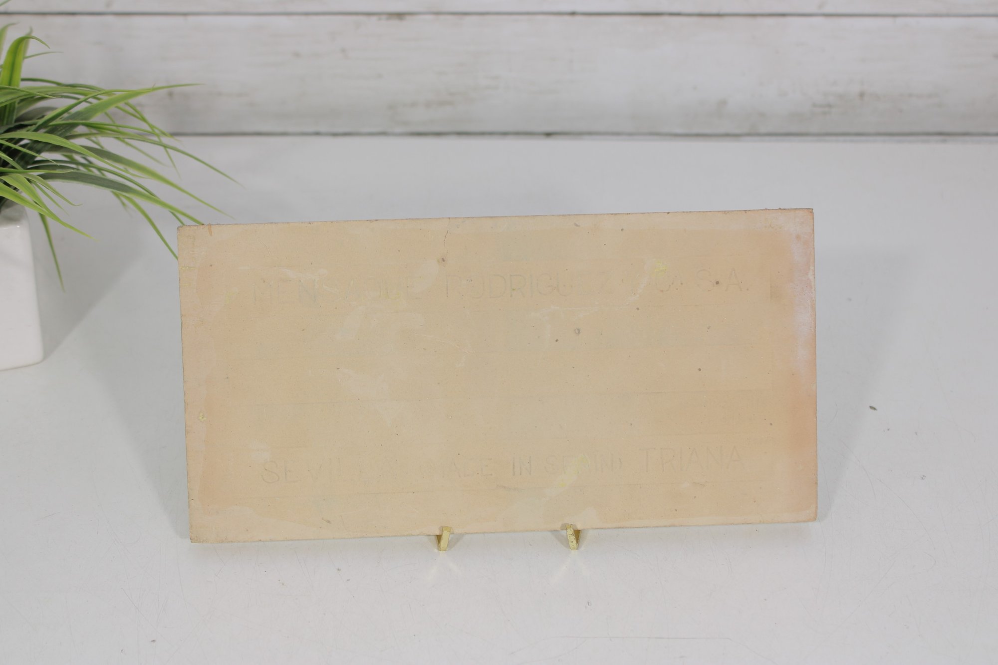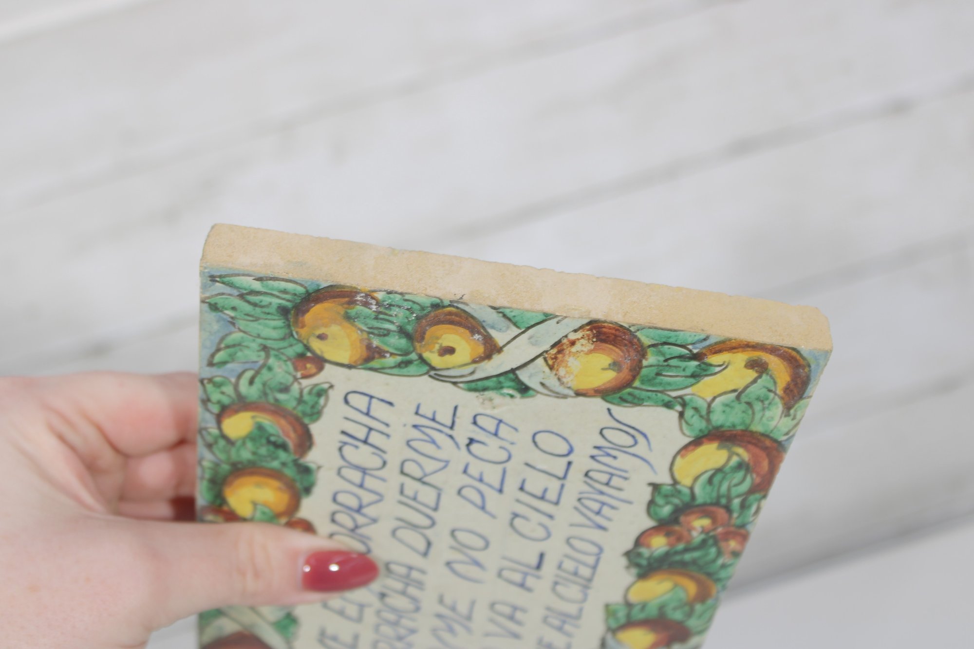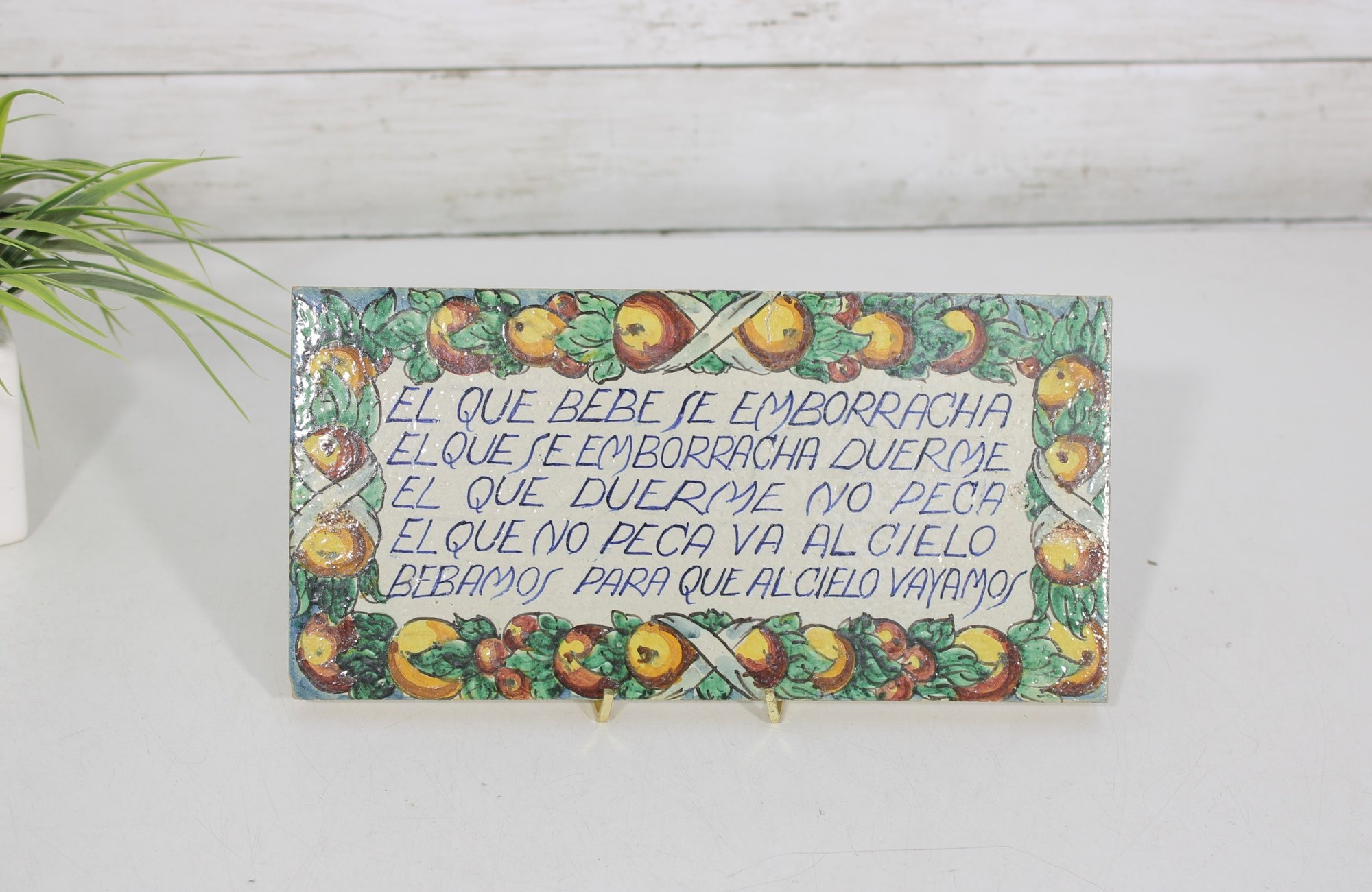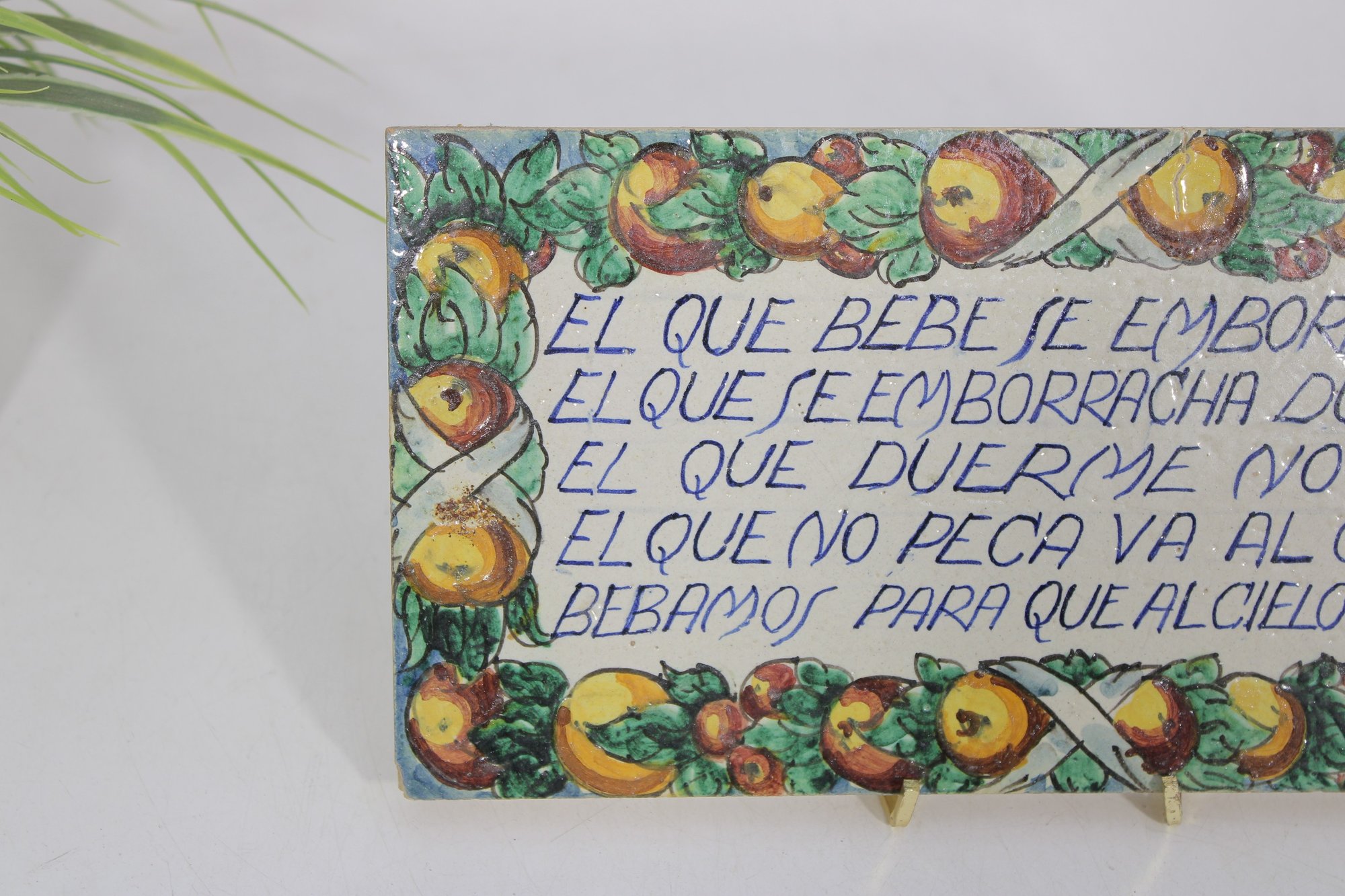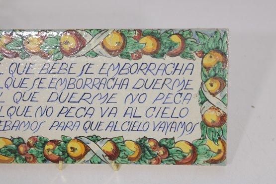 Colorful traditional hand-painted Spanish ceramic tile plaque featuring a playful proverb about drinking, sleeping, and salvation. The center text is framed by a vibrant fruit and foliage border in rich greens, yellows, oranges, and reds, giving the piece classic Mediterranean charm.
