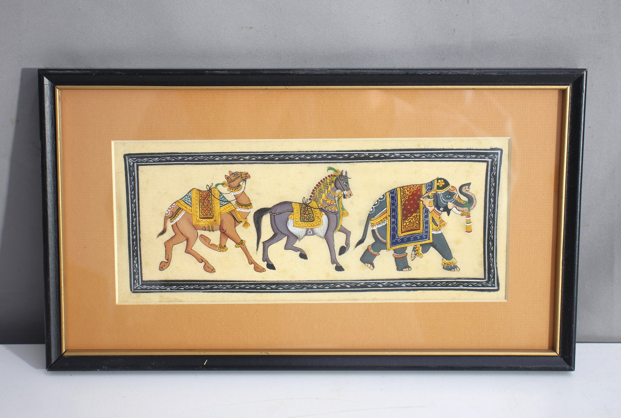 This vibrant and detailed Indian miniature painting showcases a traditional royal procession featuring an elephant, horse, and camel, each adorned with richly designed saddles and ornamental harnesses. The intricate detailing of the animals and their ornate decorations reflects the mastery of traditional Indian art, making this piece a stunning representation of cultural heritage.