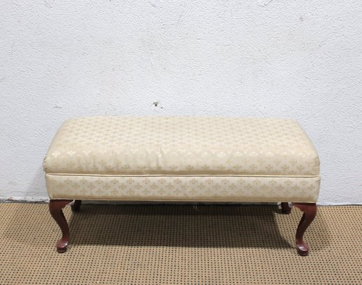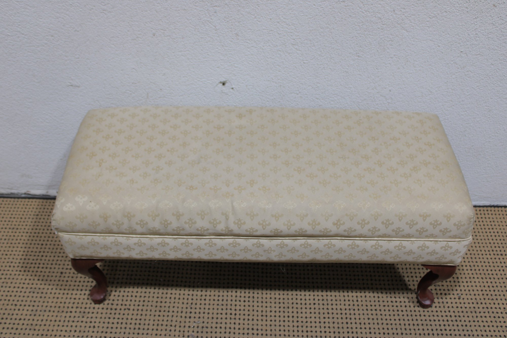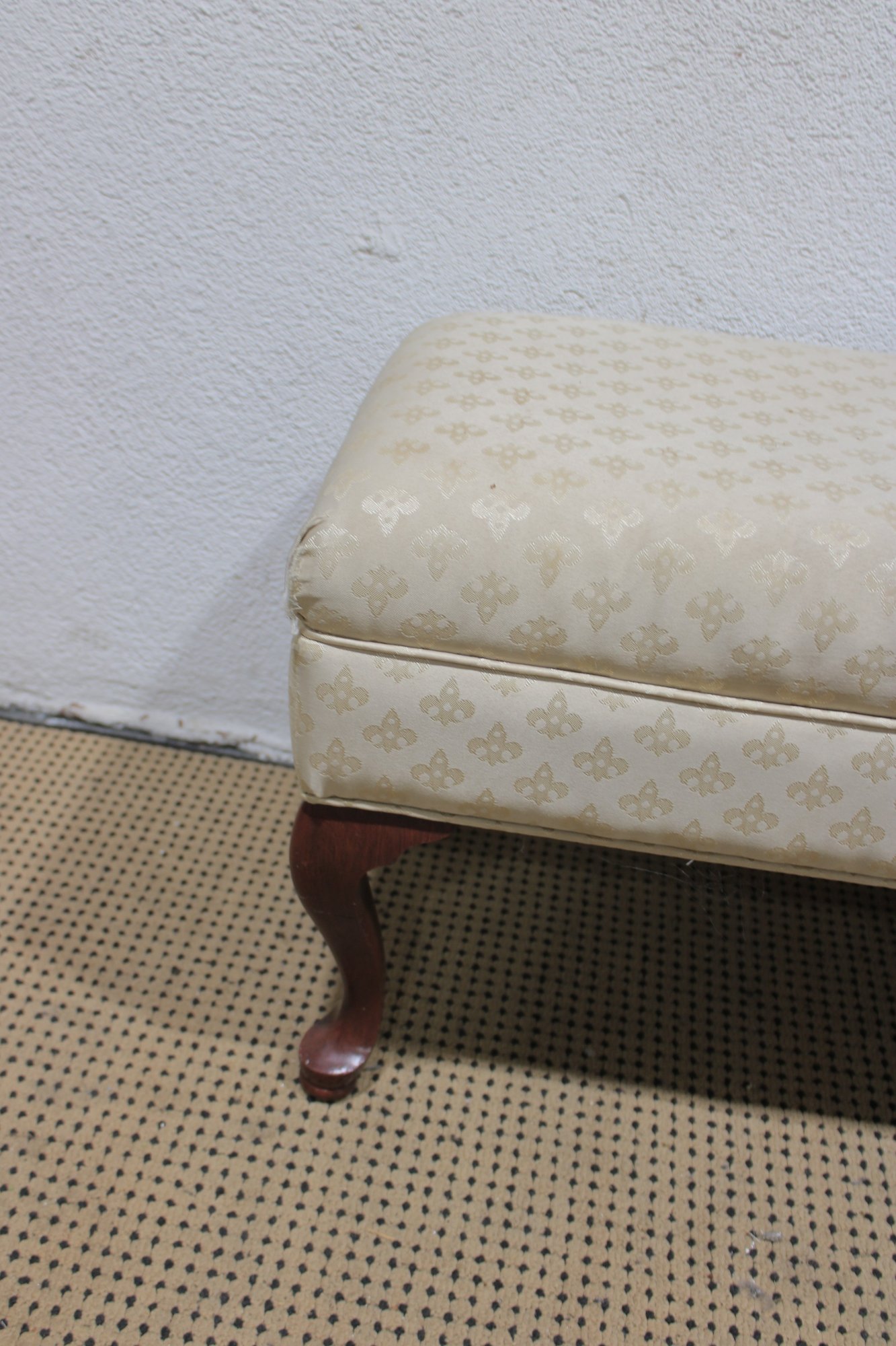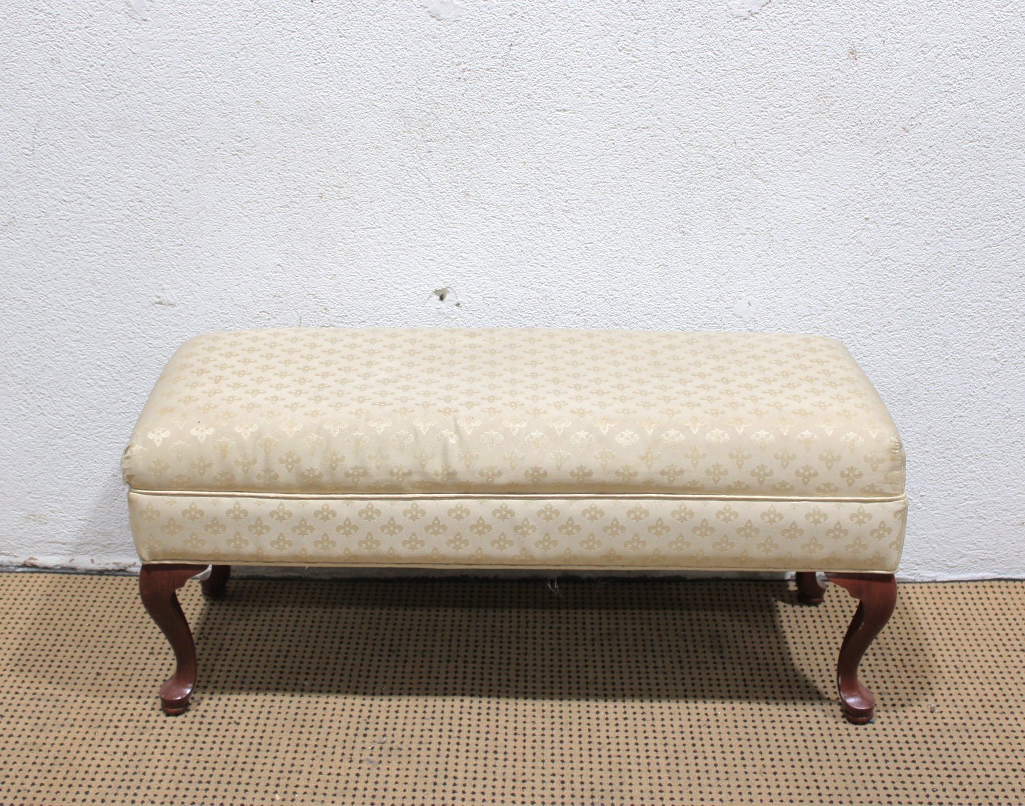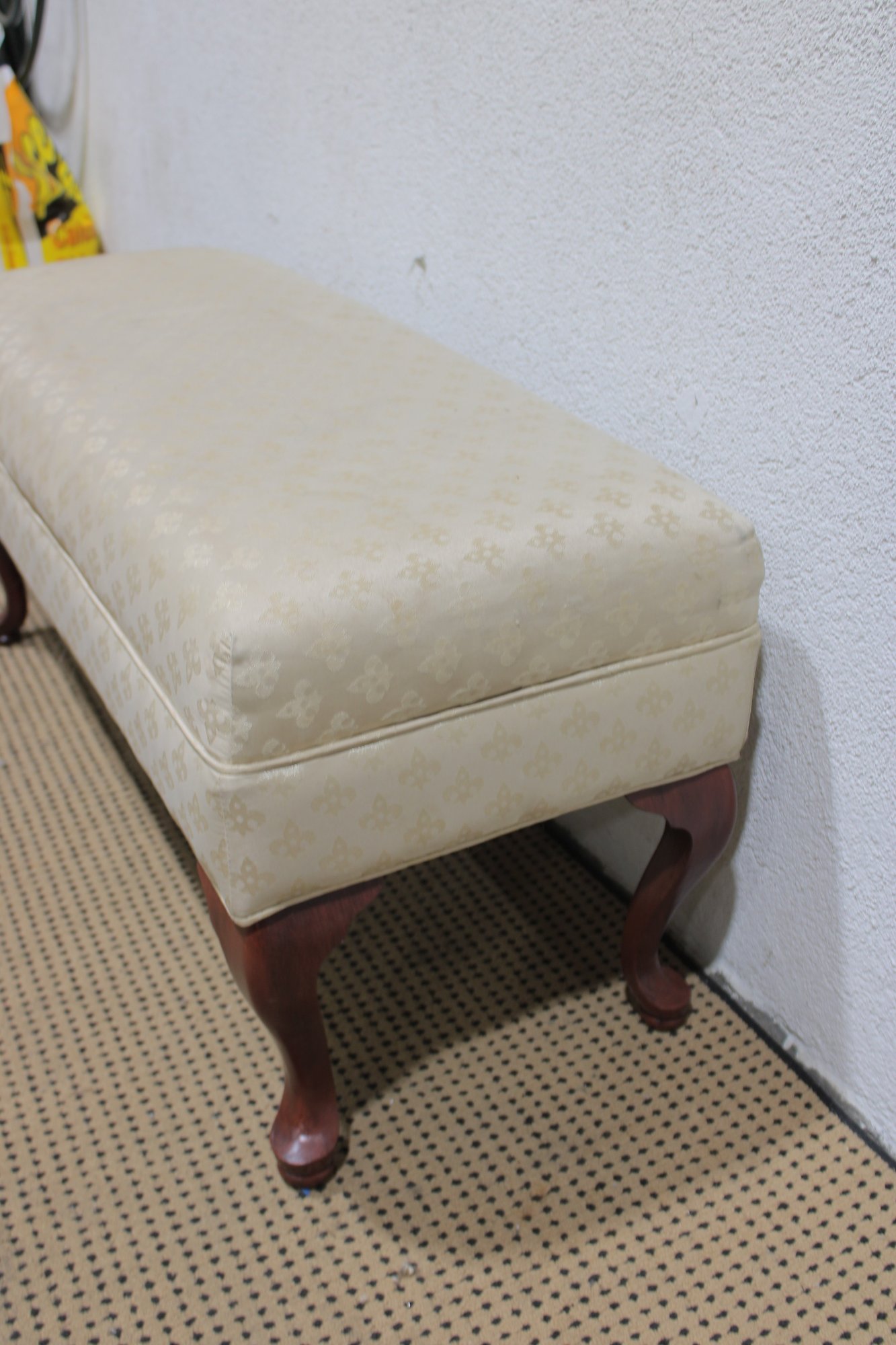 Classic upholstered bench featuring elegant cabriole legs and a warm mahogany-tone wood base. This versatile piece works beautifully at the foot of a bed, in an entryway, hallway, or as additional seating in a living space.