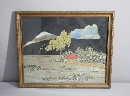 Set within an ornate gold-toned frame that complements its vintage charm, this piece invites onlookers into a tranquil landscape marked by a majestic snow-capped mountain and a willow tree, gracefully swaying over a serene lake. A quaint pagoda, tucked amidst textured waves and rolling hills, adds to the enchantment.