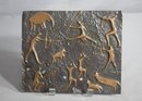 The composition features stylized human figures engaging with various animals in a dance of survival and tradition, capturing the essence of ancient storytelling through contemporary craftsmanship. Each figure, etched into the copper with precision, is brought to life against the rugged backdrop, giving the impression of age-old cave paintings.
