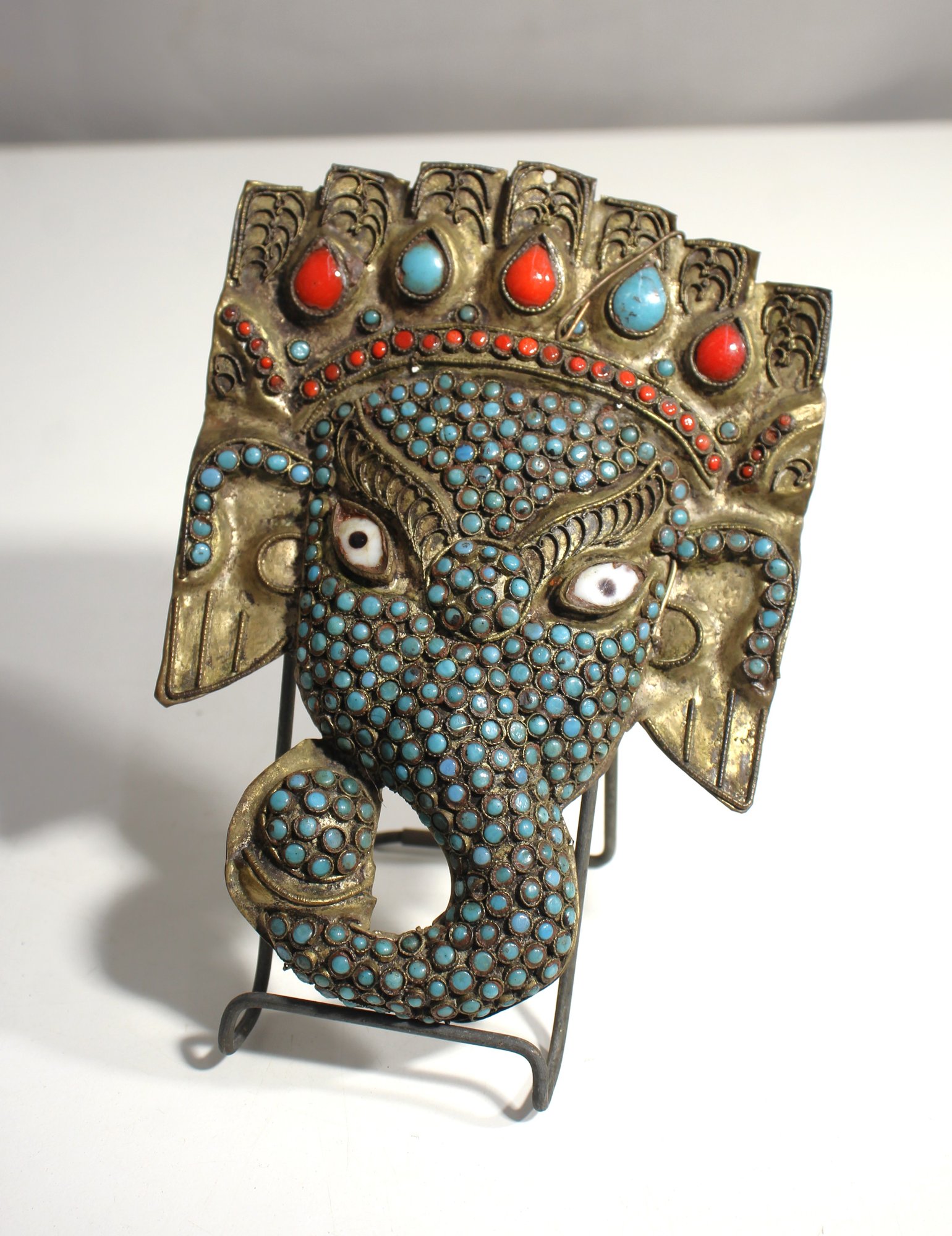 This stunning Ganesha wall mask is an intricately crafted representation of the revered Hindu deity, symbolizing wisdom, prosperity, and protection. The mask is adorned with a rich array of turquoise-colored beads and accented with vibrant red and blue stones, creating a striking and detailed appearance. The crown features elaborate embellishments, adding depth and character to this impressive piece.